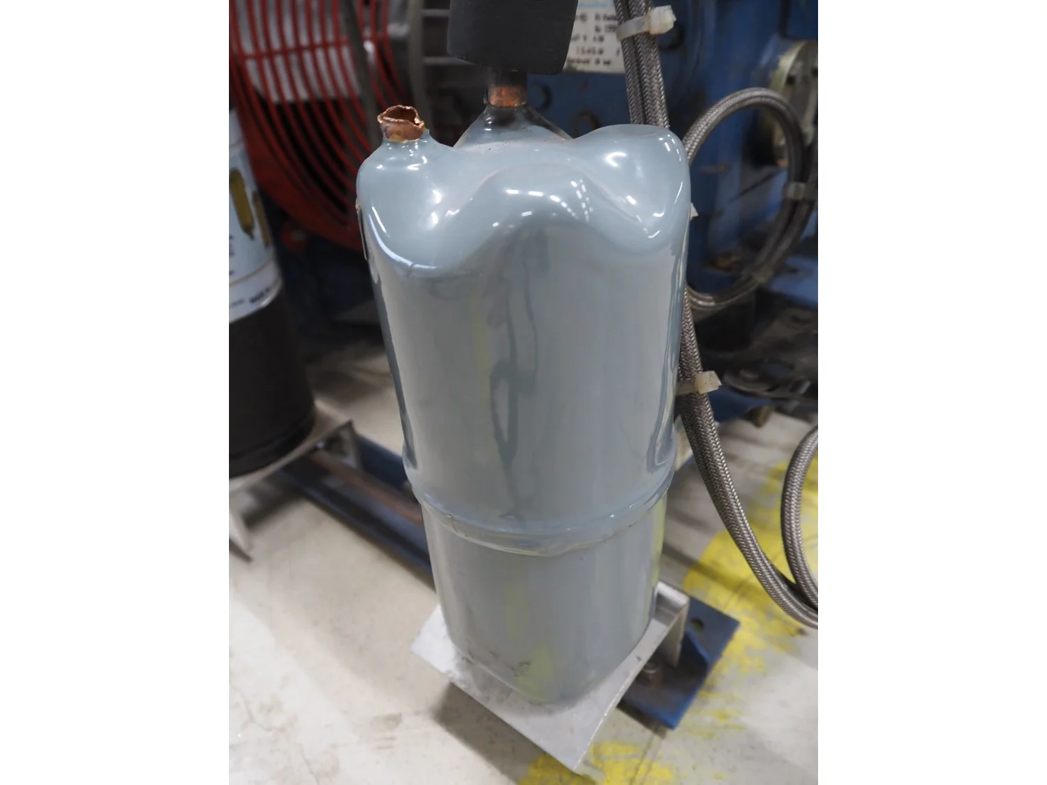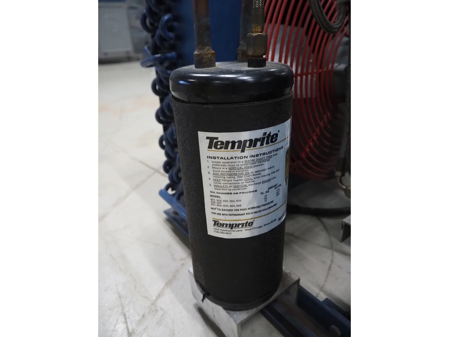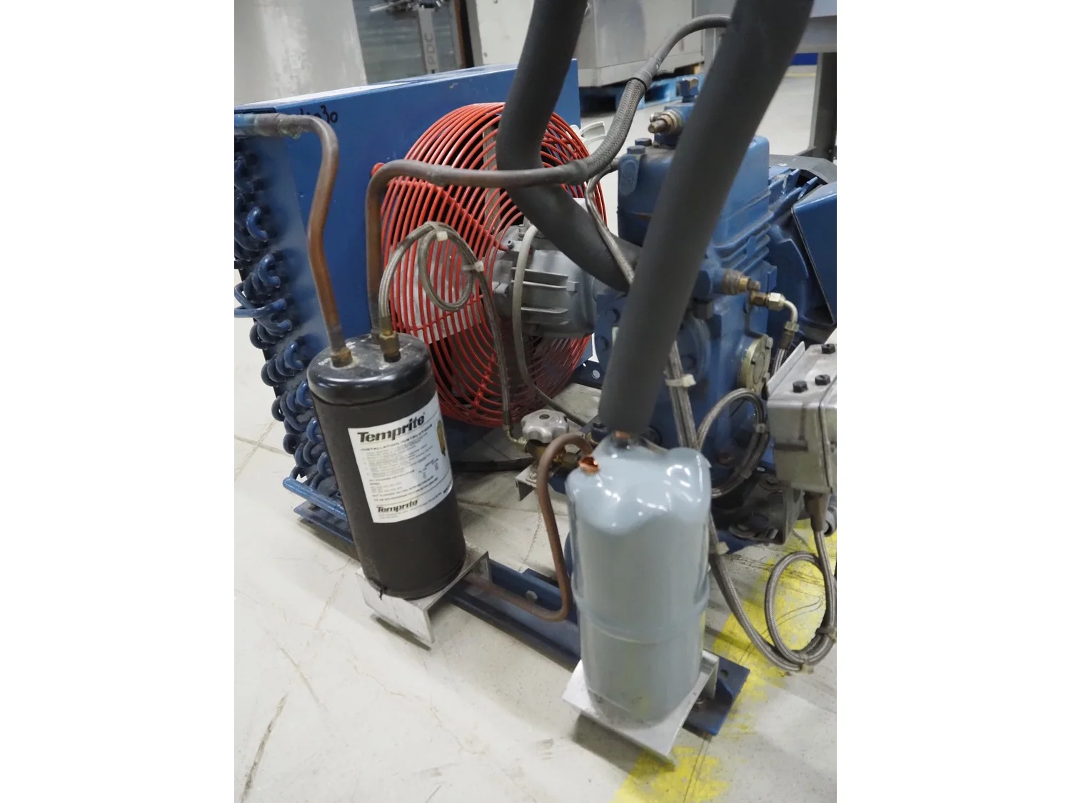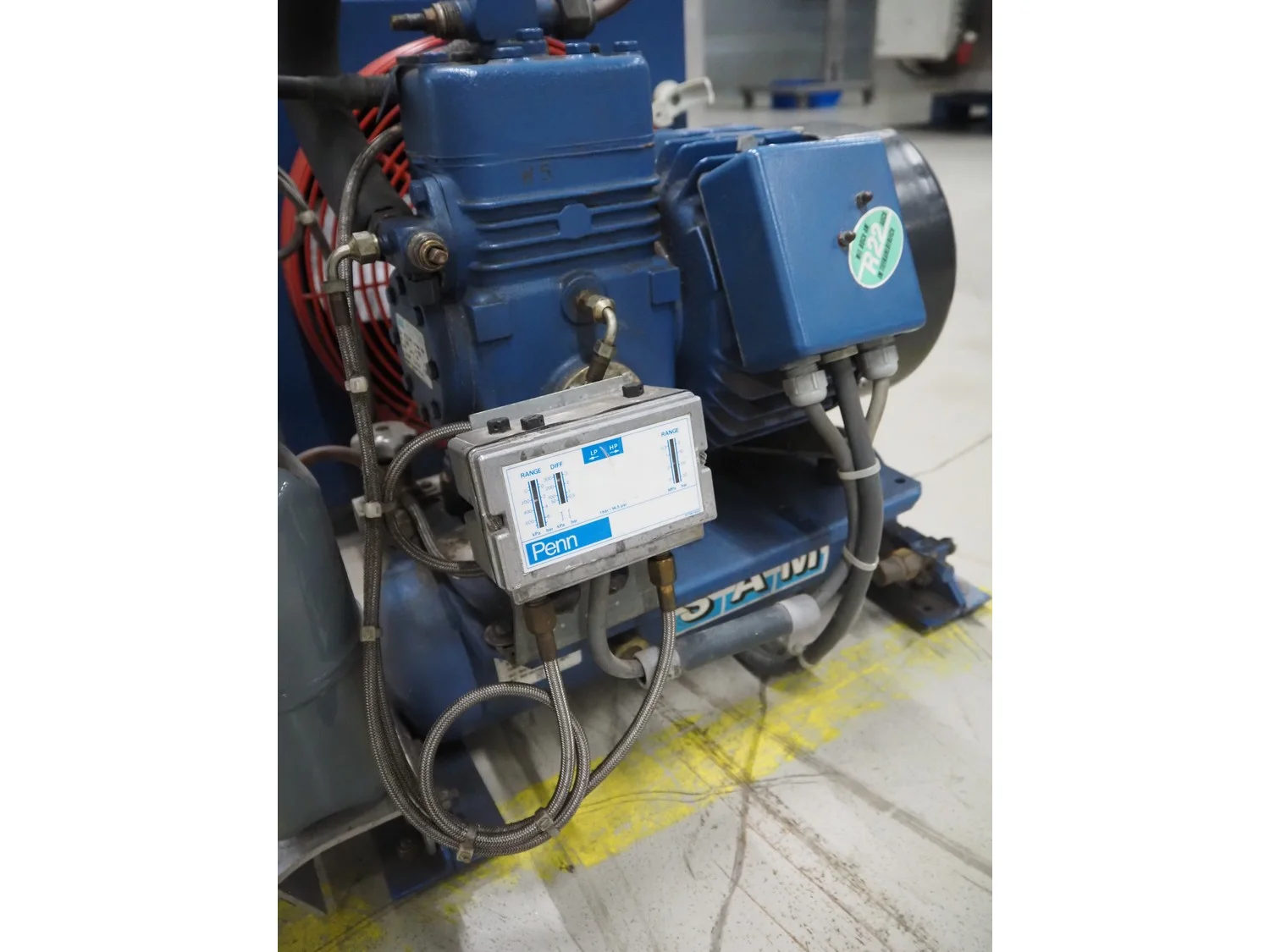 Bock condensing unit with cooling compressor, type: AM2/58-4S, number: W24452, year of construction: 1990, 220/380 V, 50 Hz, 5.4/3.1 A, capacity: 4.93 m³ per hour, dimensions: 650 mm x 550 mm x 630 mm.