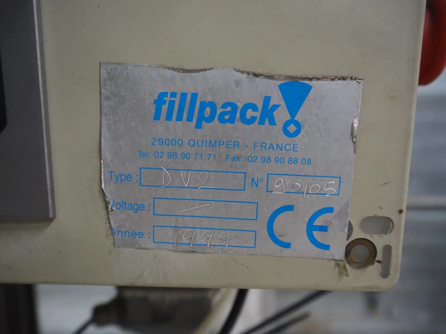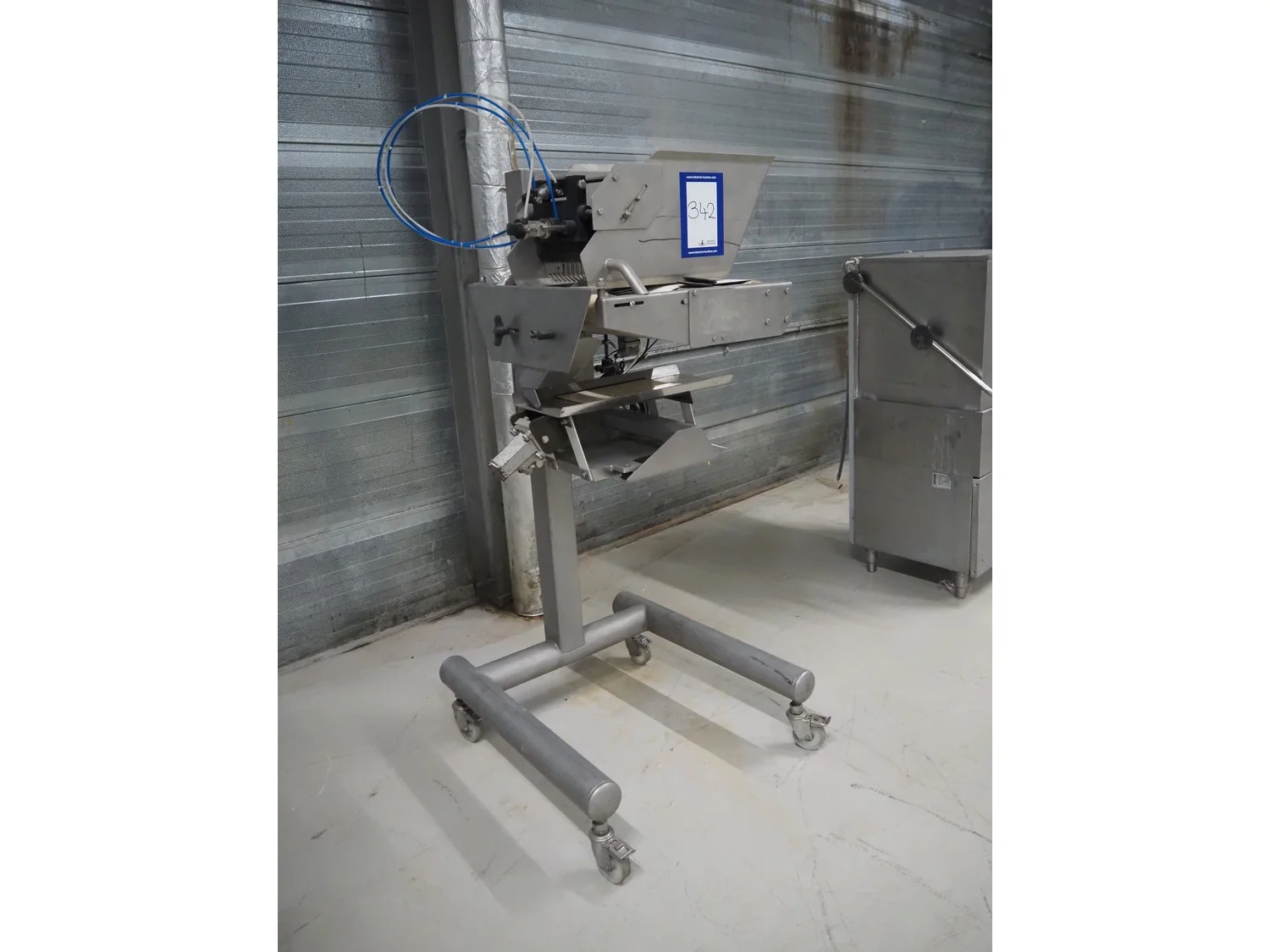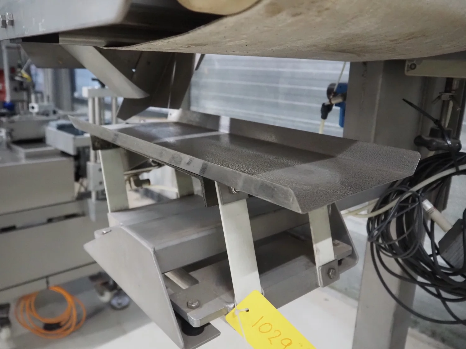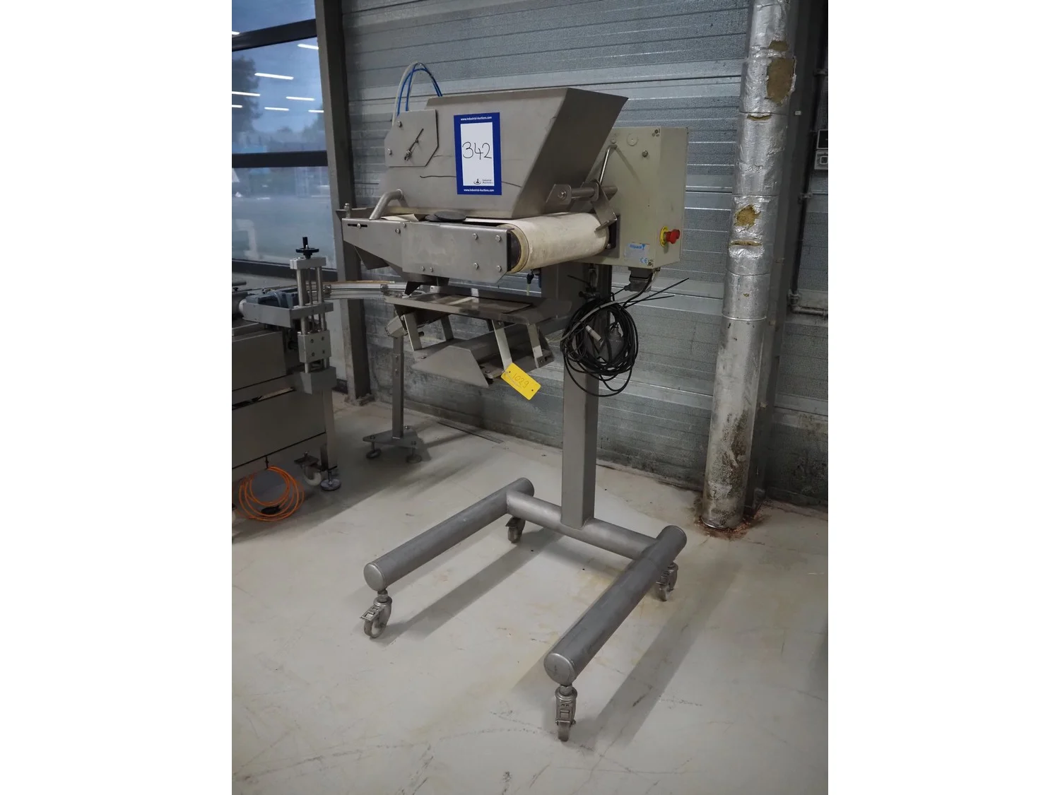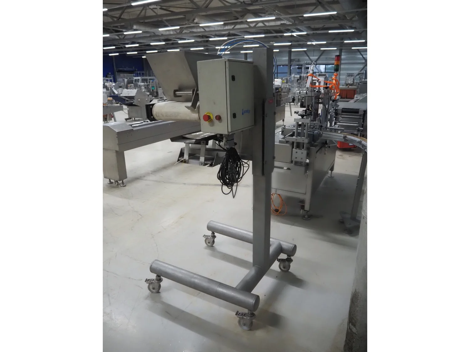 Fillpack mobile infeed hopper, type: DV2, number: 90105, year of construction: 1999, plastic belt, belt width: 680 mm, gutter width: 210 mm, total dimensions: 840 mm x 900 mm x 1800 mm.
