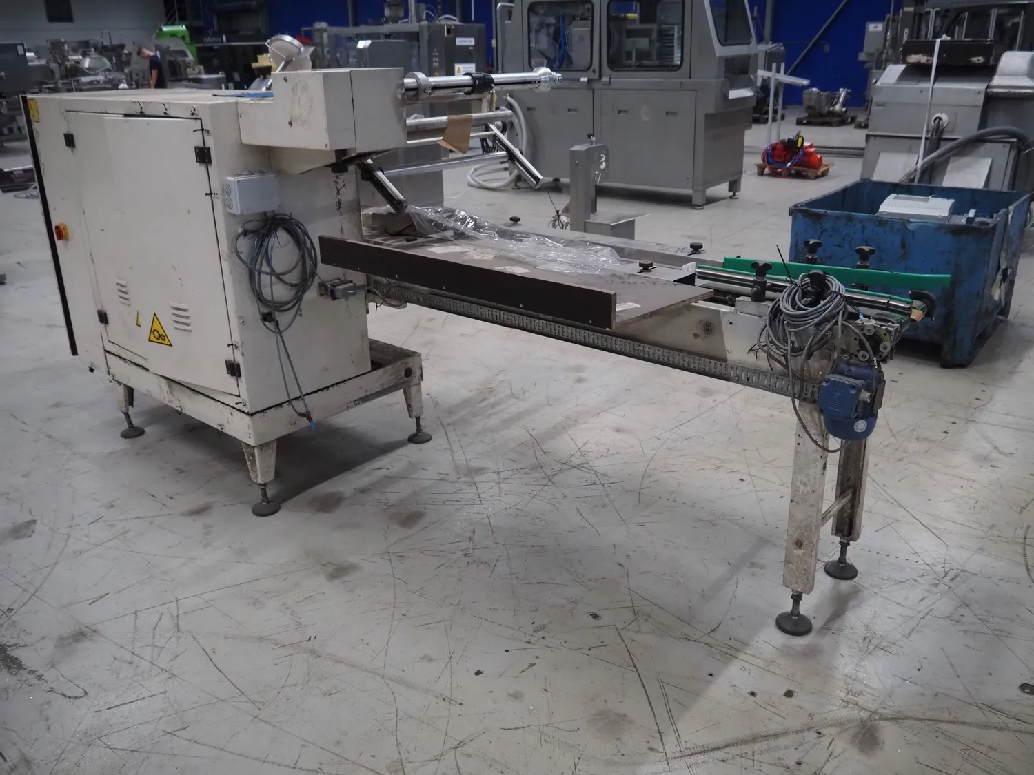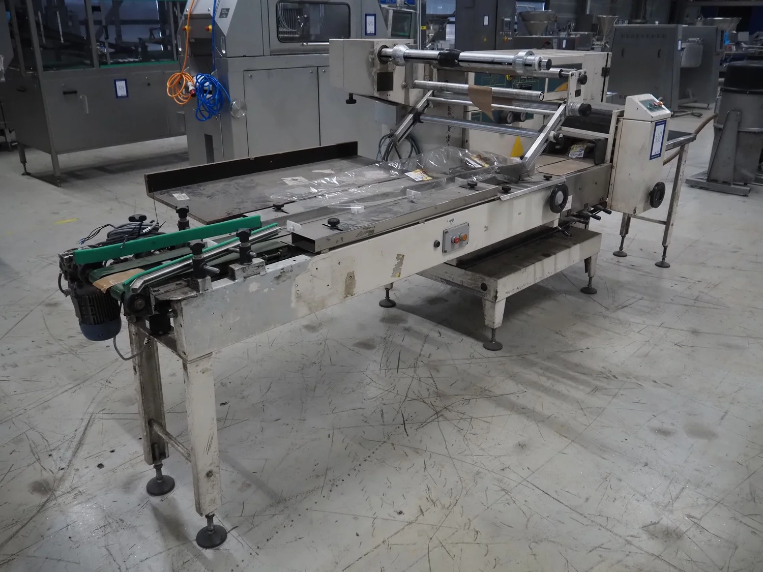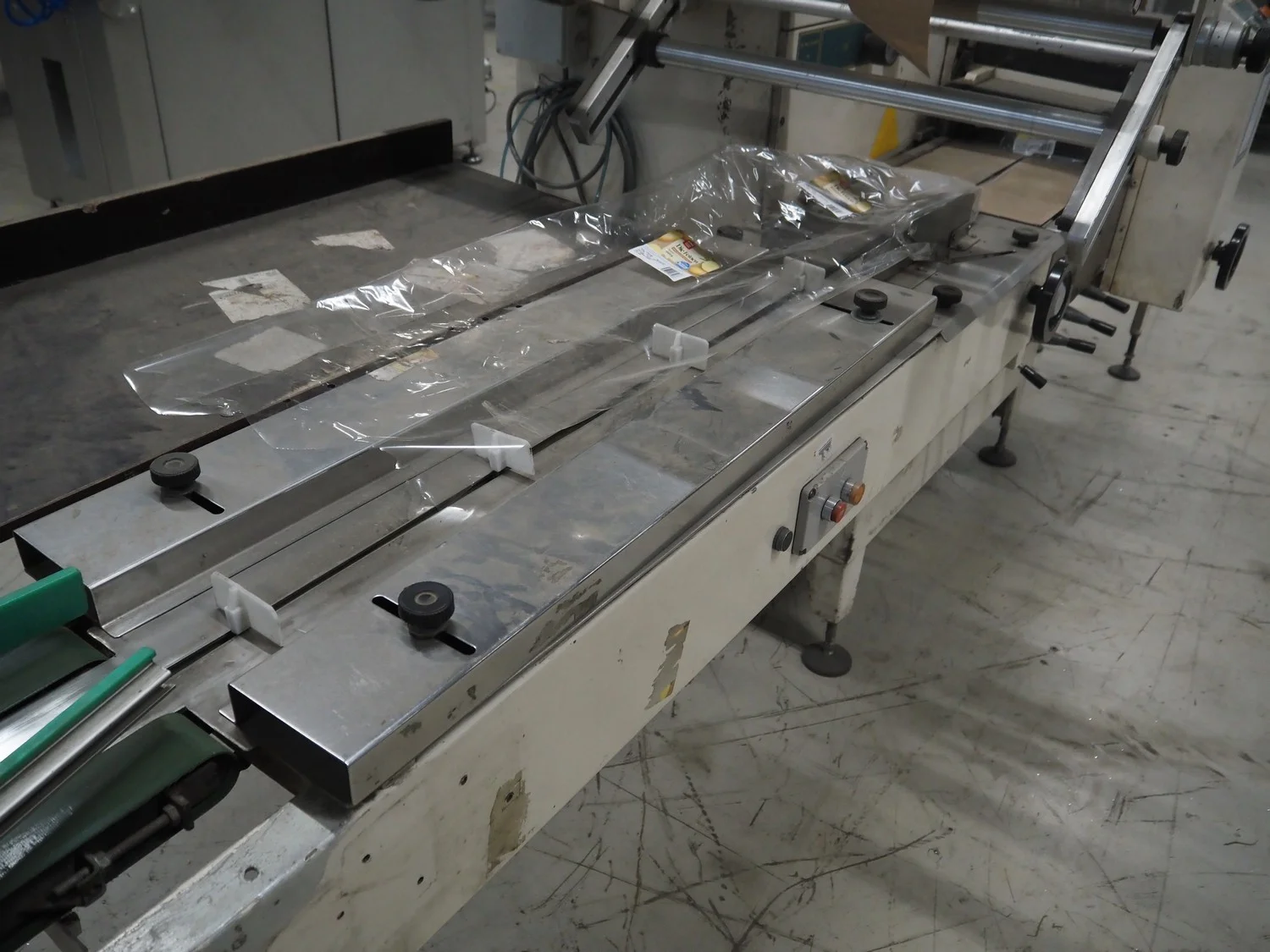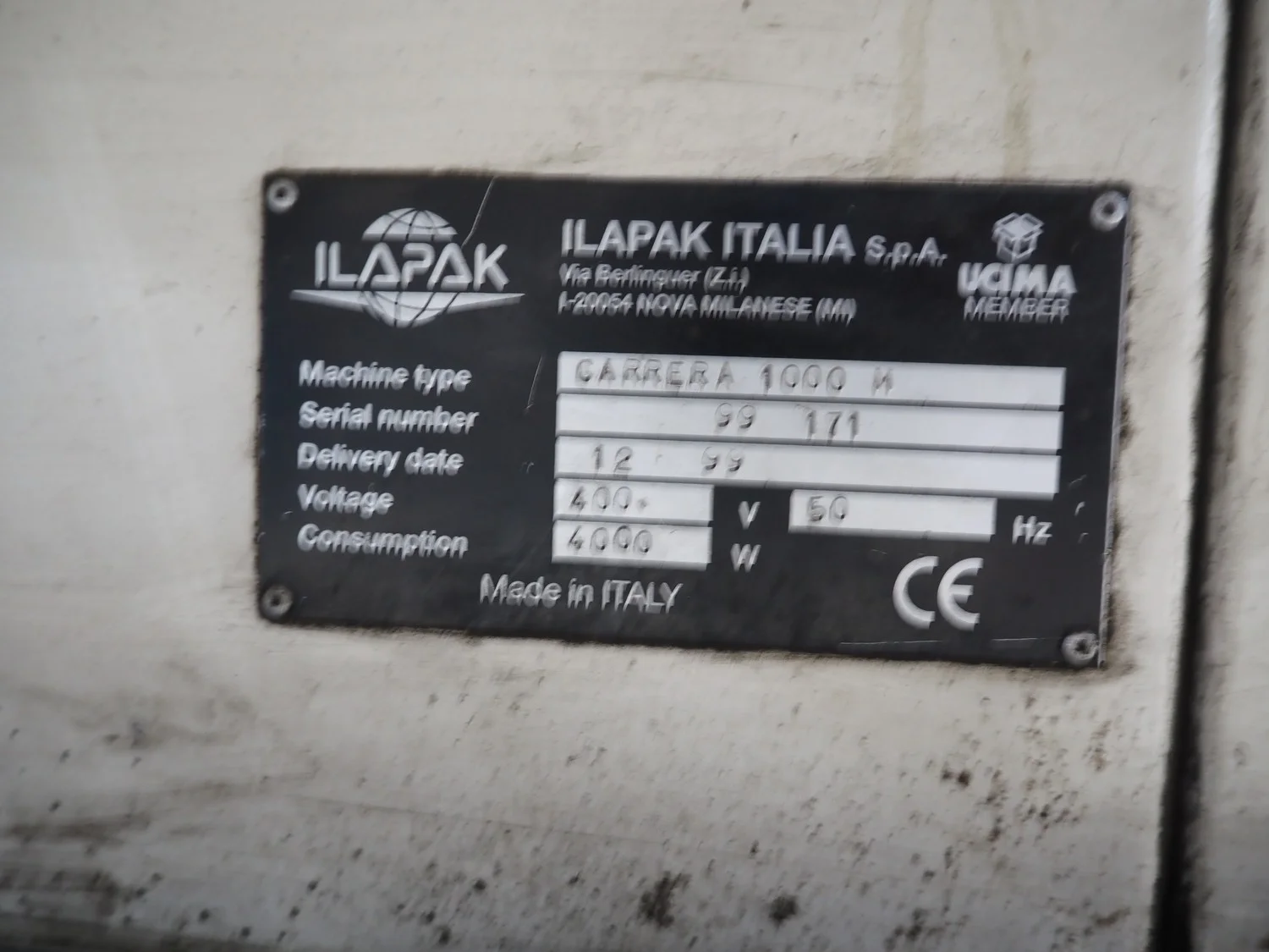 Ilapak flowpacker, model: Carrera 1000 M, serial number: 99 171, 400 V, 3 Ph, 50 Hz, 8 A, plastic belts, belt width: (2x) 60 mm, (1x) 250 mm, distance between dividers: 300 mm, seal length: 280 mm, total dimensions: 4050 mm x 1300 mm x 1550 mm.