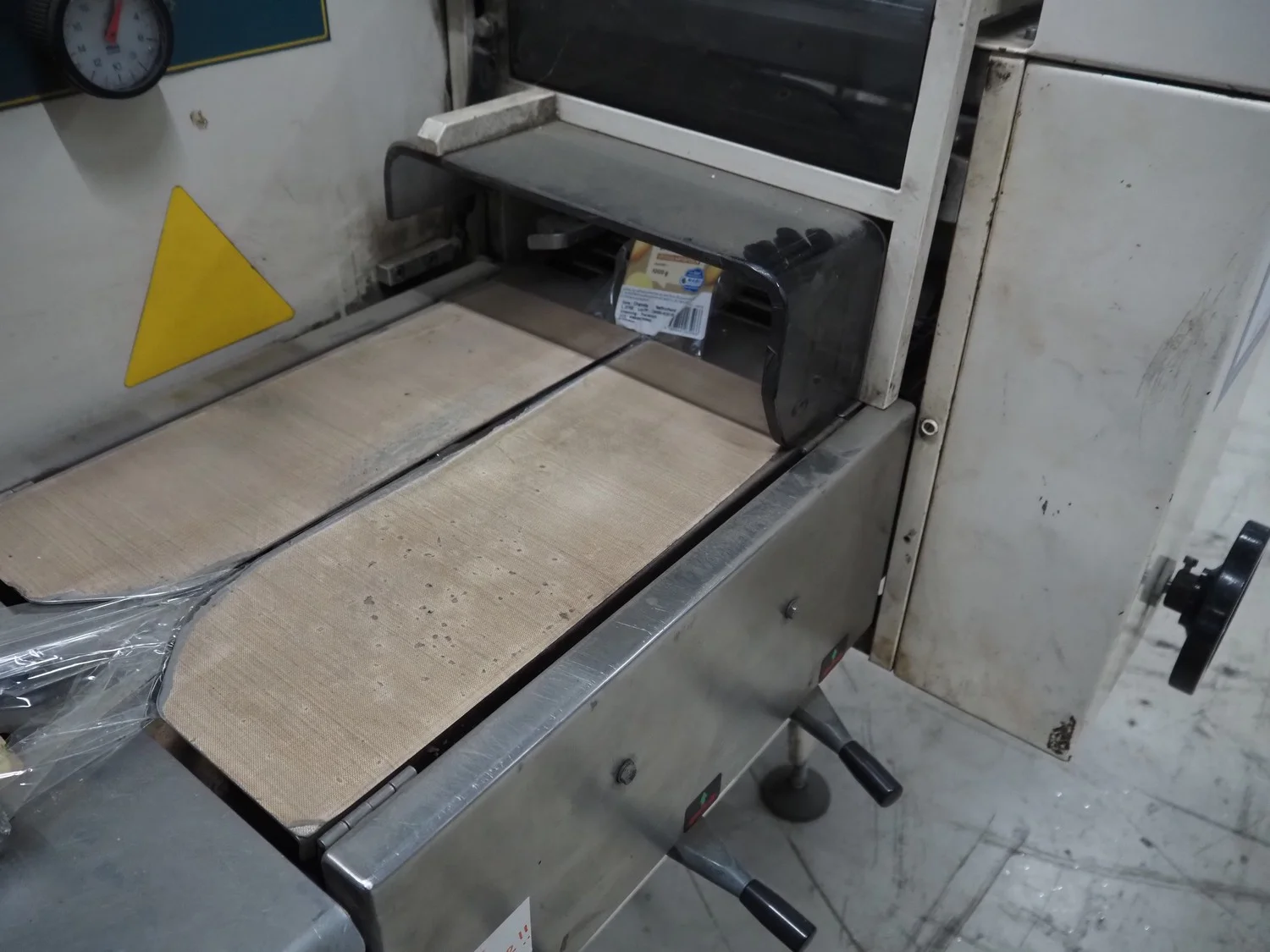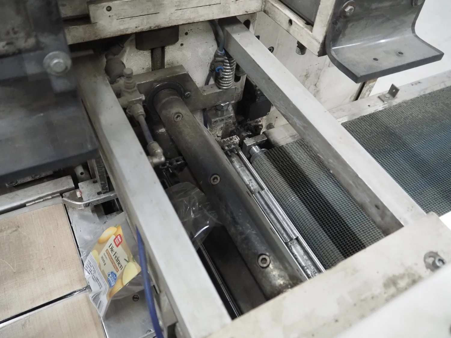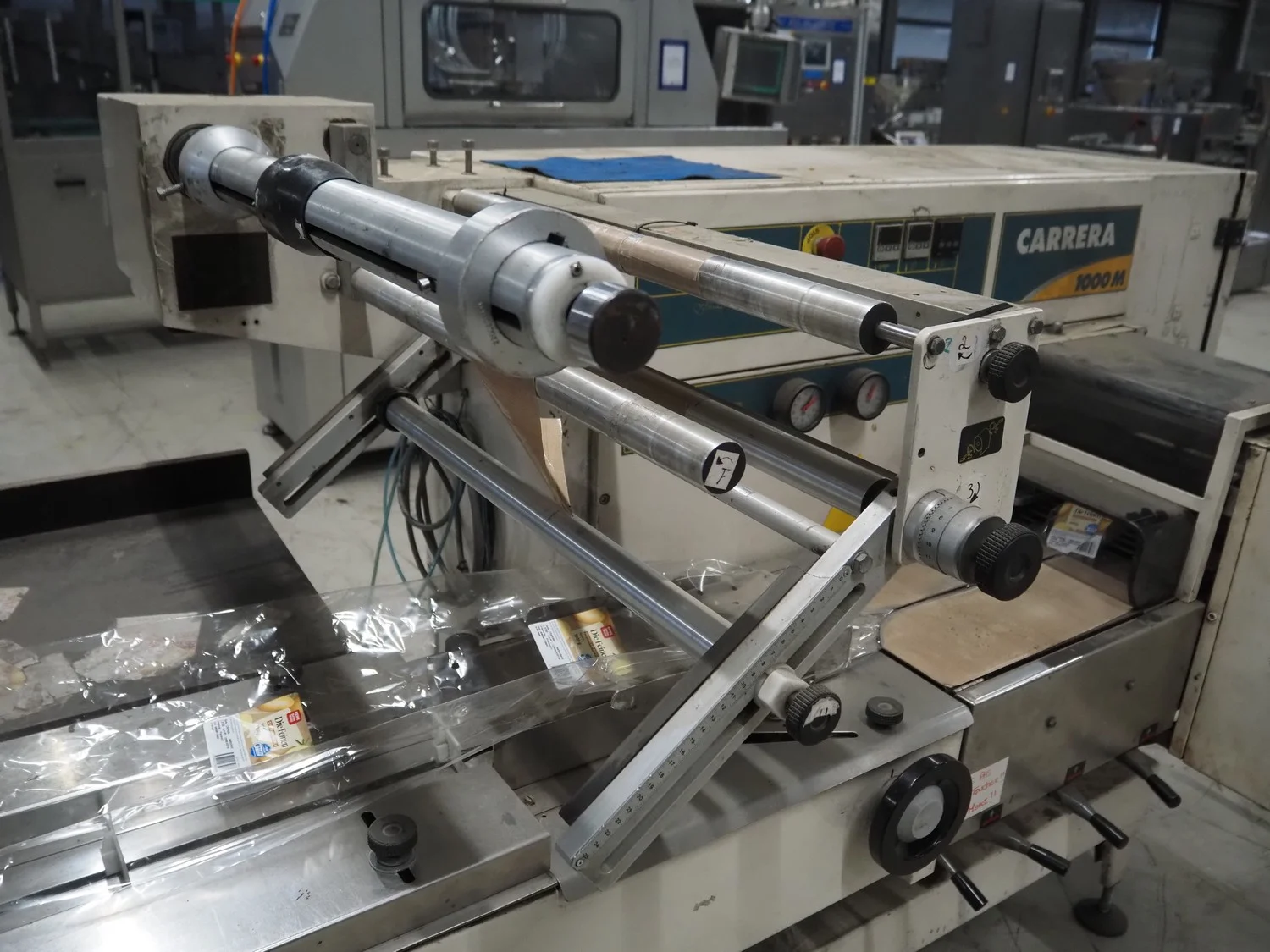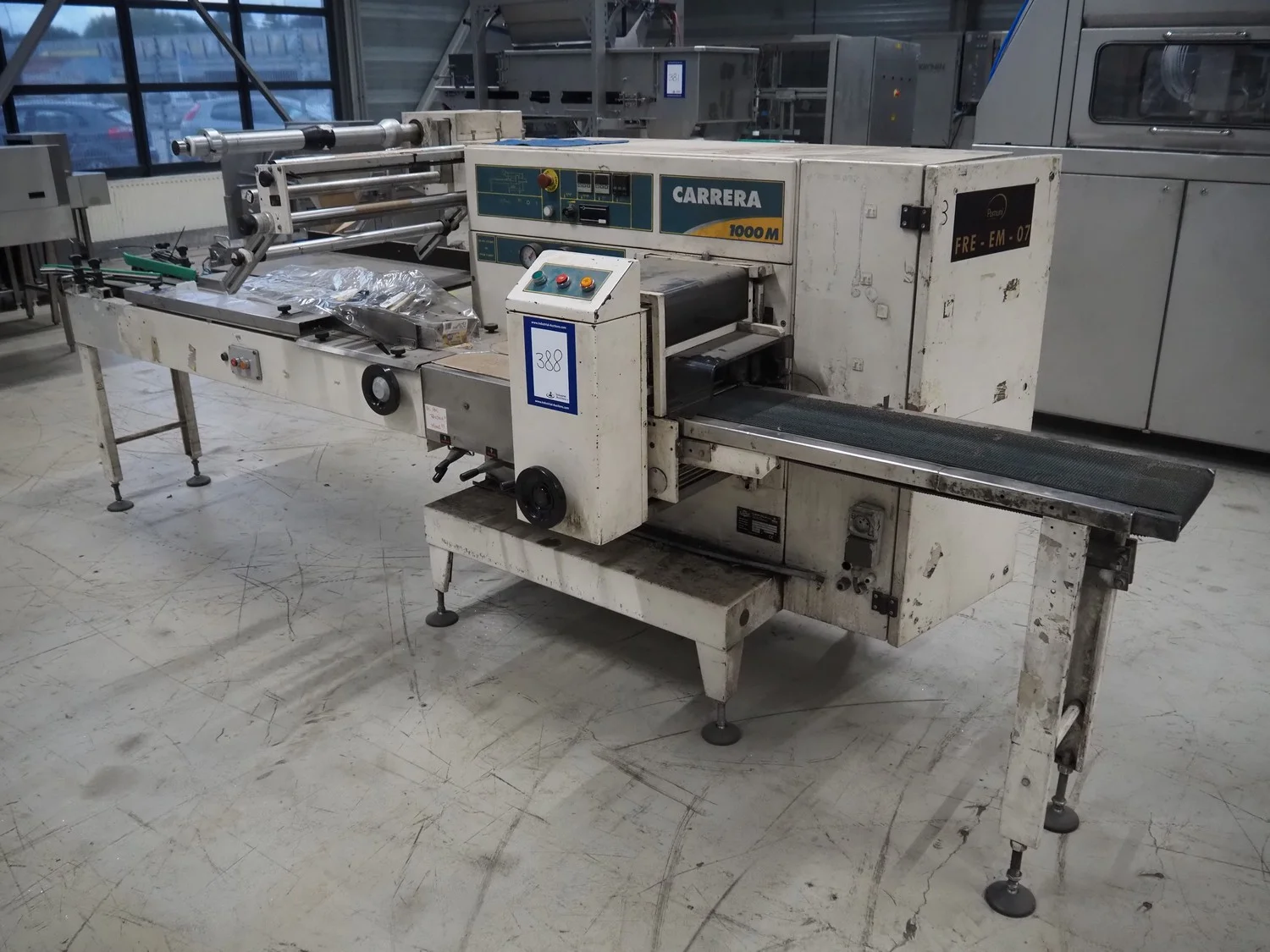 Ilapak flowpacker, model: Carrera 1000 M, serial number: 99 171, 400 V, 3 Ph, 50 Hz, 8 A, plastic belts, belt width: (2x) 60 mm, (1x) 250 mm, distance between dividers: 300 mm, seal length: 280 mm, total dimensions: 4050 mm x 1300 mm x 1550 mm.