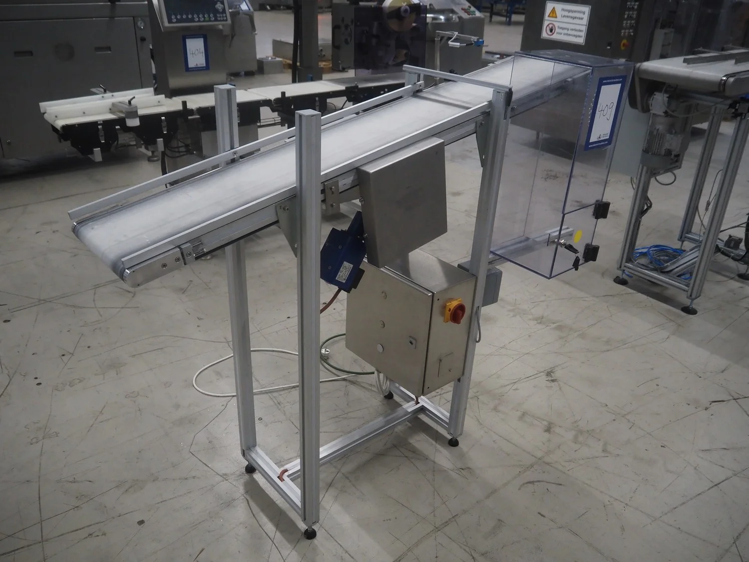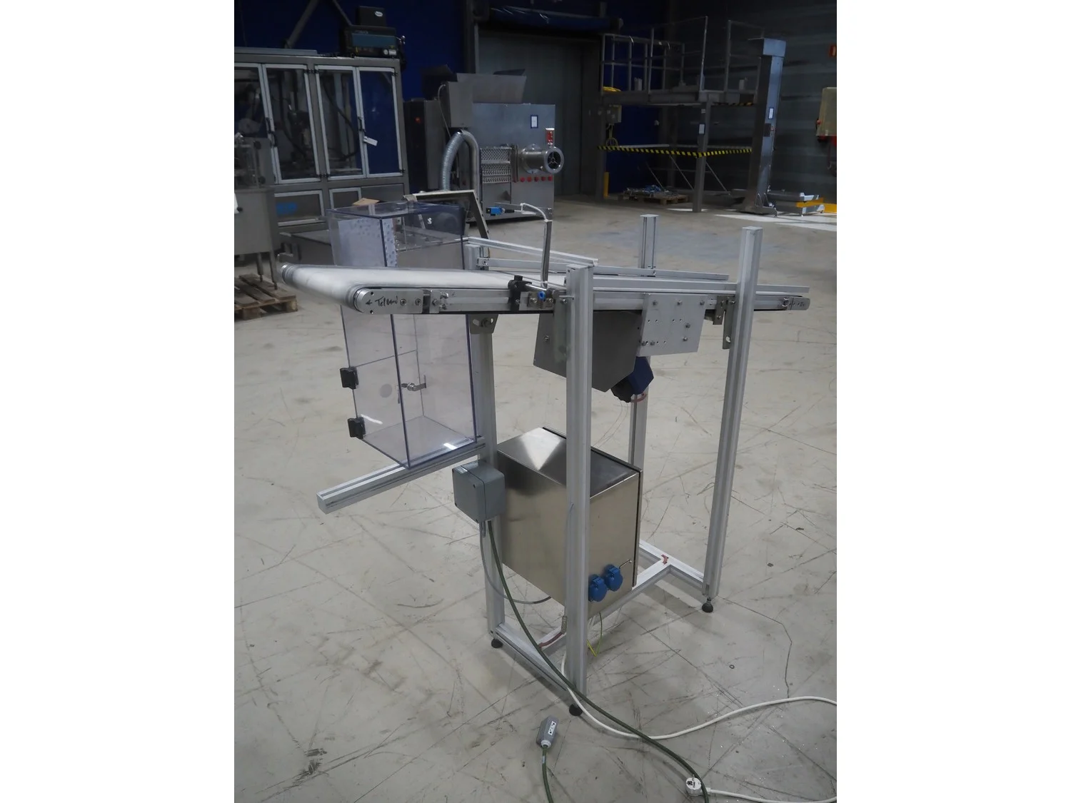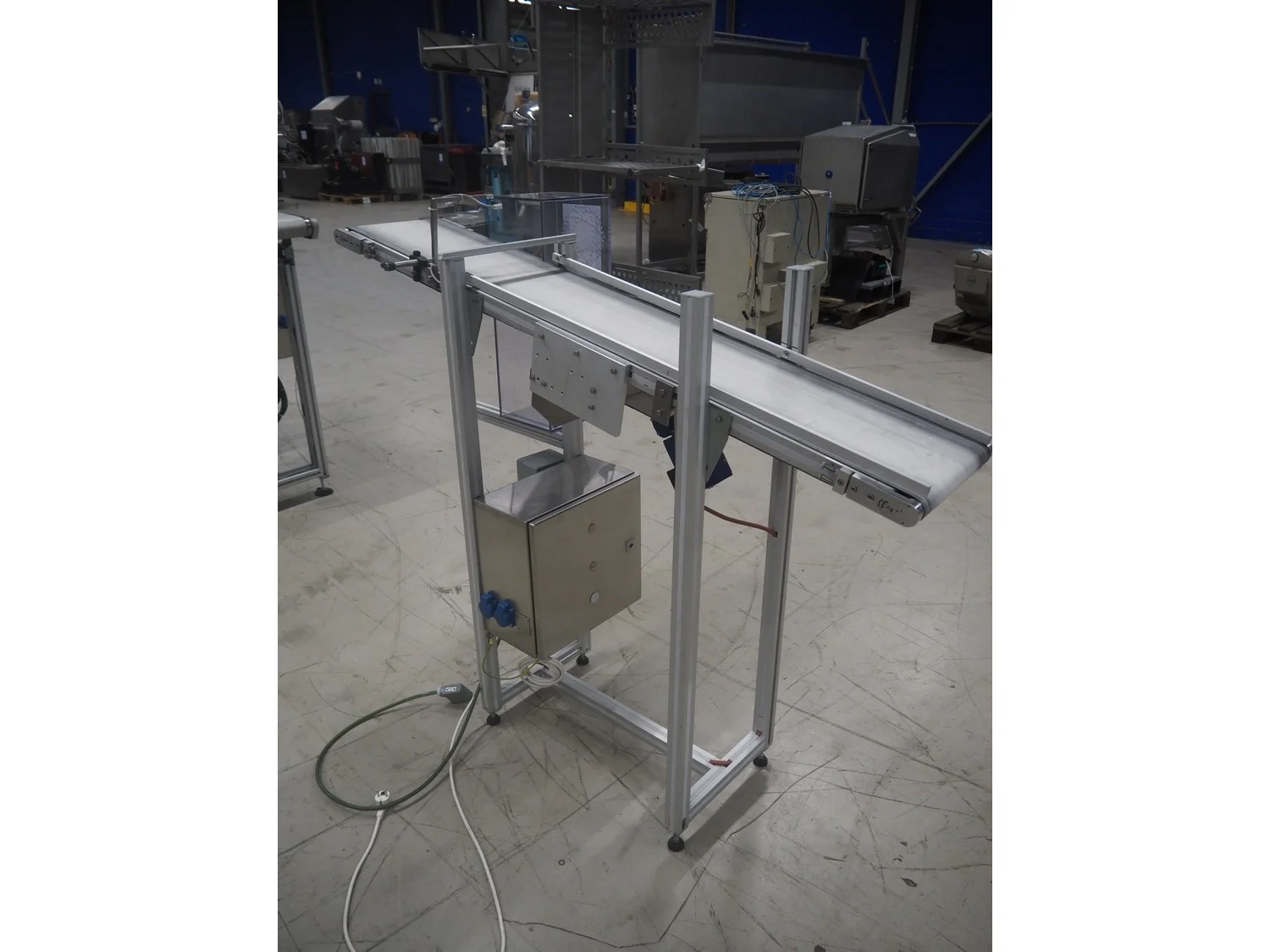 Transport belt with rejector, s/s frame, plastic belt, belt width: 285 mm, total dimensions: 1600 mm x 650 mm x 1350 mm.