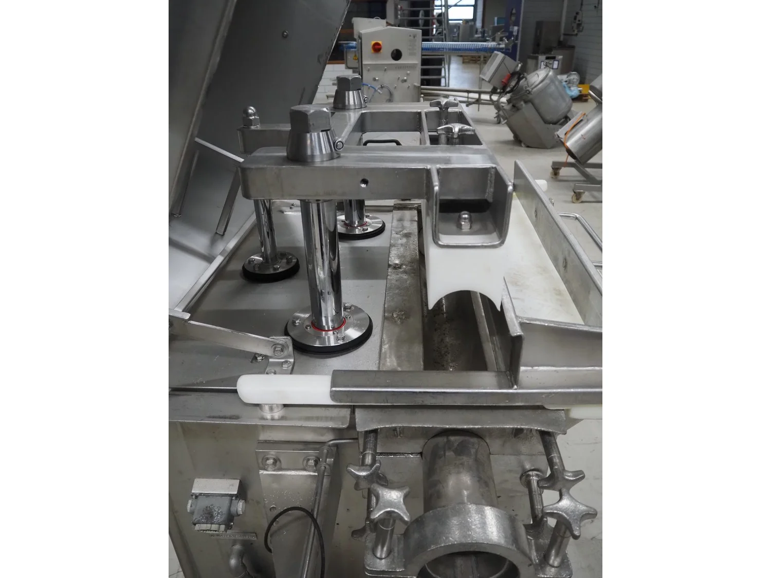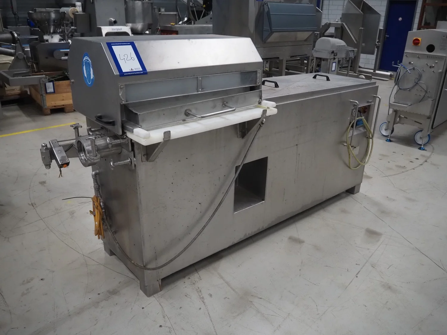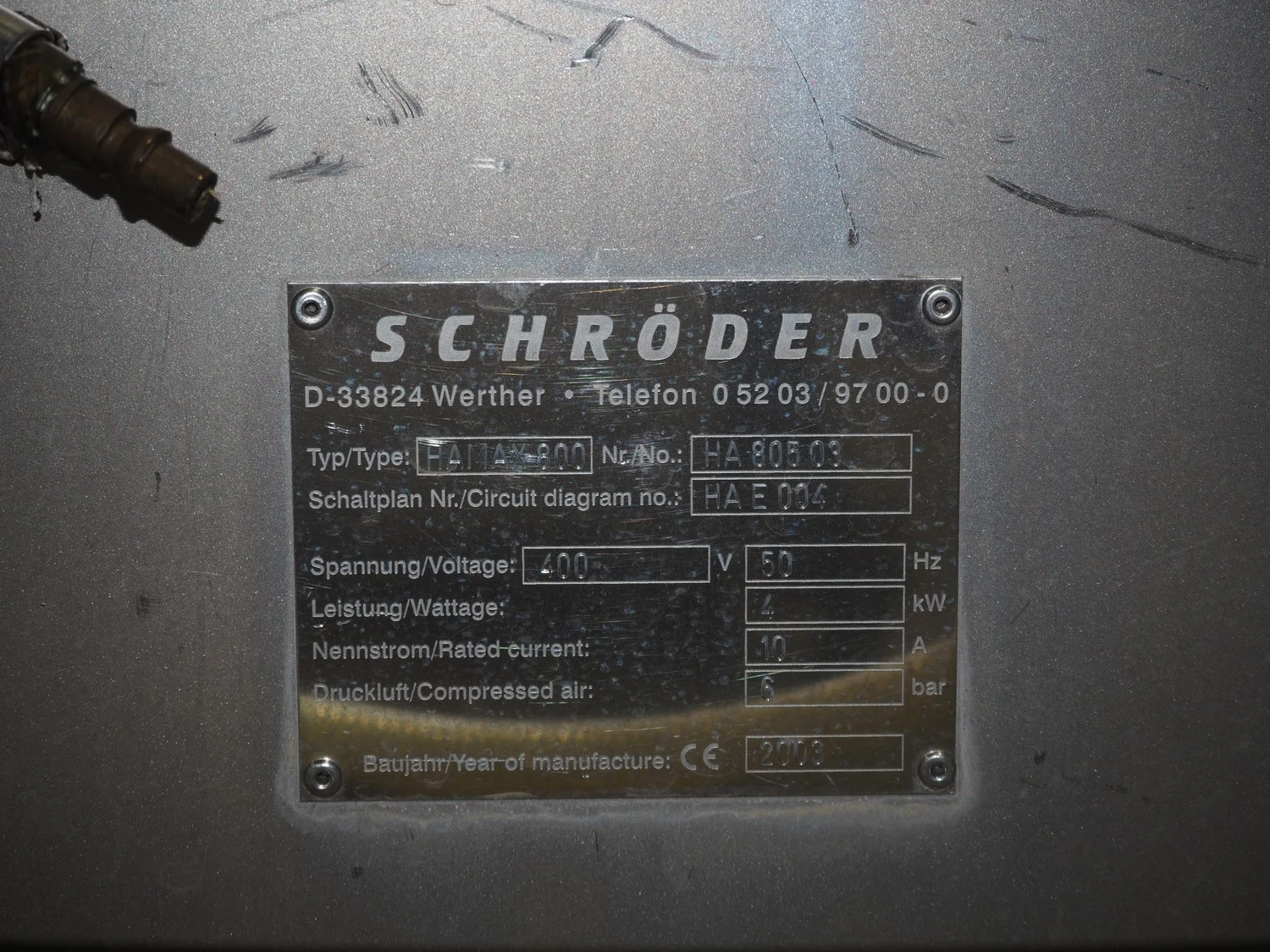 Schröder meat press, type: HAMAX 800, number: HA 805 03, year of construction: 2003, 400 V, 50 Hz, 10 A, 4 kW, pipe diameter: 95 mm, total dimensions: 2750 mm x 850 mm x 1700 mm.