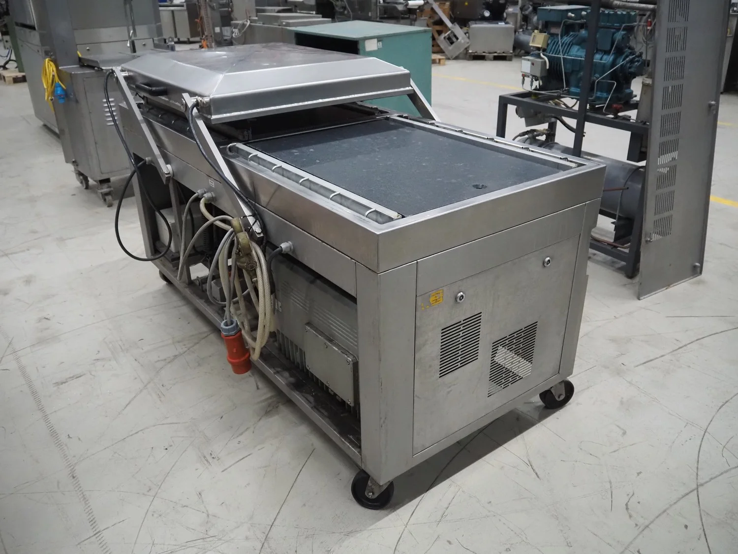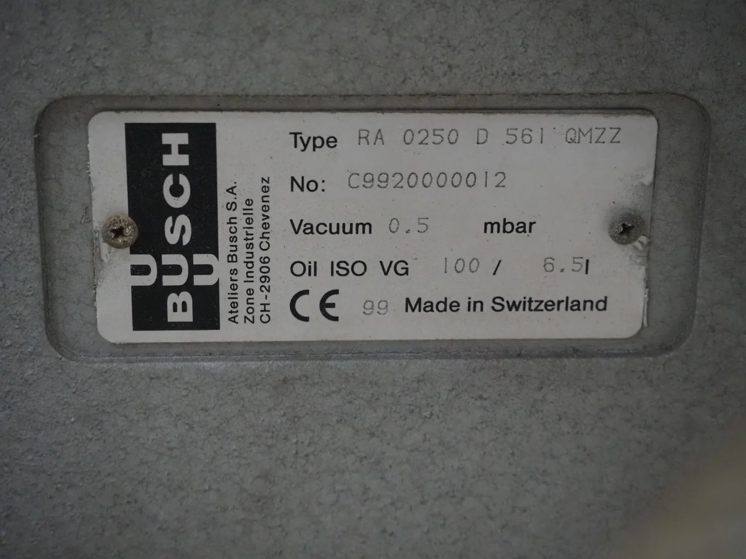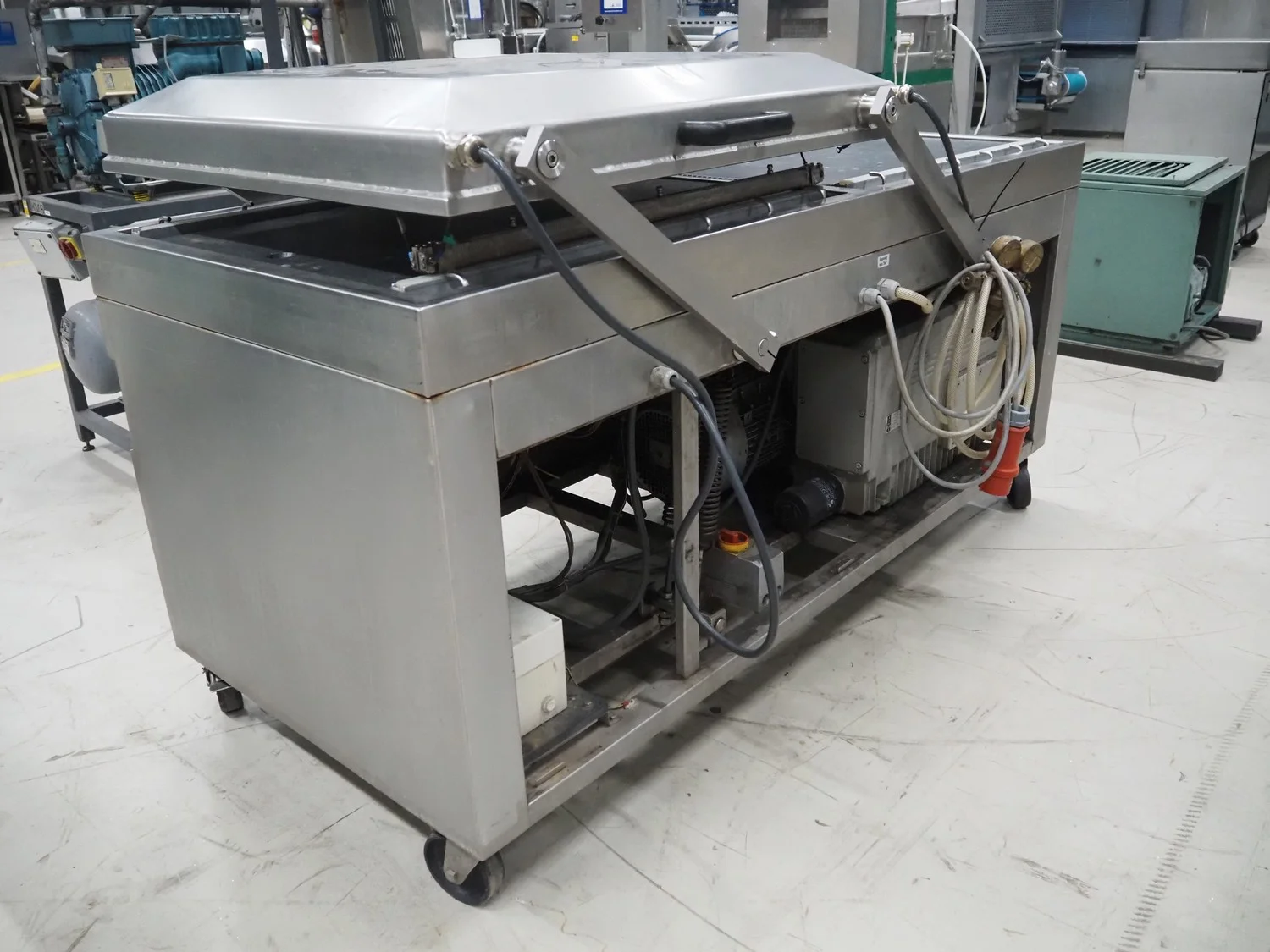 Röscherwerke GmbH mobile double chamber vacuum machine, type: VM-61/2/C, number: 6311007, year of construction: 06/99, 230/400 V, 50 Hz, 6.2 kW, weight: 640 kg, seal length: (4x) 860 mm, chamber: (2x) 880 mm x 640 mm, Busch vacuum pump, type: RA 0250 D 561 QMZZ, number: C9920000012, capacity: 250 m³ per hour, total dimensions: 1950 mm x 920 mm x 1100 mm.