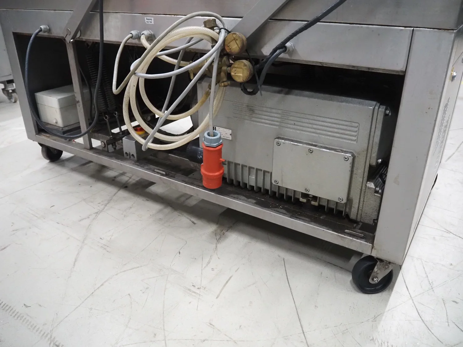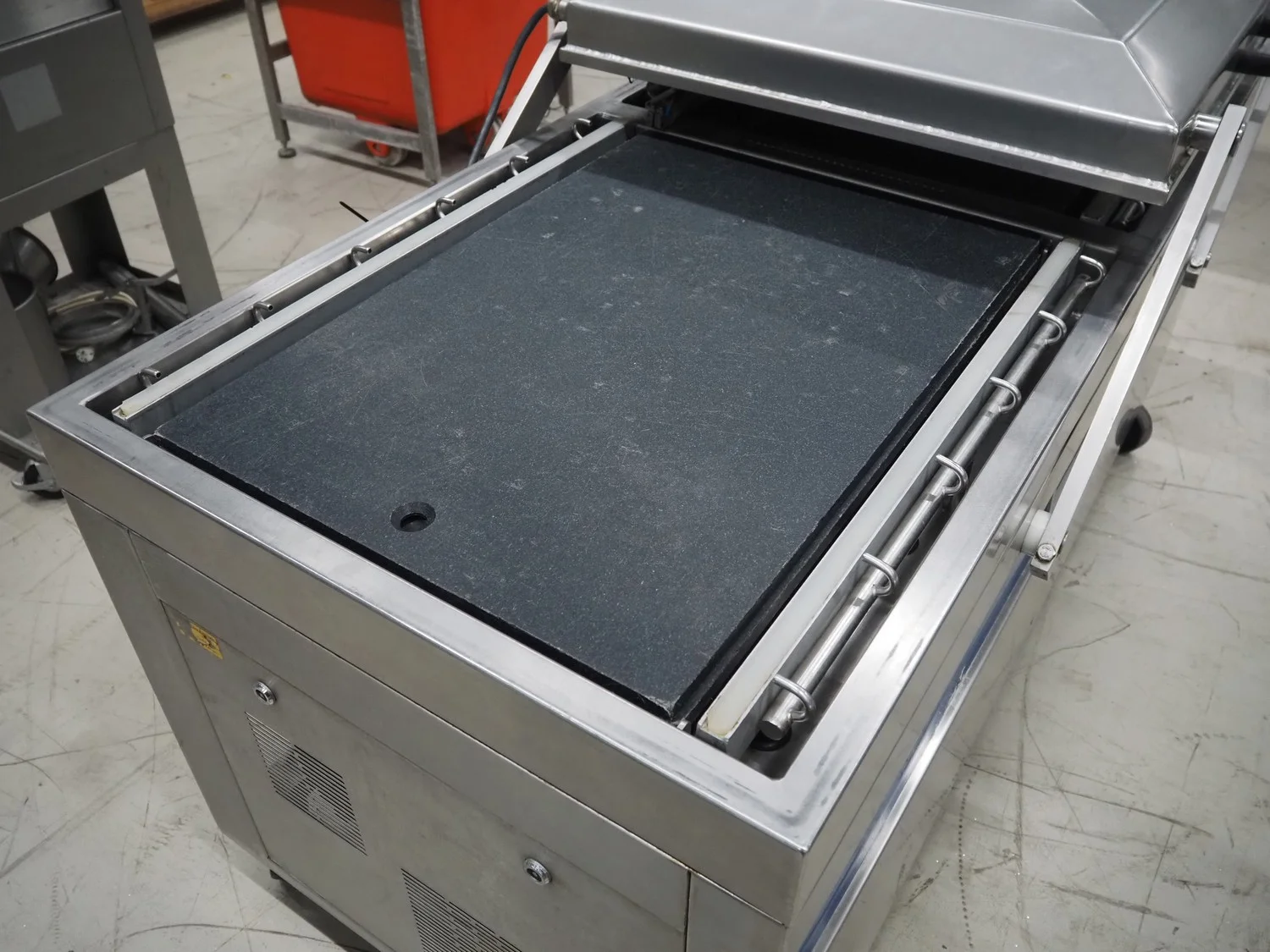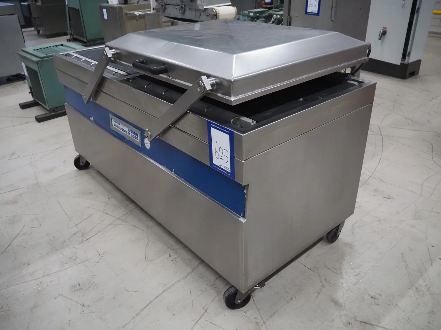 Röscherwerke GmbH mobile double chamber vacuum machine, type: VM-61/2/C, number: 6311007, year of construction: 06/99, 230/400 V, 50 Hz, 6.2 kW, weight: 640 kg, seal length: (4x) 860 mm, chamber: (2x) 880 mm x 640 mm, Busch vacuum pump, type: RA 0250 D 561 QMZZ, number: C9920000012, capacity: 250 m³ per hour, total dimensions: 1950 mm x 920 mm x 1100 mm.