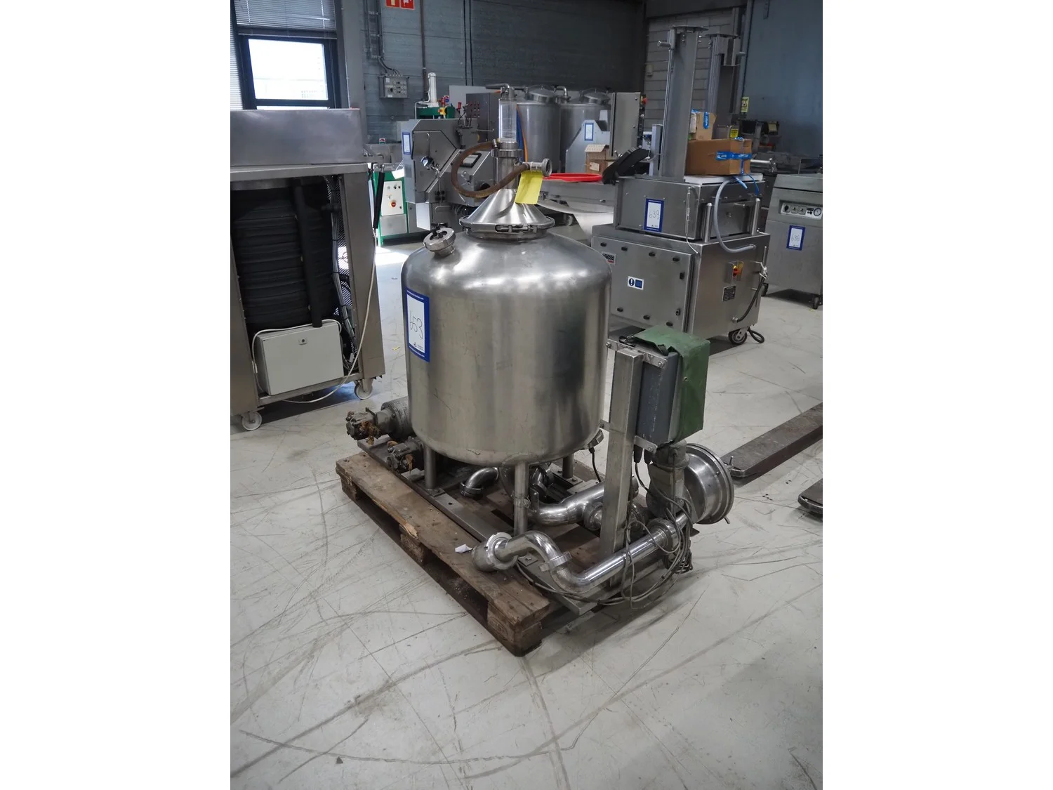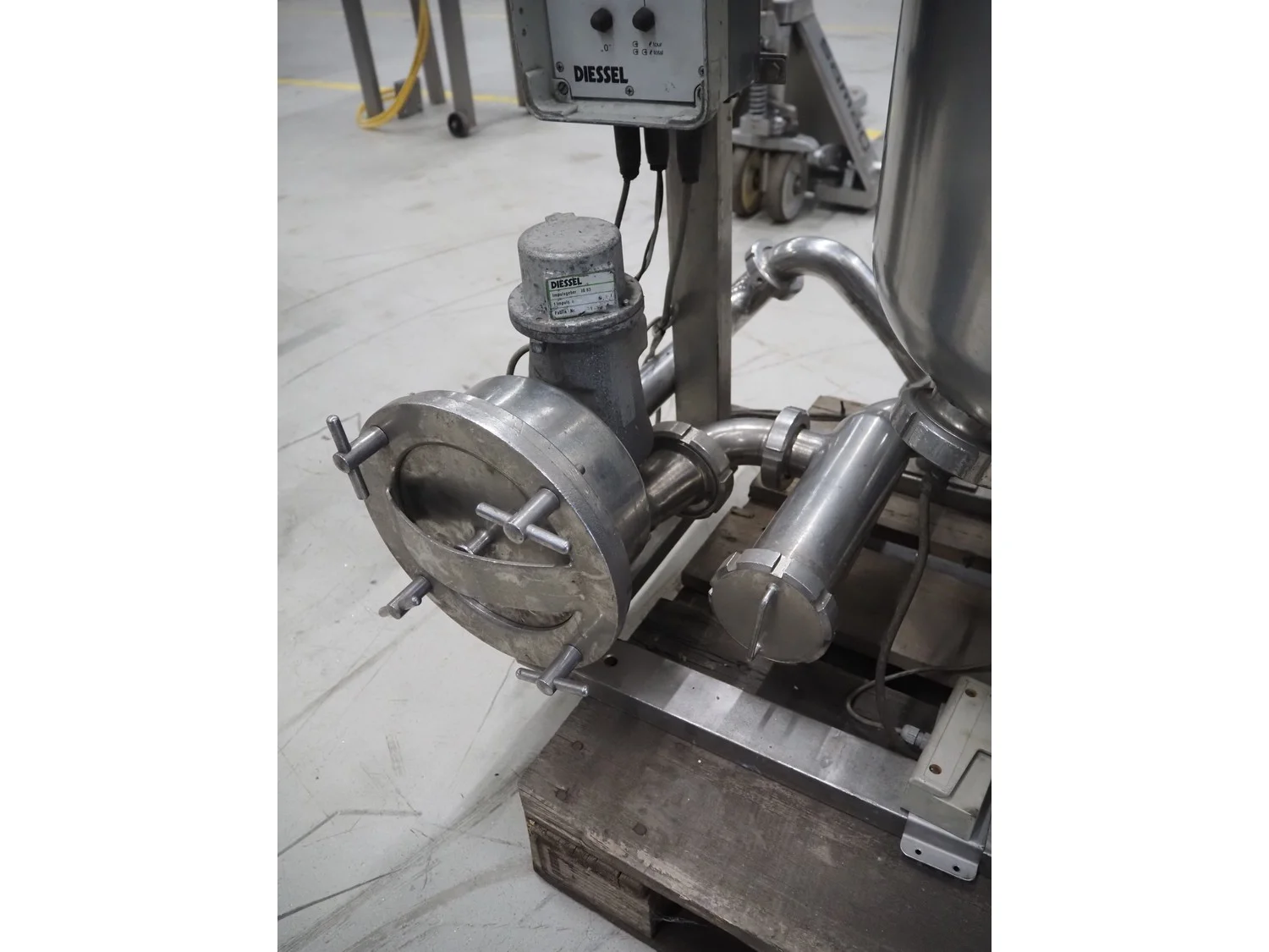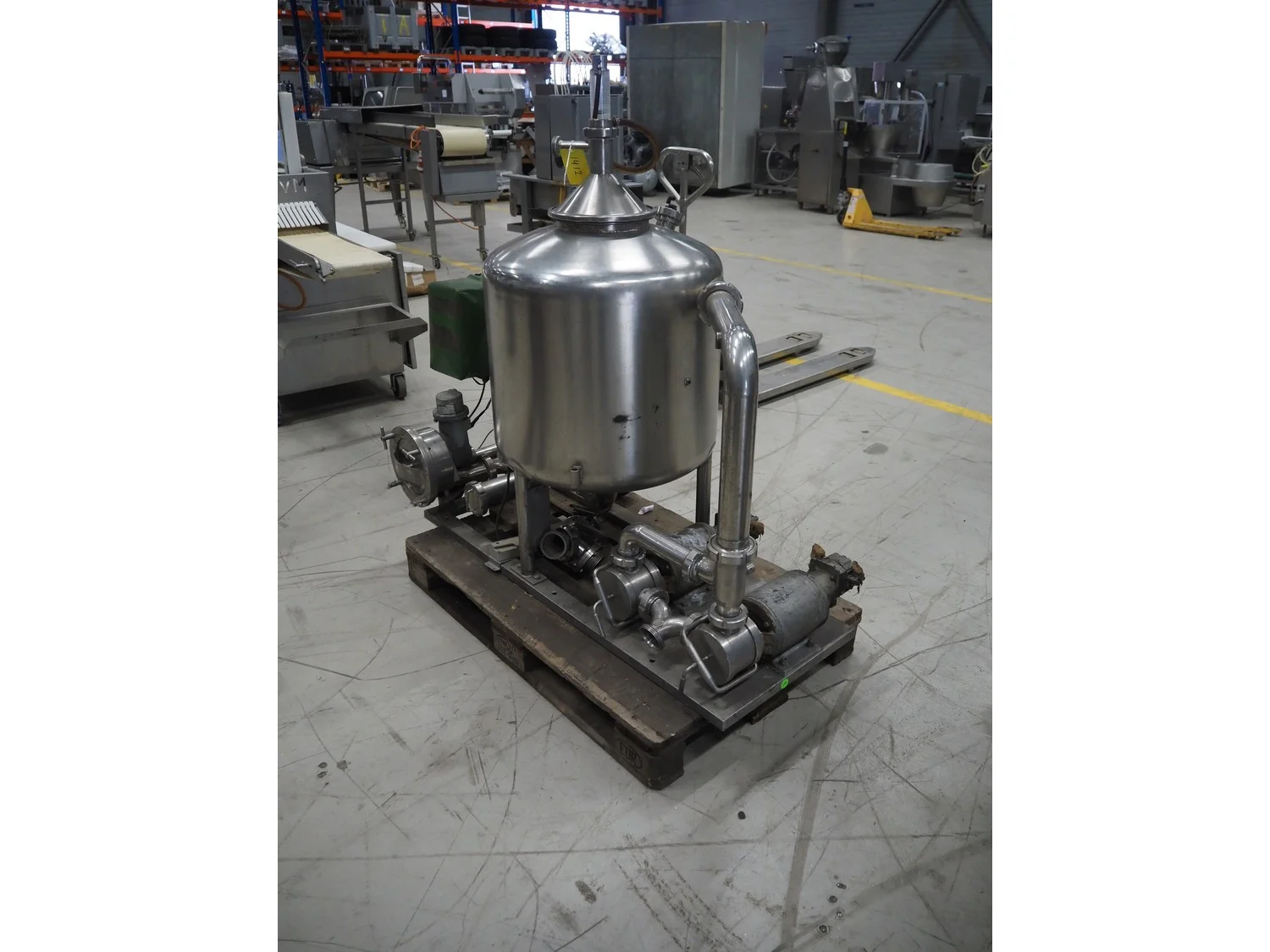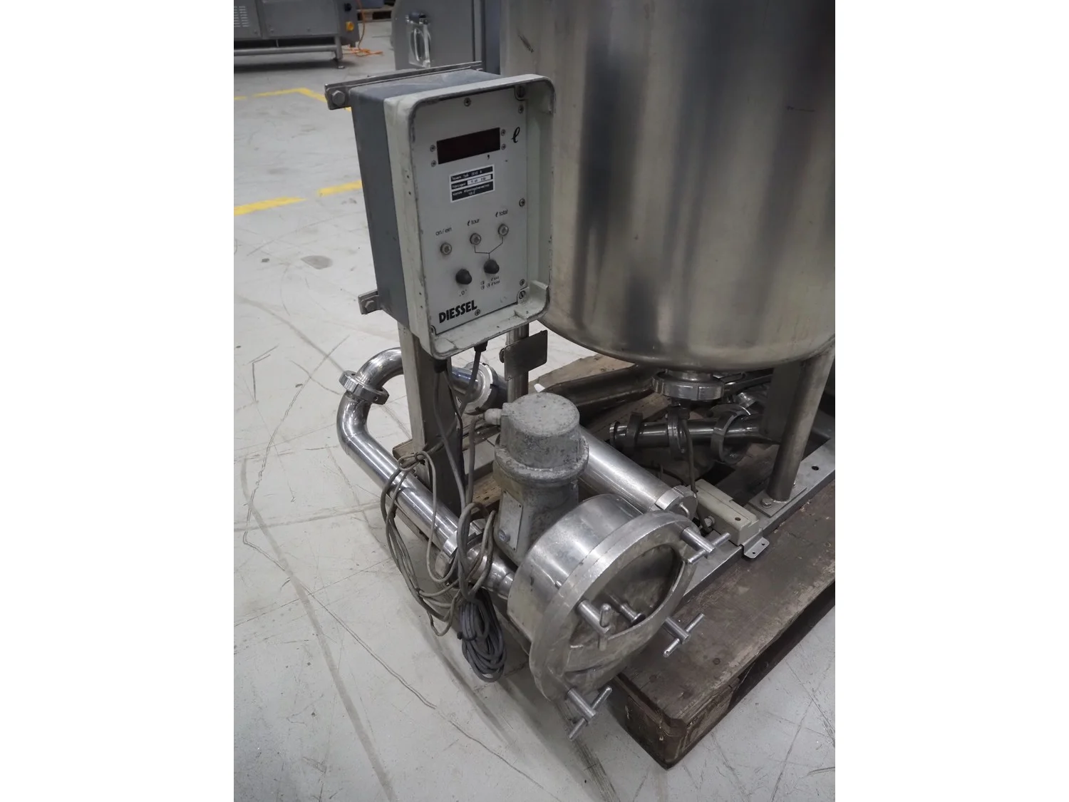 SCHWARTE milk reception unit, with 2 hydraulic self-priming pumps, air eliminator, flow meter, milk filter and interconnecting piping, capacity: 30000 liter per hour, CIP cleanable, inside dimensions: Ø 600 mm x 600 mm, total dimensions: 1500 mm x 800 mm x 1050 mm.