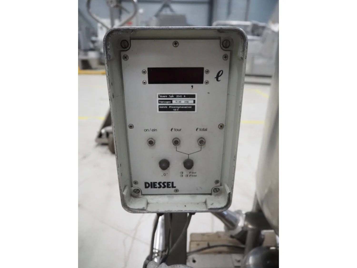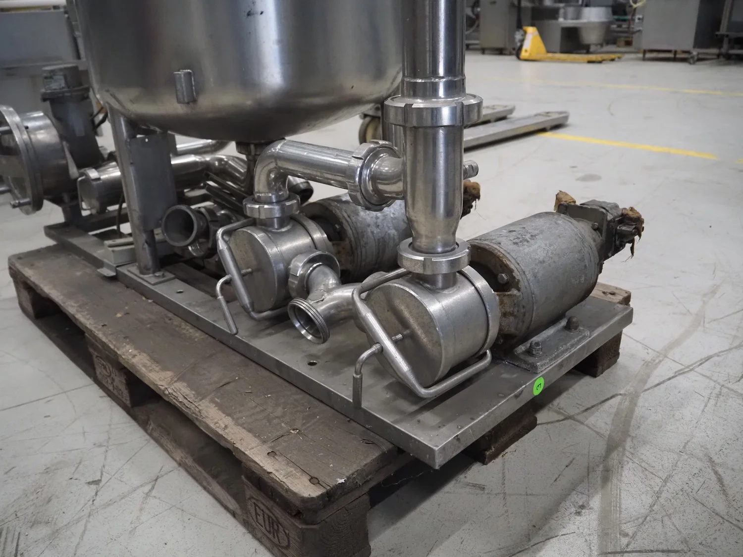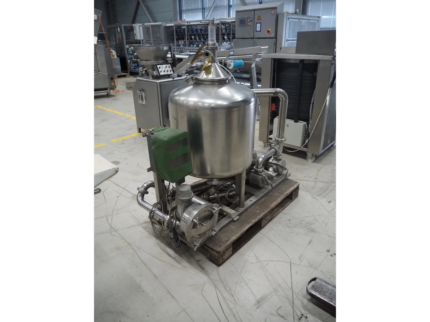 SCHWARTE milk reception unit, with 2 hydraulic self-priming pumps, air eliminator, flow meter, milk filter and interconnecting piping, capacity: 30000 liter per hour, CIP cleanable, inside dimensions: Ø 600 mm x 600 mm, total dimensions: 1500 mm x 800 mm x 1050 mm.