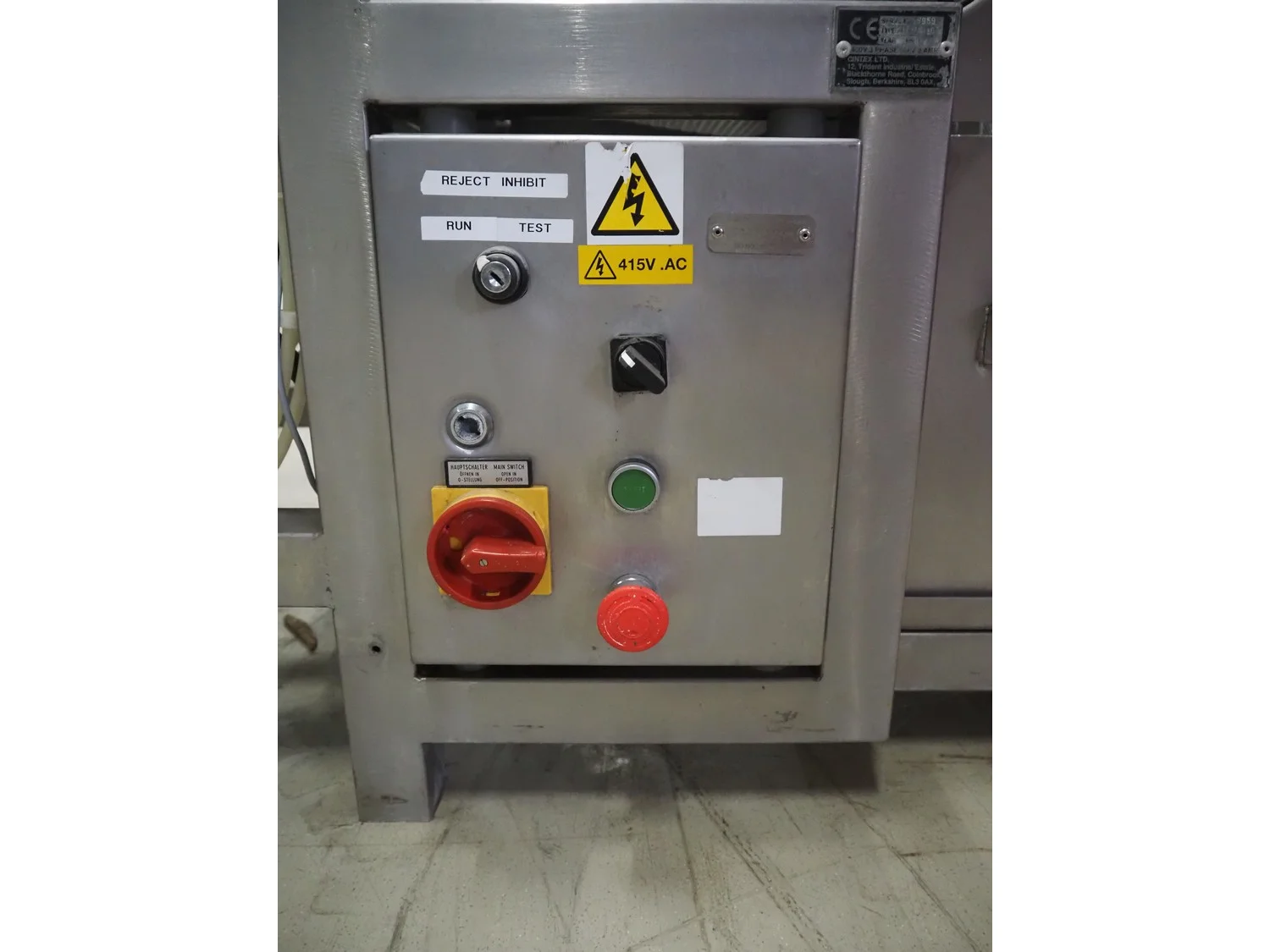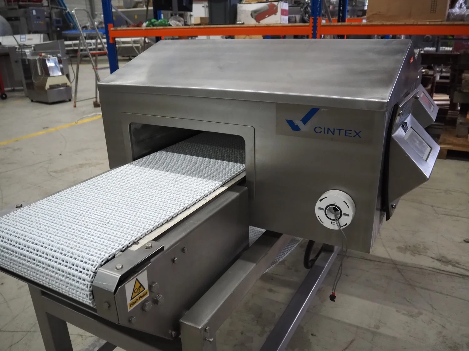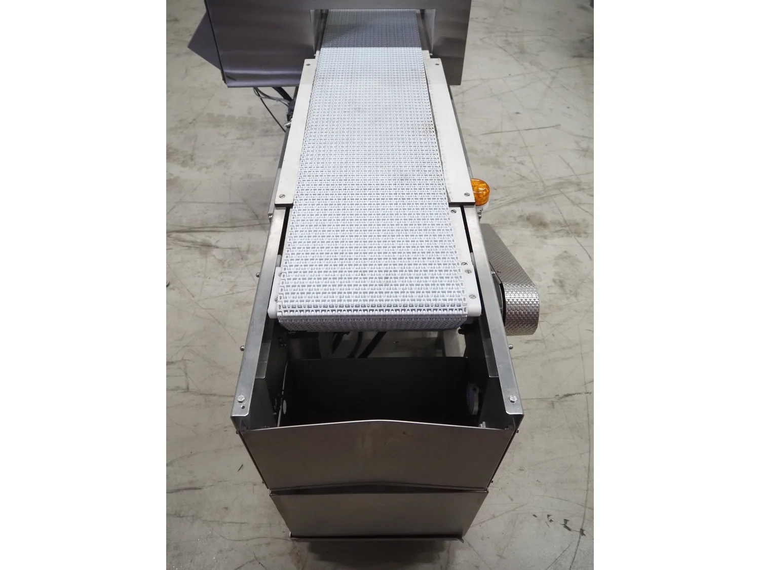 Cintex LTD metal detector with 2 metal detector heads and rejecting belt, type: KHRB30, serial number: 79959, year of construction: 1998, 400 V, 3 Ph, 50 Hz, 3 A, plastic mesh belt, belt width: 300 mm, total dimensions: 2720 mm x 880 mm x 1100 mm. Damaged.
