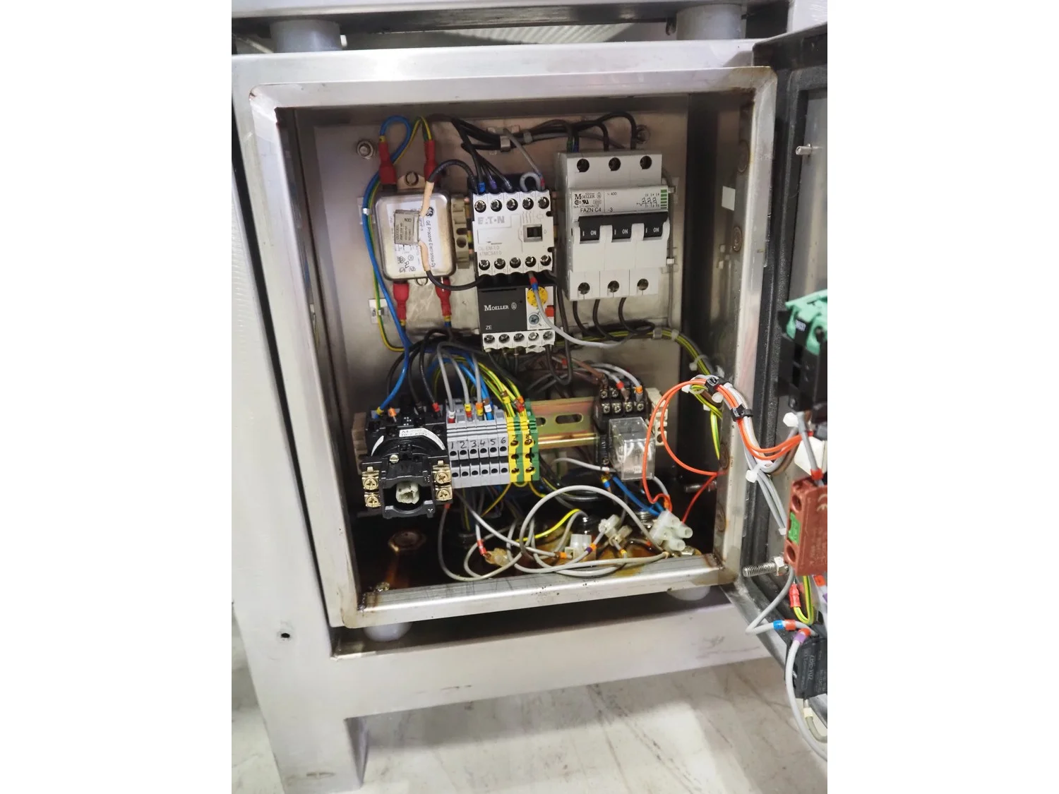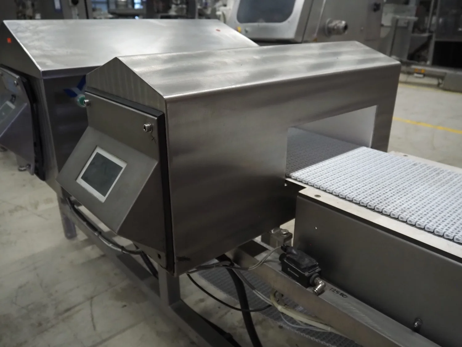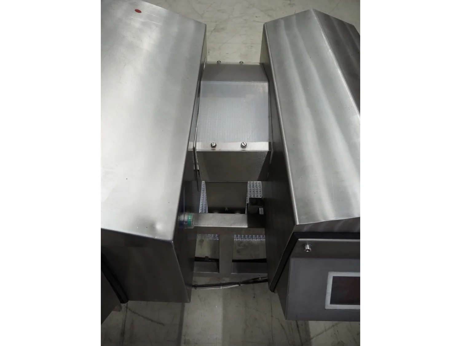 Cintex LTD metal detector with 2 metal detector heads and rejecting belt, type: KHRB30, serial number: 79959, year of construction: 1998, 400 V, 3 Ph, 50 Hz, 3 A, plastic mesh belt, belt width: 300 mm, total dimensions: 2720 mm x 880 mm x 1100 mm. Damaged.