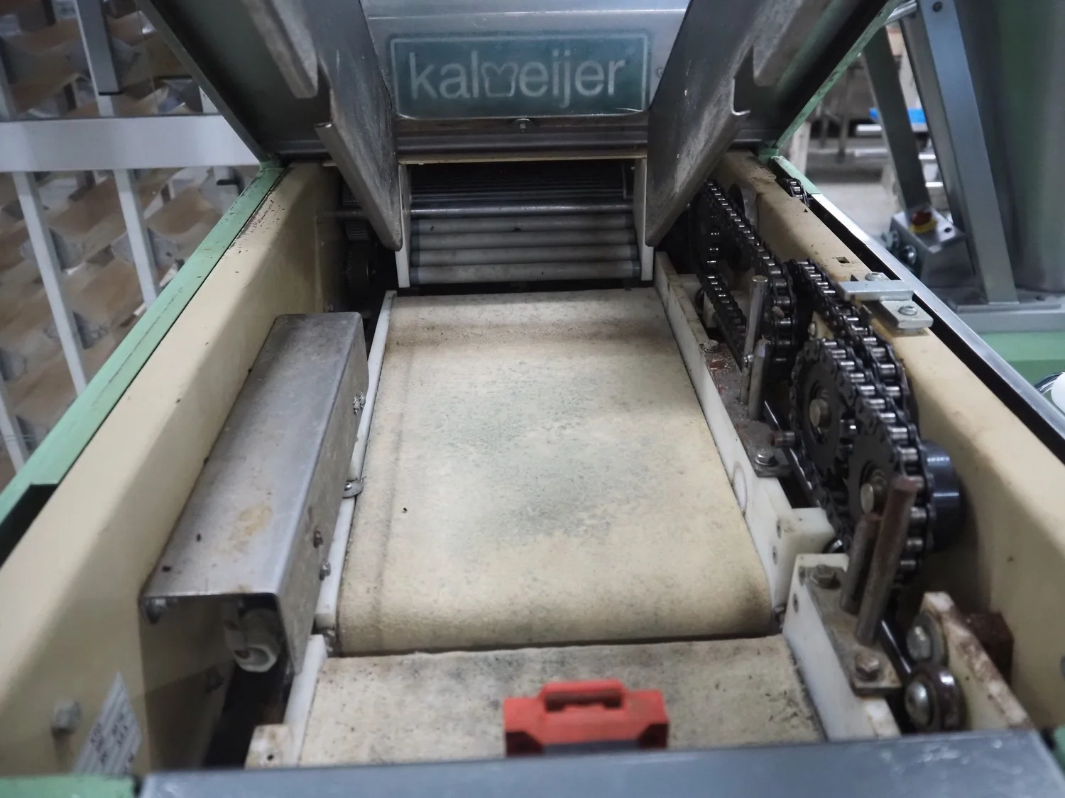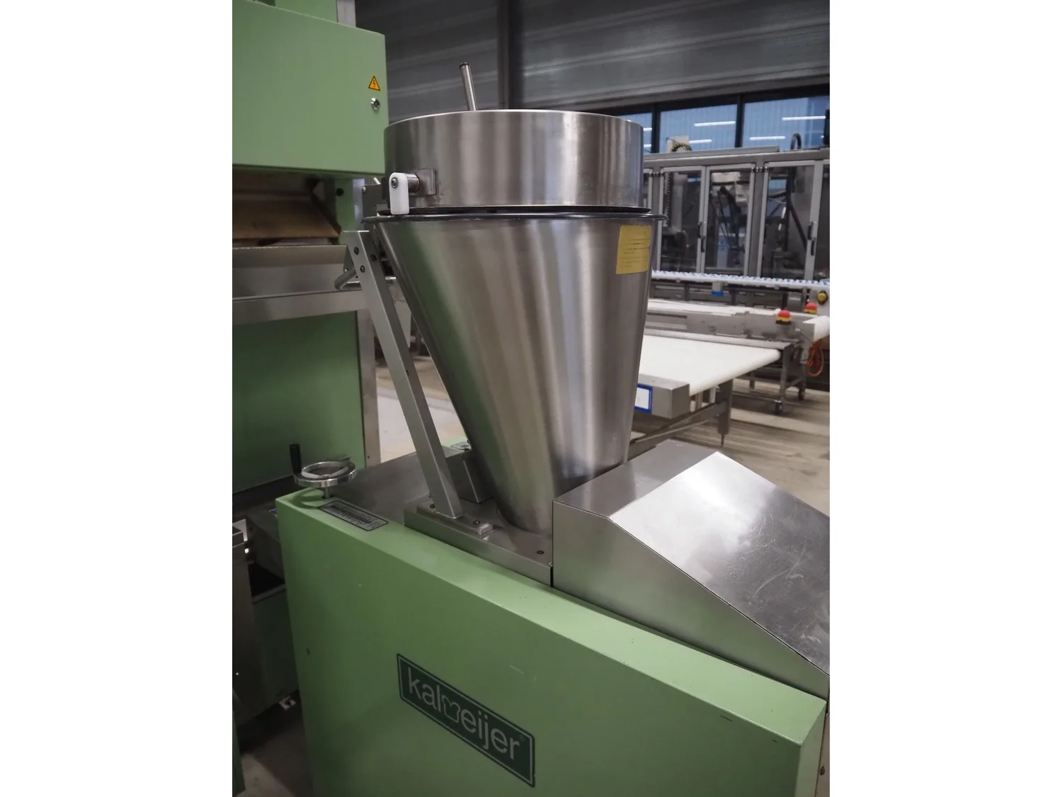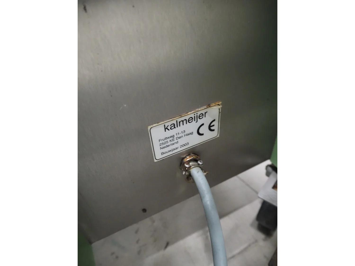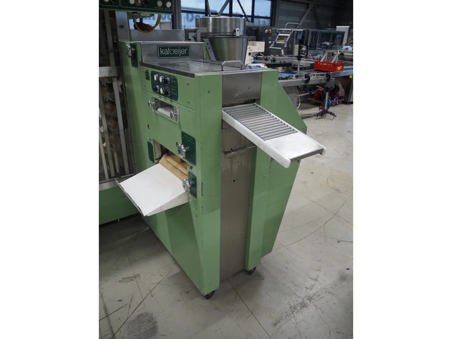 Kalmeijer bread line, consisting of: Kalmeijer dough divider, plastic outfeed belt, belt width: 260 mm, total dimensions: 1700 mm x 600 mm x 1900 mm, Kalmeijer proofer, number: 9486, 400 V, 3 Ph, 50 Hz, 14.1 A, 7.25 kW, approximately 270 baskets, dimensions each basket: 500 mm x 100 mm, total dimensions: 3000 mm x 1200 mm x 2700 Kalmeijer long moulder, year of construction: 2003, cloth belt, belt width: 120 mm, total dimensions: 1400 mm x 900 mm x 1600 mm.