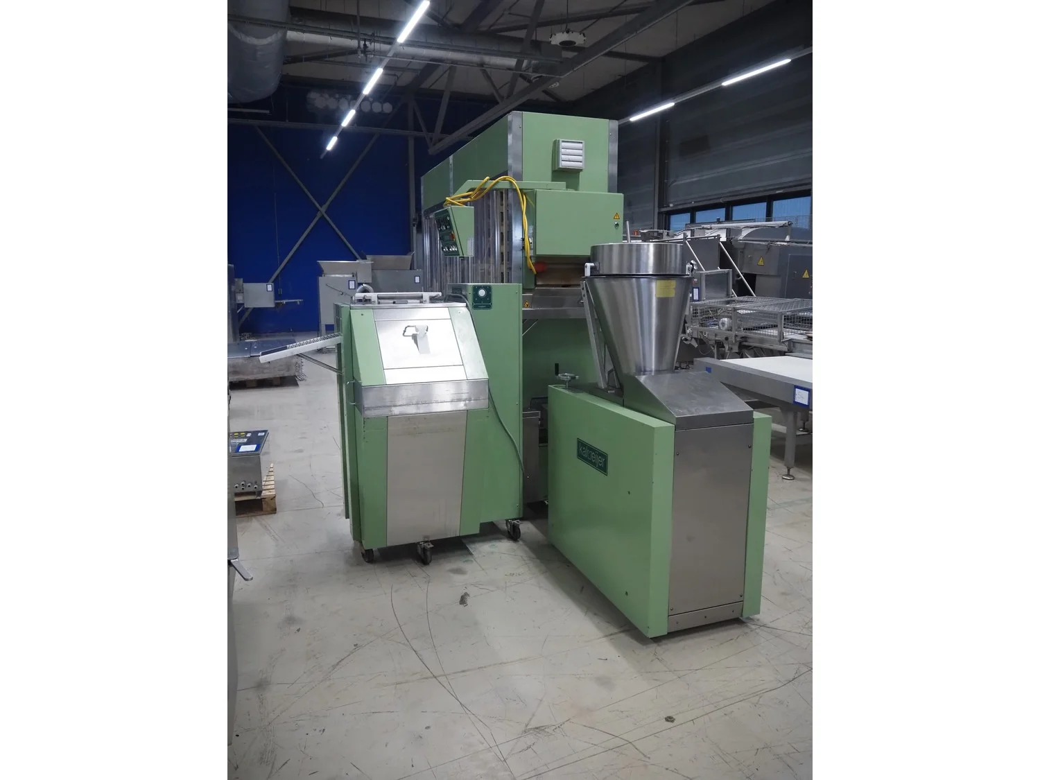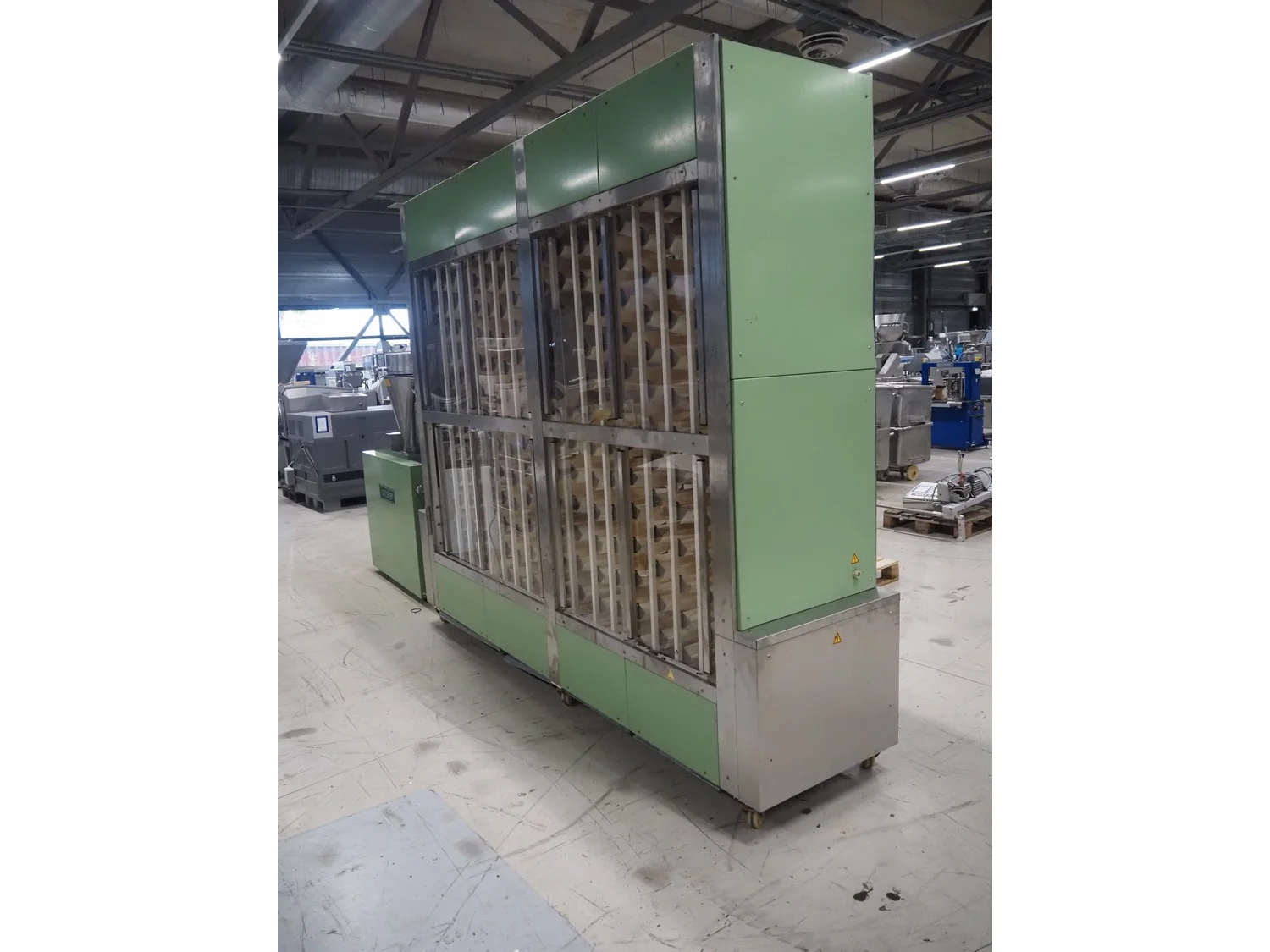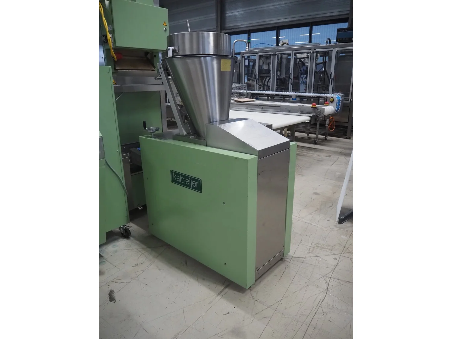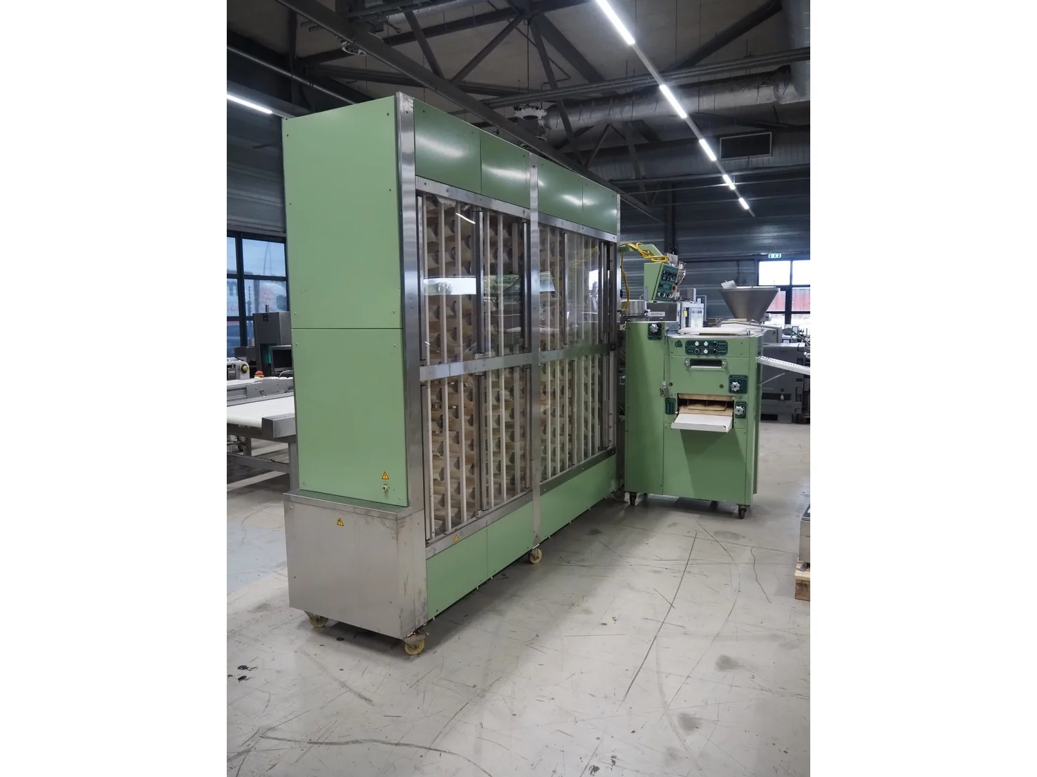 Kalmeijer bread line, consisting of: Kalmeijer dough divider, plastic outfeed belt, belt width: 260 mm, total dimensions: 1700 mm x 600 mm x 1900 mm, Kalmeijer proofer, number: 9486, 400 V, 3 Ph, 50 Hz, 14.1 A, 7.25 kW, approximately 270 baskets, dimensions each basket: 500 mm x 100 mm, total dimensions: 3000 mm x 1200 mm x 2700 Kalmeijer long moulder, year of construction: 2003, cloth belt, belt width: 120 mm, total dimensions: 1400 mm x 900 mm x 1600 mm.