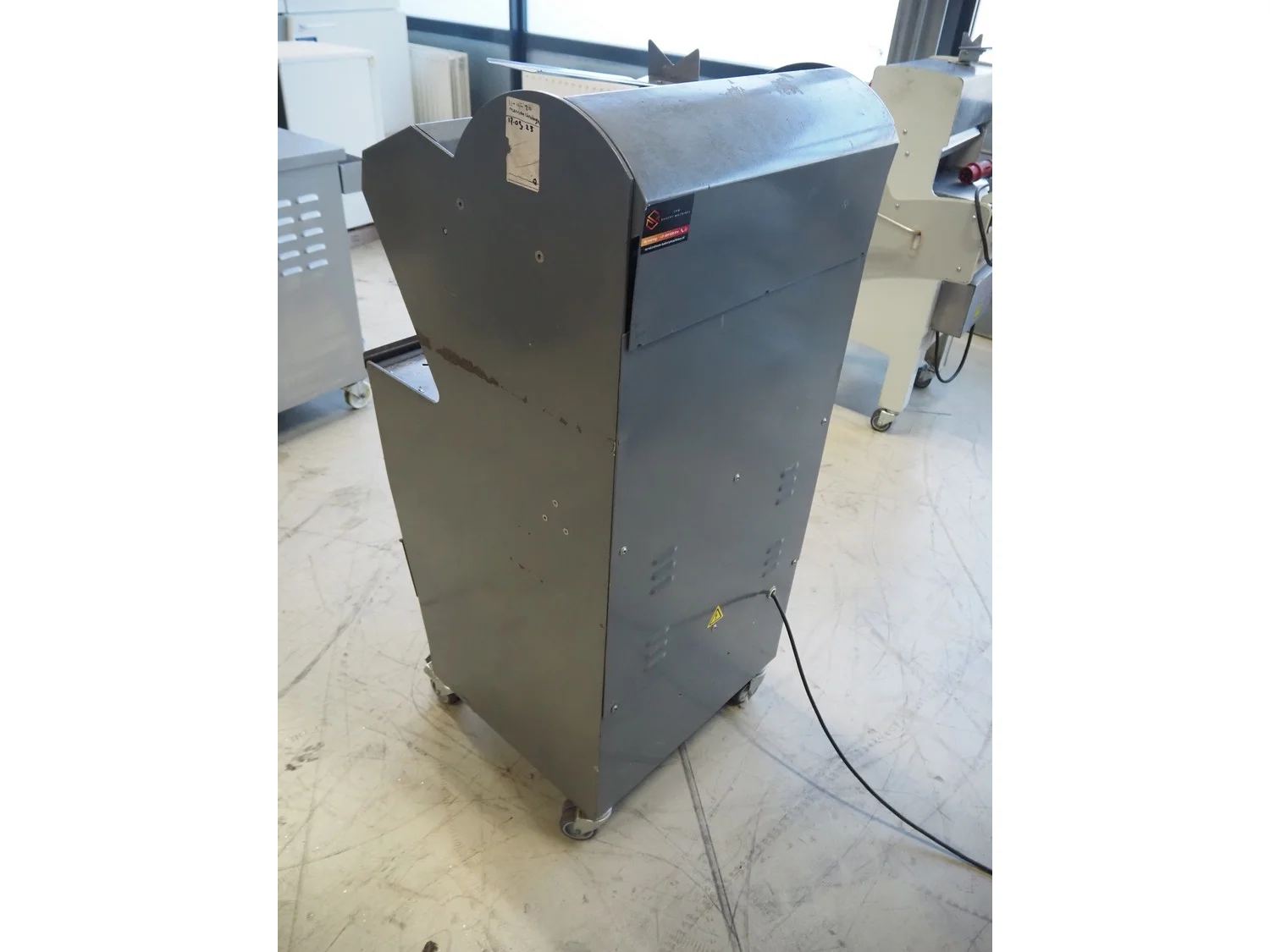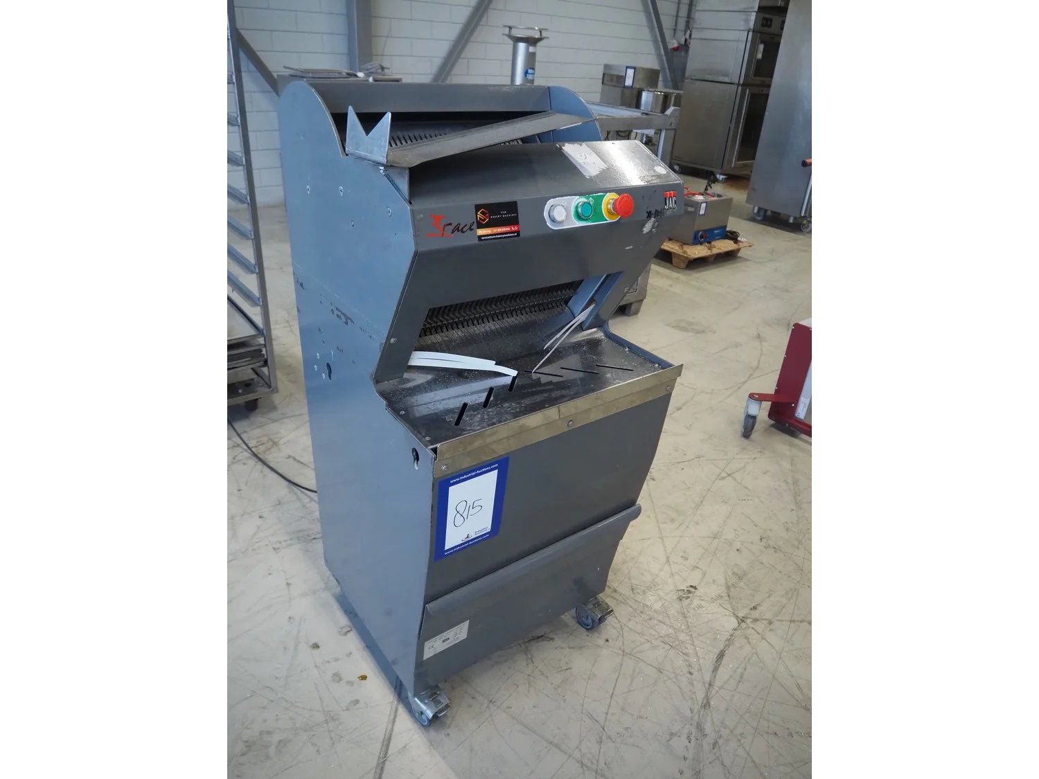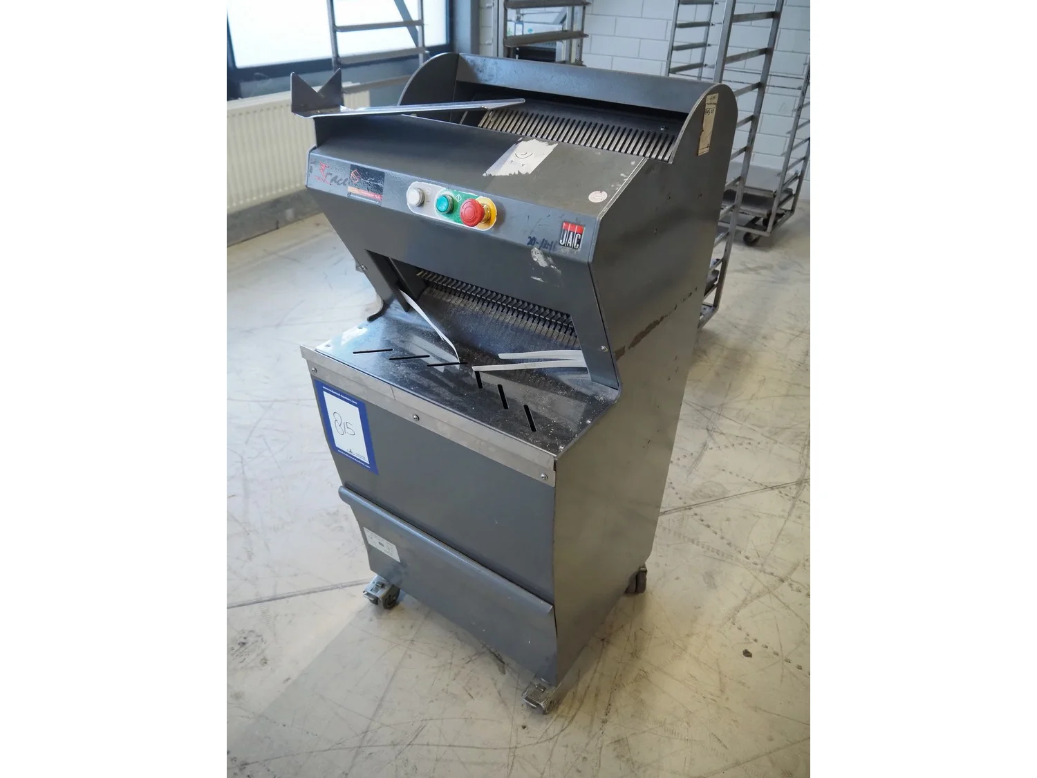 JAC mobile bread slicer, model: ECH 450/99, machine number: 09/3935/18, 230 V, 1 Ph, 50 Hz, 4.0 A, 0.49 kW, 180 kg, 34 knives, distance between knives: 11 mm, total dimensions: 590 mm x 650 mm x 1320 mm.