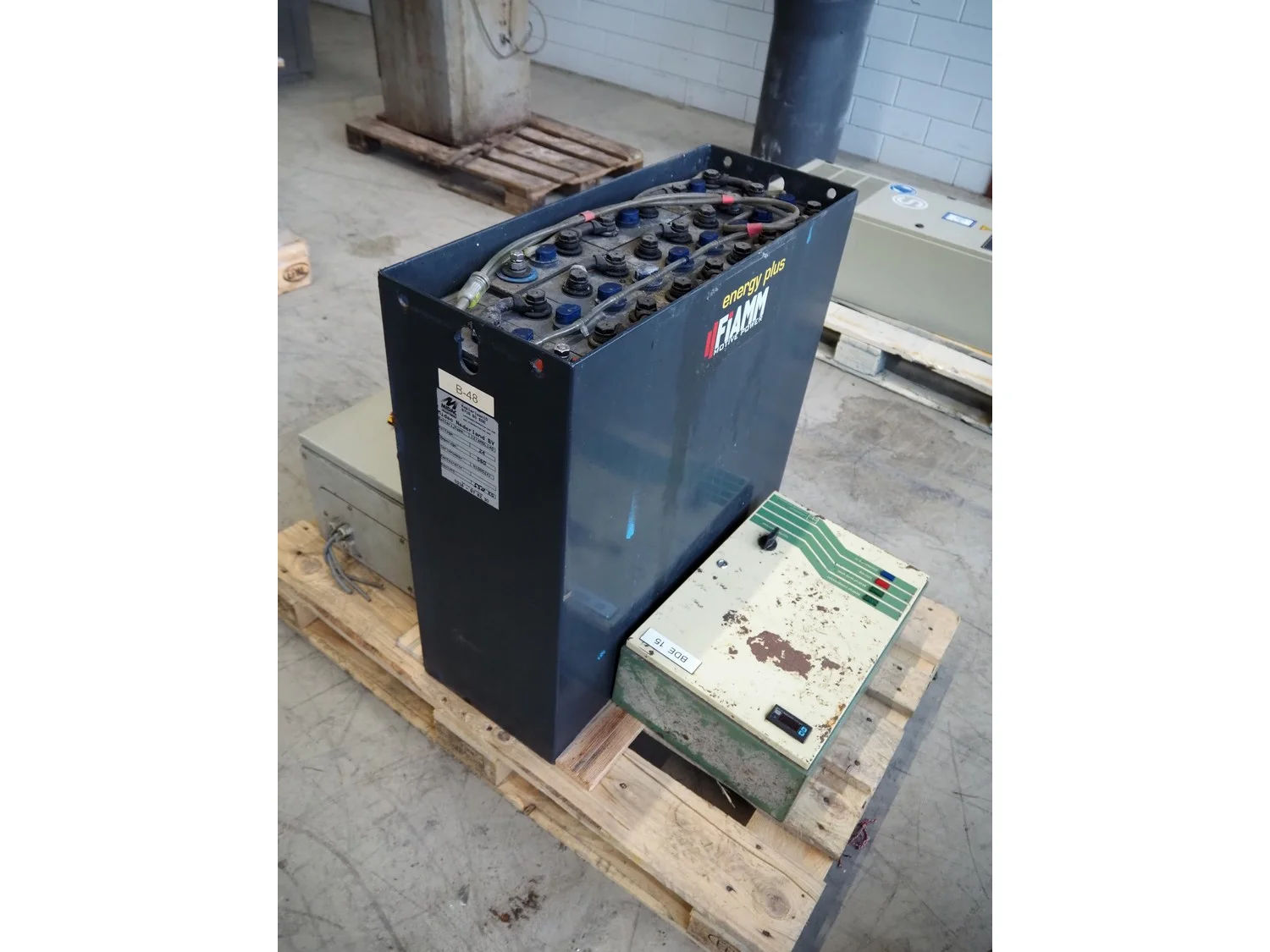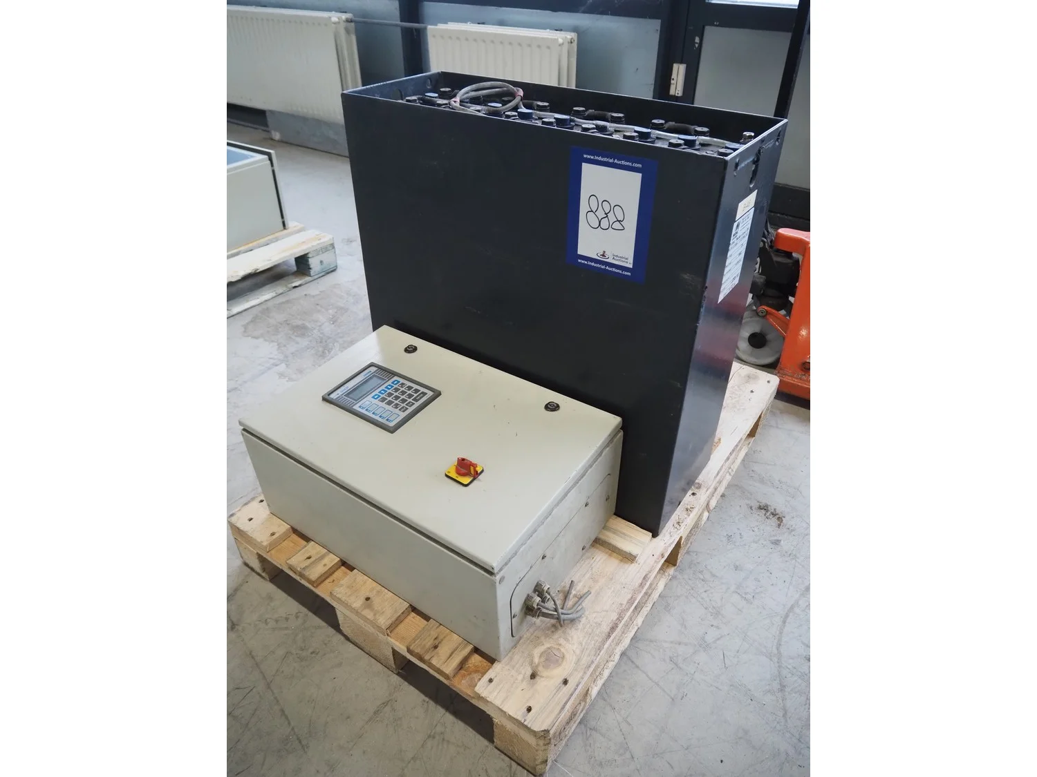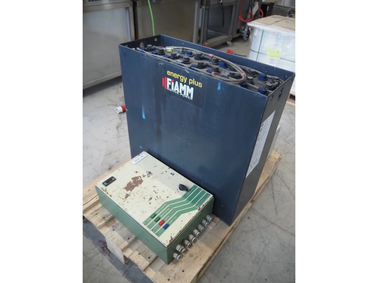 Pallet with Midac battery for electrical pallet lifter and 2 switch cabinets, type: 12/4MDL140, serial number: N1005241, 24 V, 560 A.