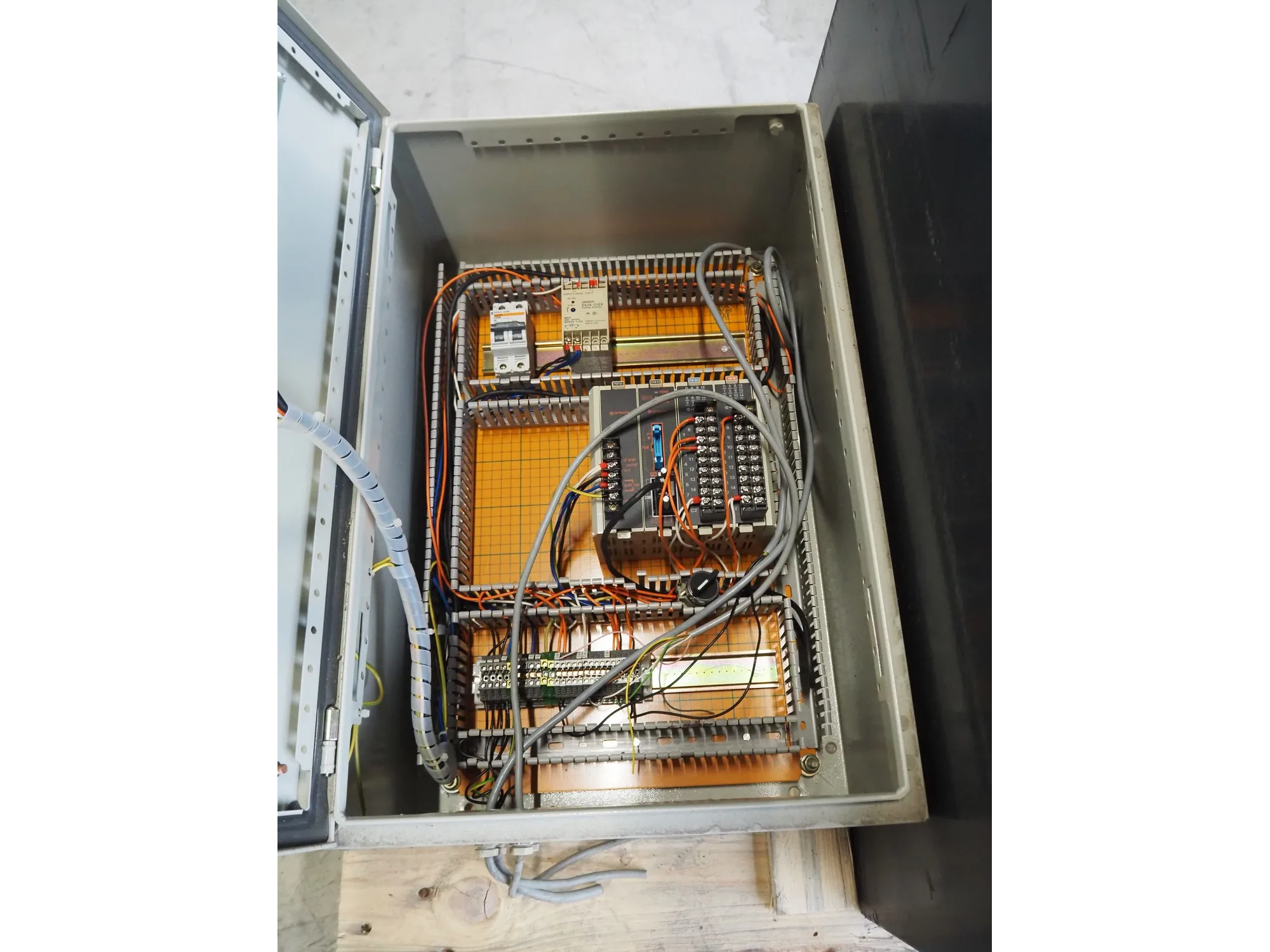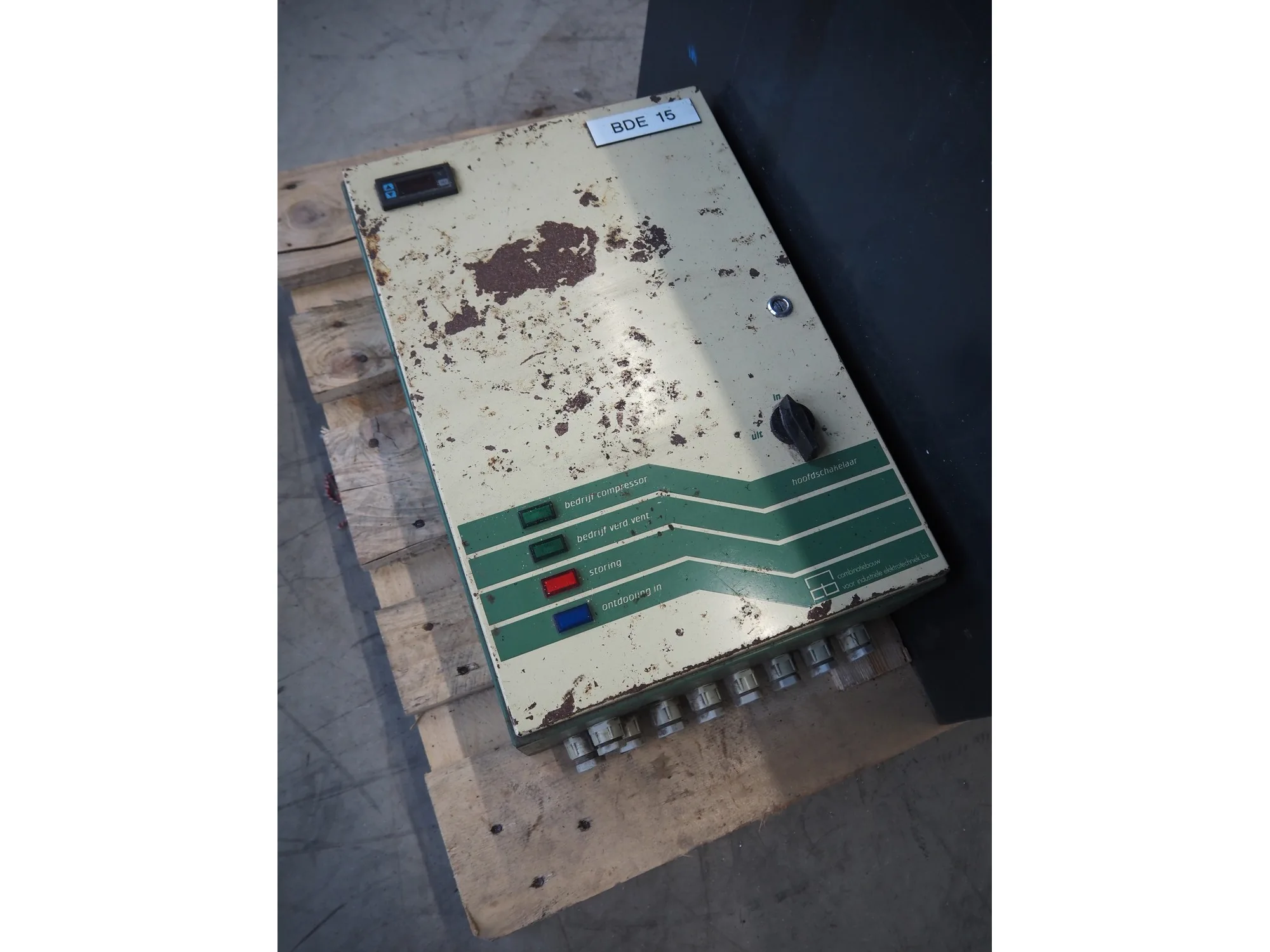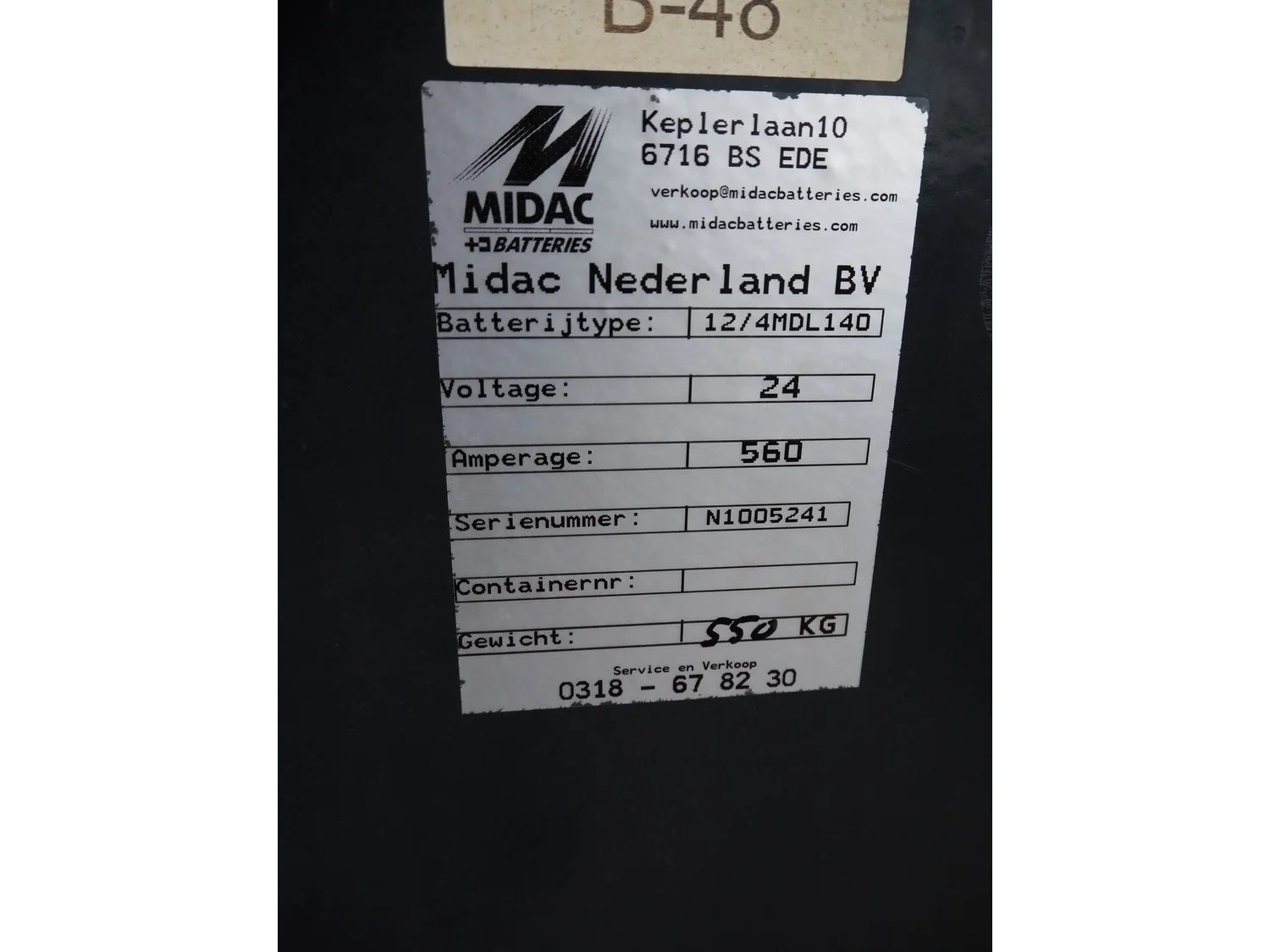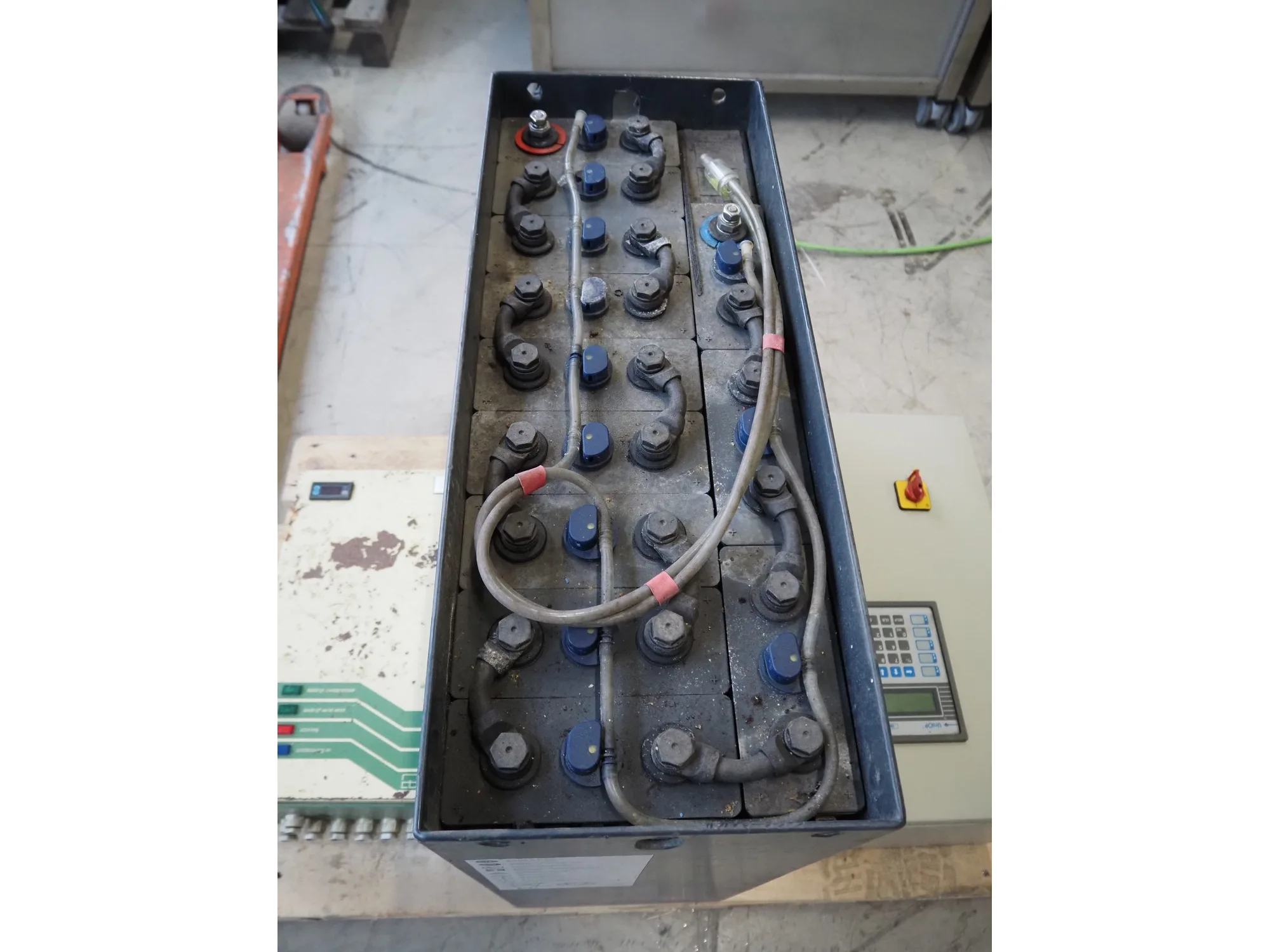 Pallet with Midac battery for electrical pallet lifter and 2 switch cabinets, type: 12/4MDL140, serial number: N1005241, 24 V, 560 A.