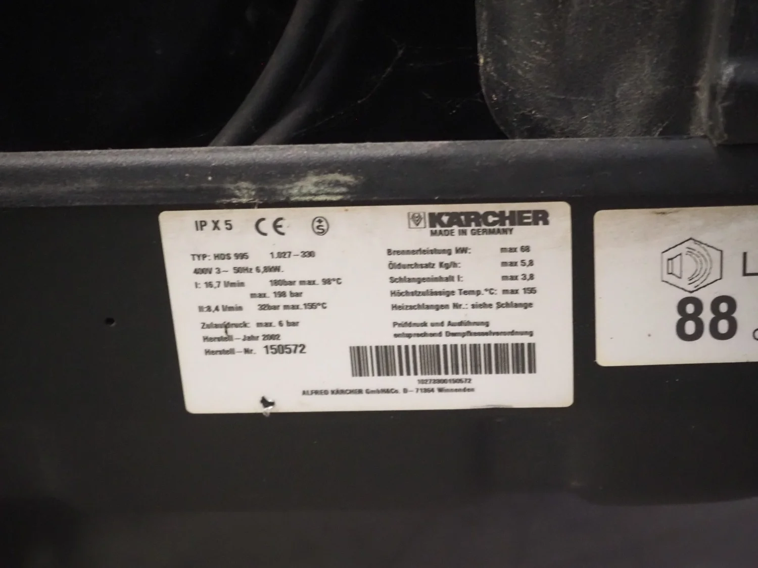 Kärcher mobile high pressure cleaner, type: HDS 995, number: 150572, year of construction: 2002, 400 V, 3 Ph, 50 Hz, 6.8 kW, dimensions: 1400 mm x 600 mm x 900 mm.
