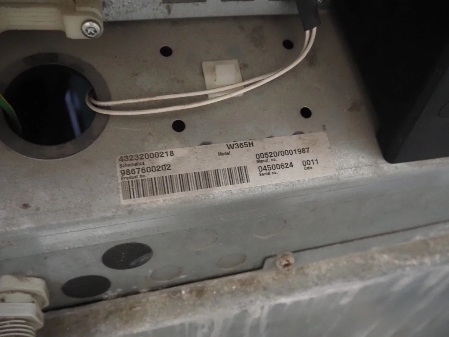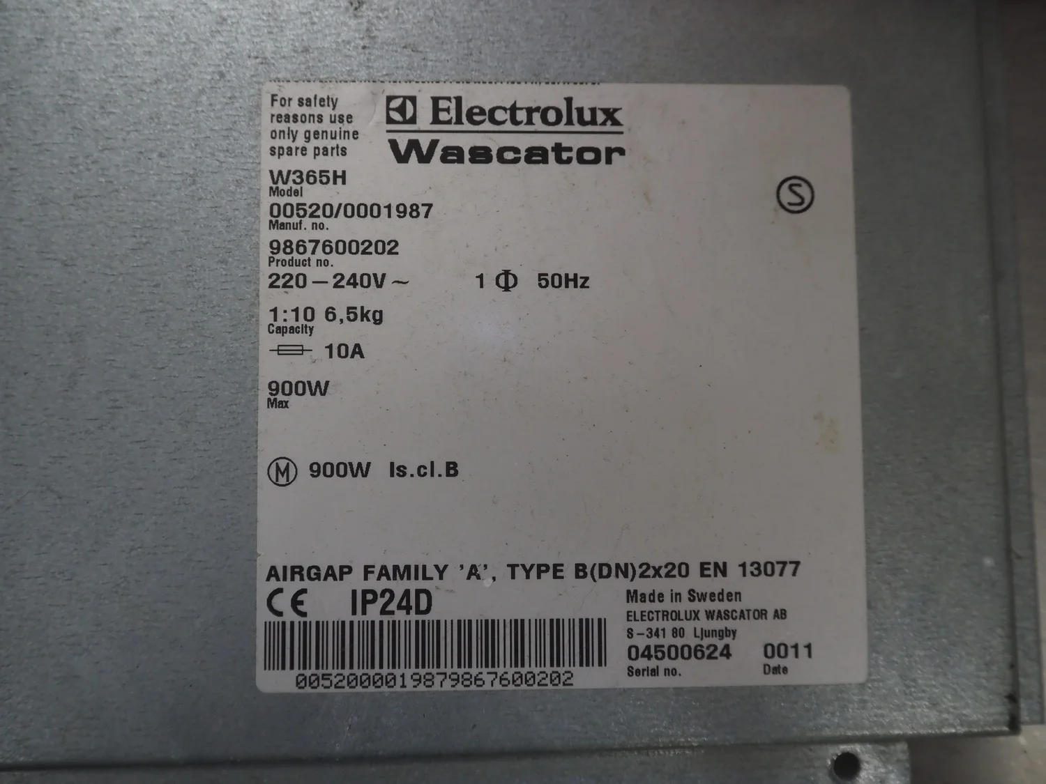 Electrolux washing machine, model: W365H, serial number: 04500624 , 220/240 V, 1 Ph, 50 Hz, 10 A, 900 W, capacity: 6.5 kg, total dimensions: 720 mm x 680 mm x 1155 mm.