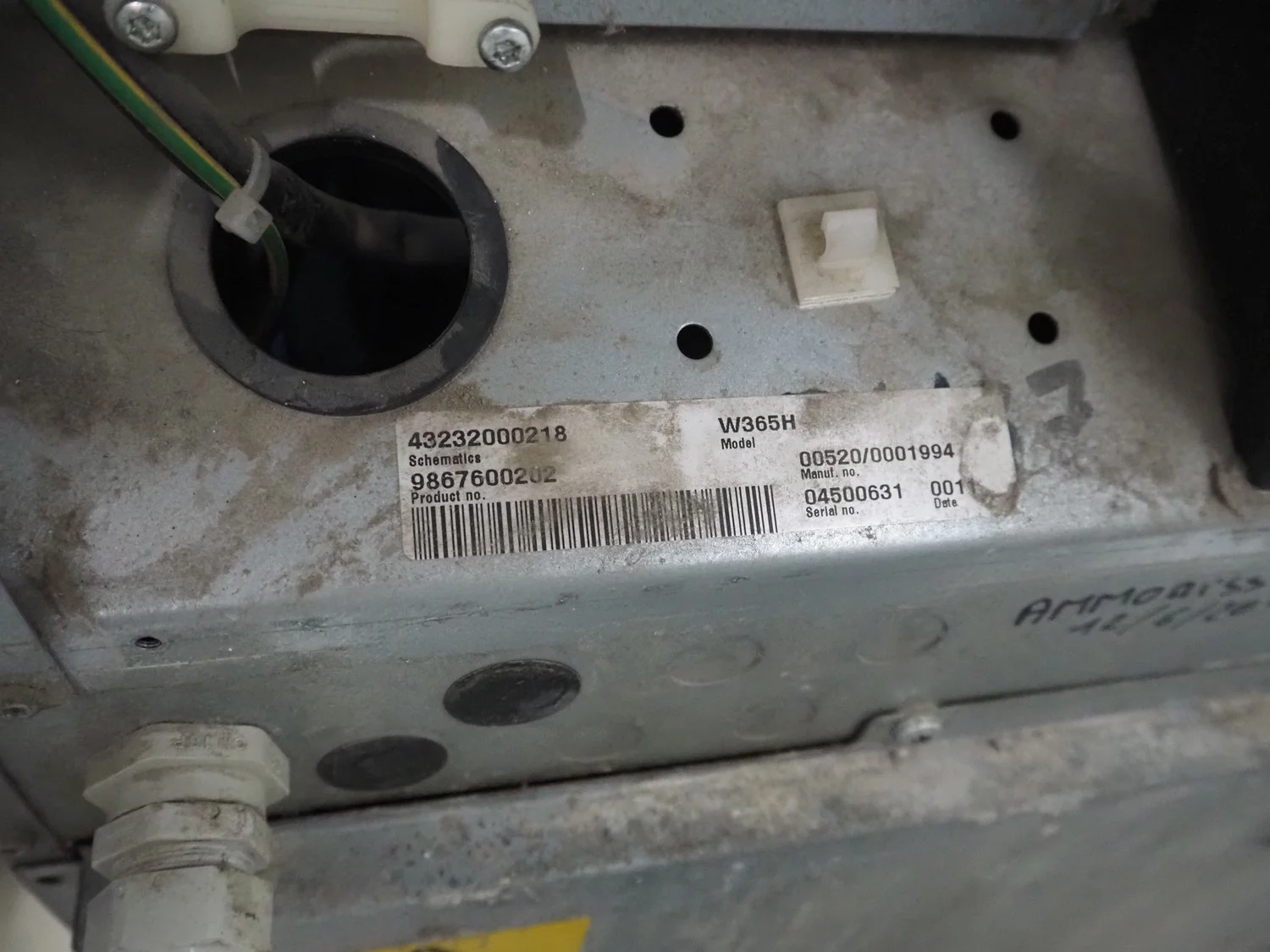 Electrolux washing machine, model: W365H, serial number: 04500626 , 220/240 V, 1 Ph, 50 Hz, 10 A, 900 W, capacity: 6.5 kg, total dimensions: 720 mm x 680 mm x 1155 mm.