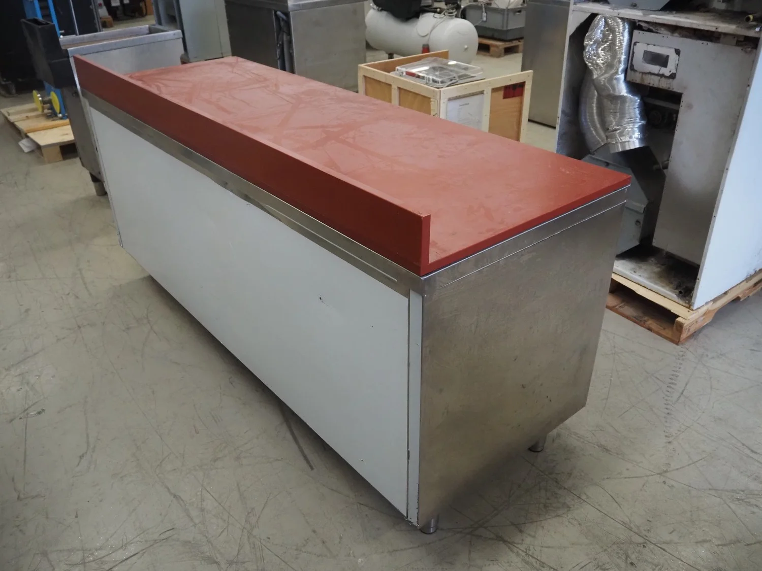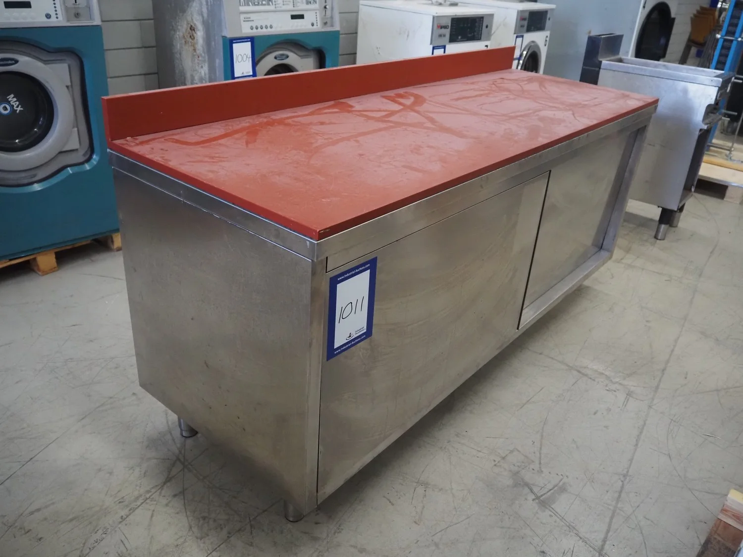 S/s cabinet with plastic worktop, dimensions: 2000 mm x 700 mm x 1000 mm.