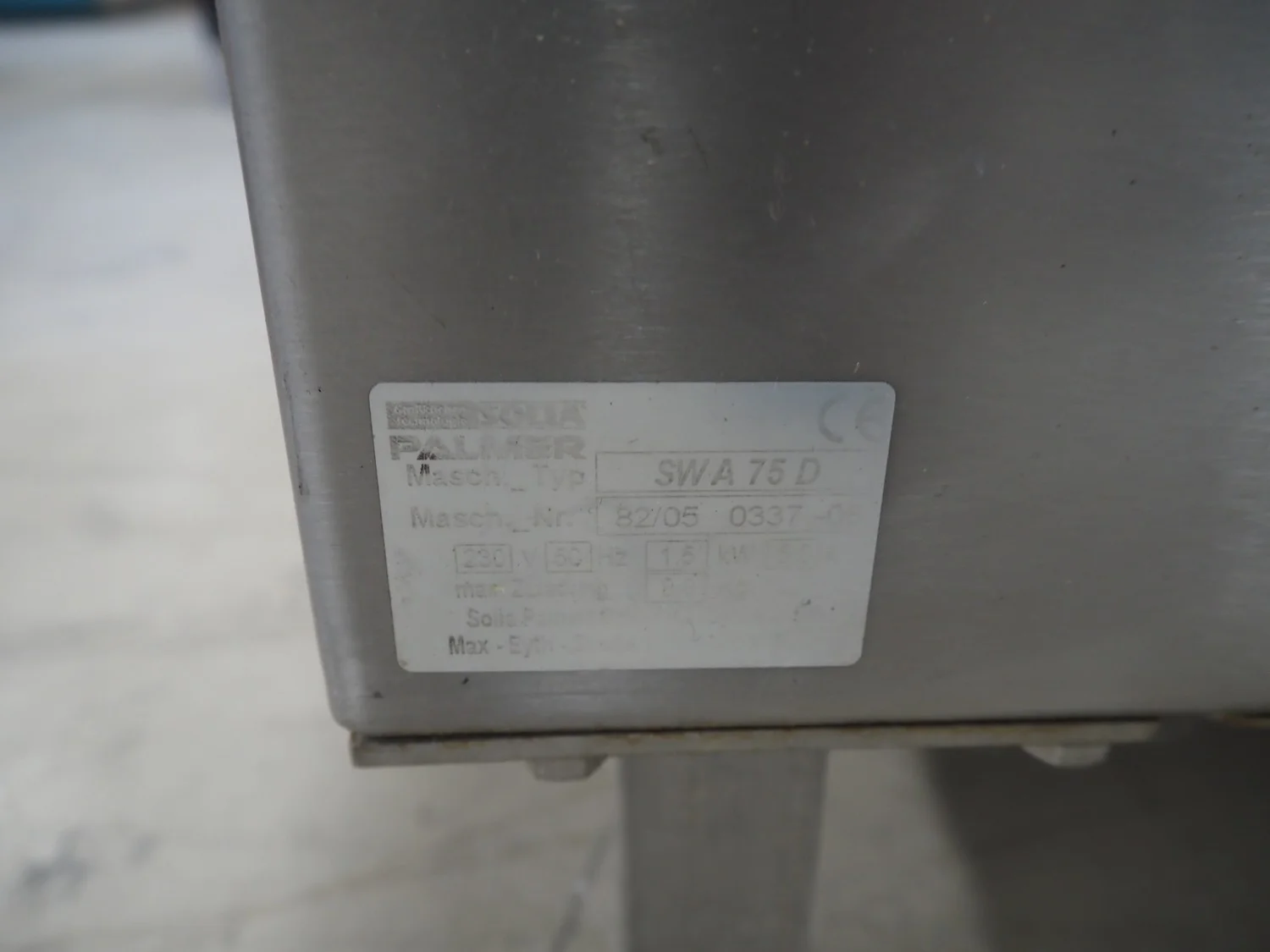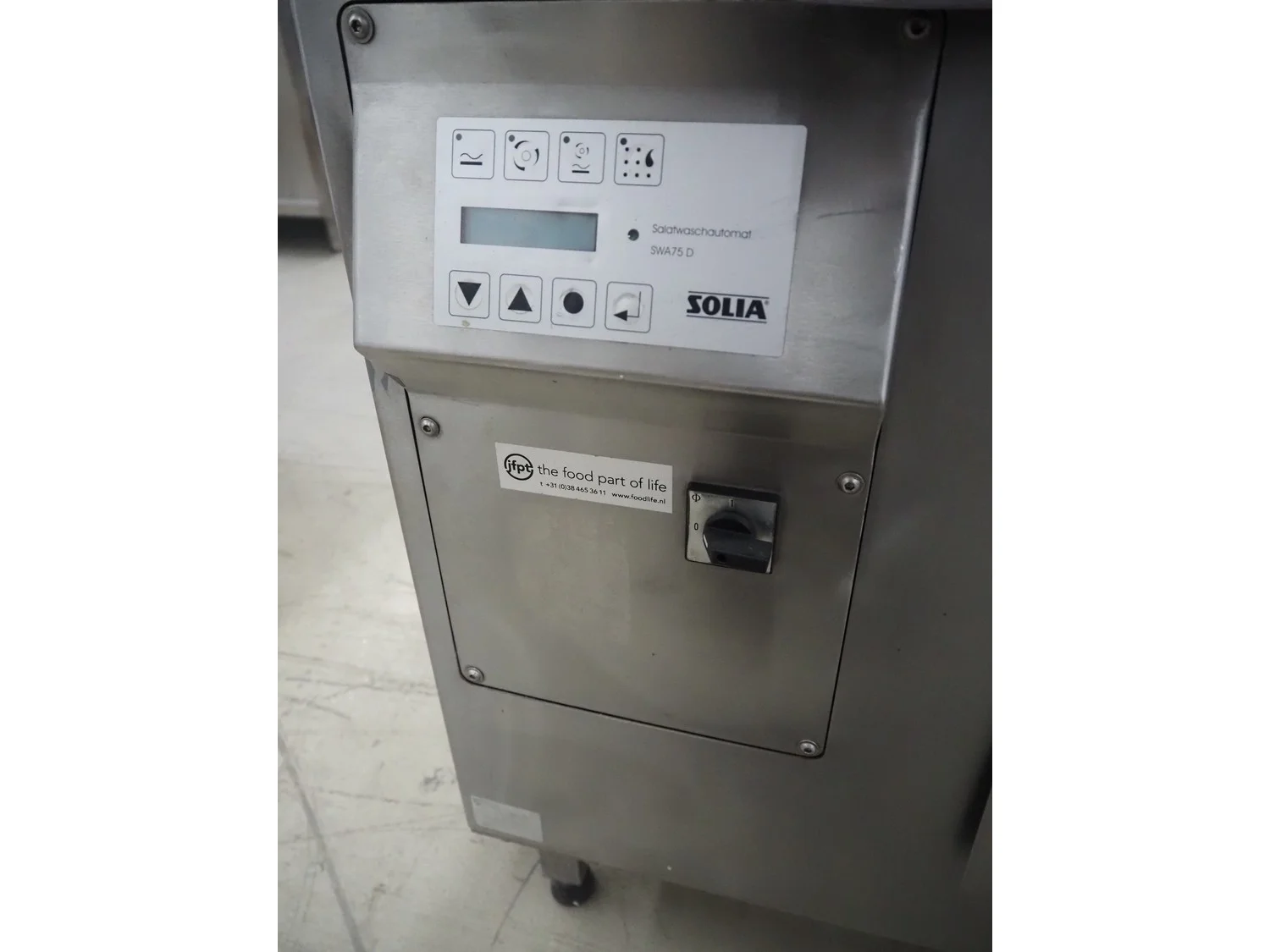 Solia salad washer and dryer, type: SWA 75 D, machine number: 82/05 0337 08, 230 V, 50 Hz, 1.5 kW, dimensions washer: Ø 420 mm x 350 mm, working dimensions: Ø 395 mm x 290 mm, total dimensions: 1000 mm x 700 mm x 865 mm.