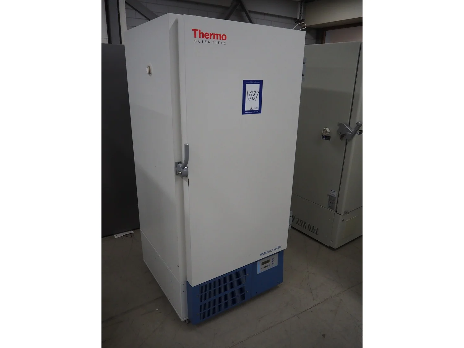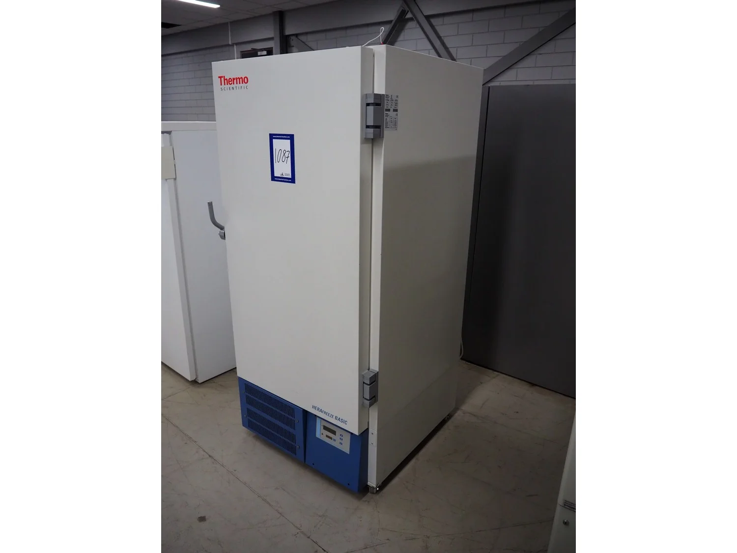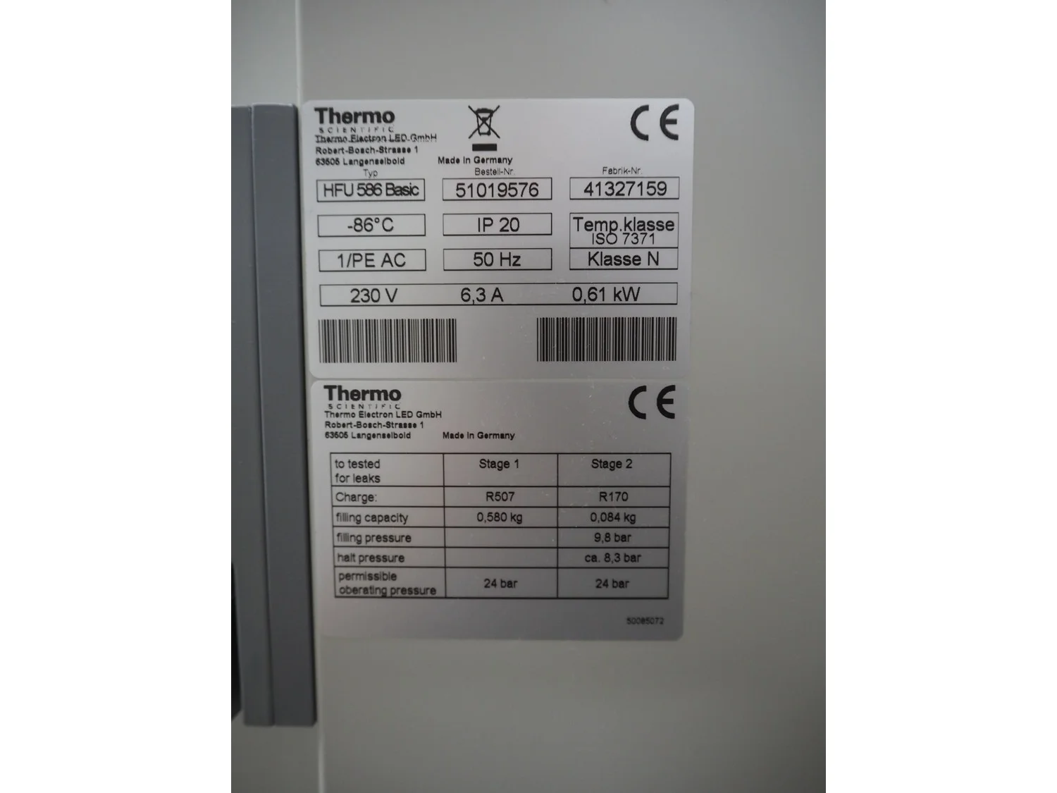Thermo Scientific laboratory freezer, type: HFU 586 Basic, fabrication number: 41327159, 230 V, 1 Ph, 50 Hz, 6.3 A, 0.61 kW, refrigerant: R507, 0.580 kg, R170, 0.084 kg, up to -86° C, dimensions: 900 mm x 1000 mm x 1980 mm.
