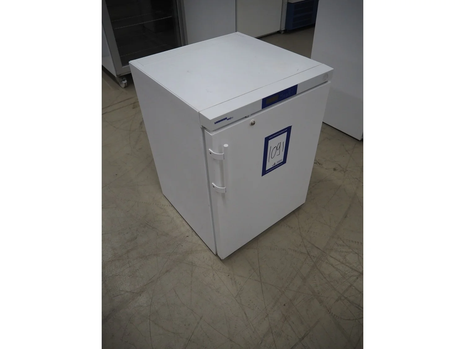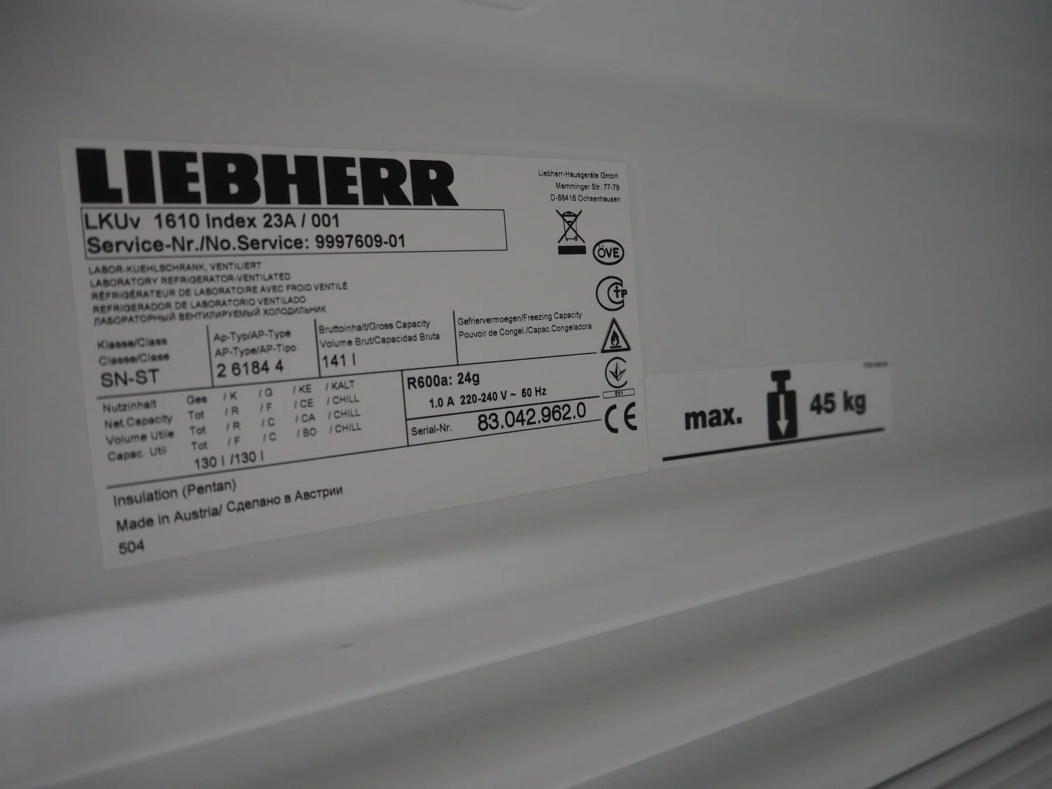 Liebherr laboratory refrigerator, model: LKUv 1610, serial number: 83.042.962.0, 220-240 V, 50 Hz, 1.0 A, refrigerant: R600a, 24 gram, volume: 130 liter, dimensions: 620 mm x 600 mm x 840 mm.