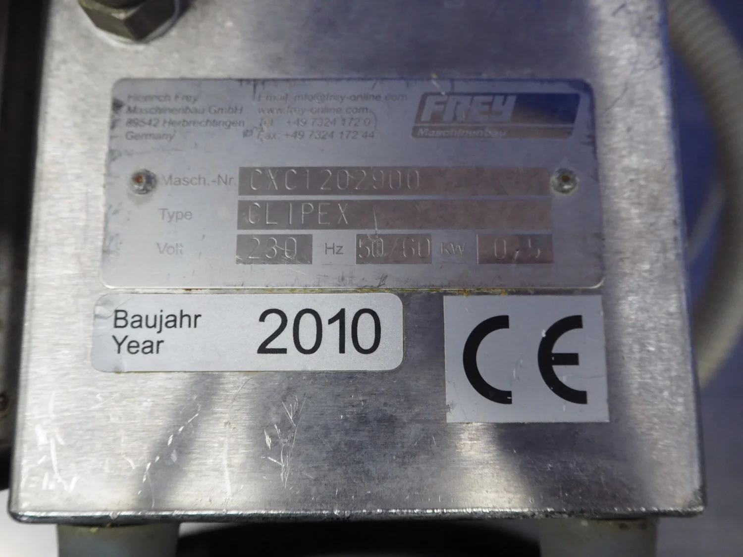 Frey casing sealer, type: CLIPEX, machine number: CXC1202900, year of construction: 2010, 230 V, 50/60 Hz, 0.5 kW, dimensions: (1x) 350 mm x 150 mm x 220 mm, (1x) 400 mm x 100 mm x 120 mm.