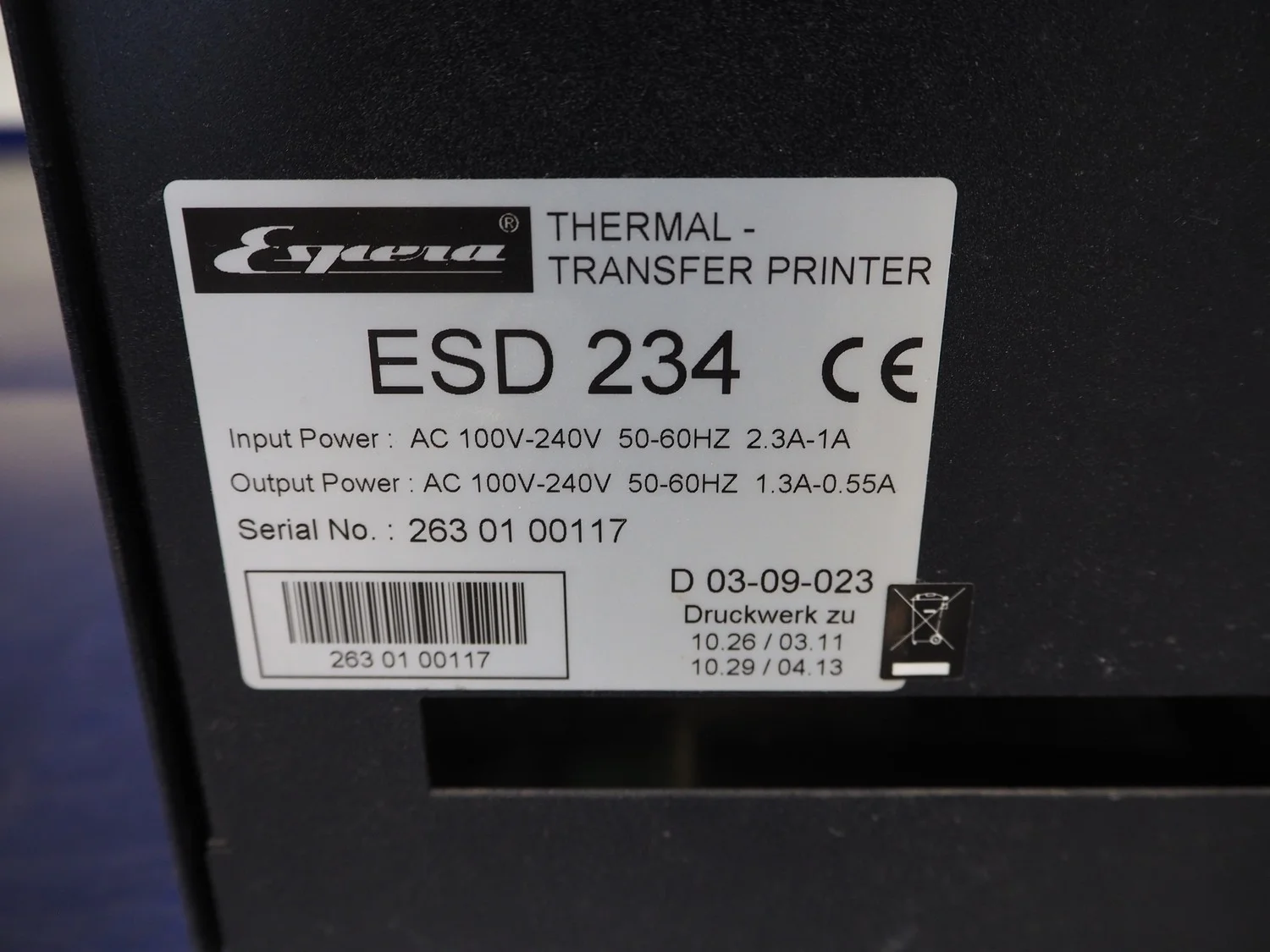 Espera label printer, model: ESD 234, serial number: 263 01 00117, dimensions: 500 mm x 270 mm x 300 mm.