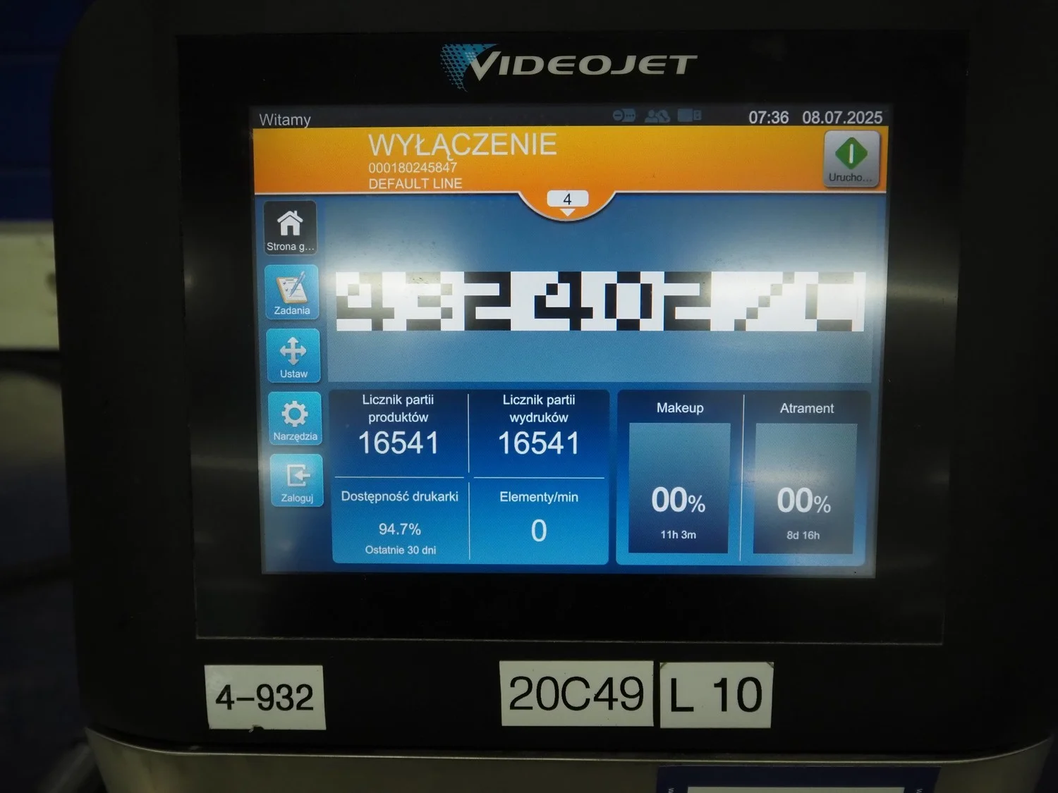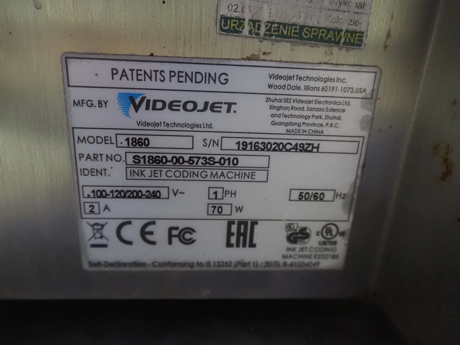 Videojet inkjet printer, model: 1860, serial number: 19163020C49ZH, 100-120/200-240 V, 1 Ph, 50/60 Hz, 2 A, 70 W, toner: V7206L, make-up: V901Q- 1l, ink: V4211-L, dimensions: 370 mm x 400 mm x 610 mm.