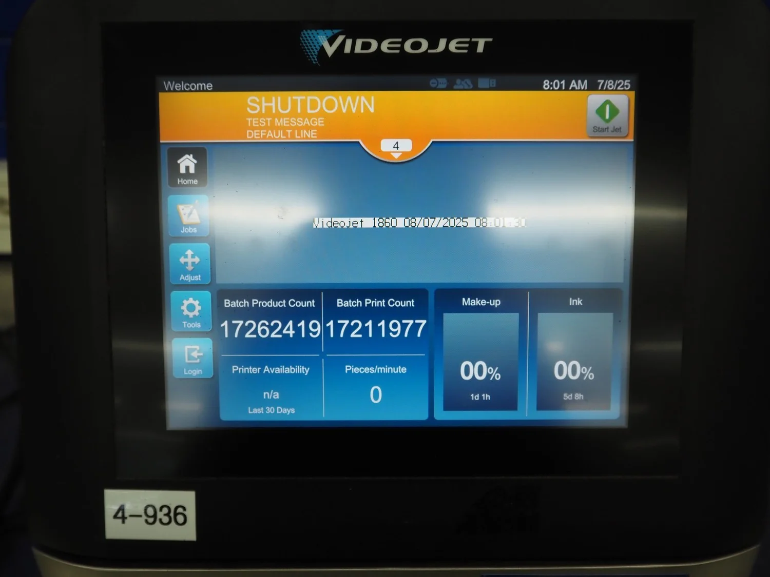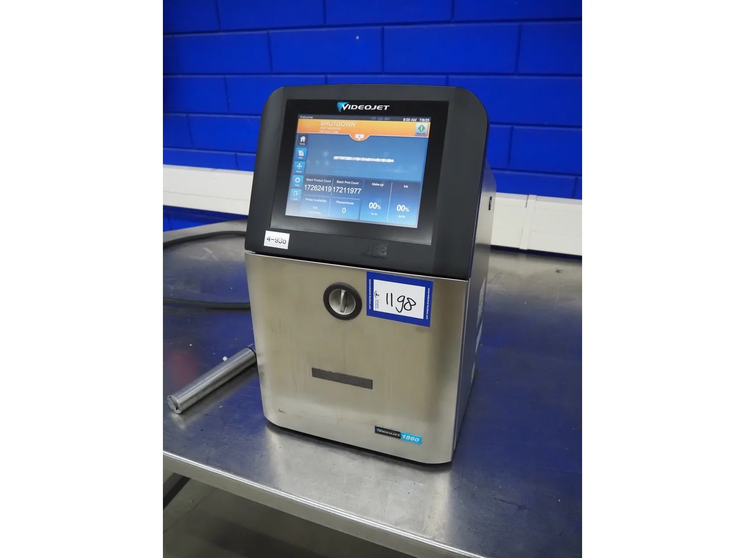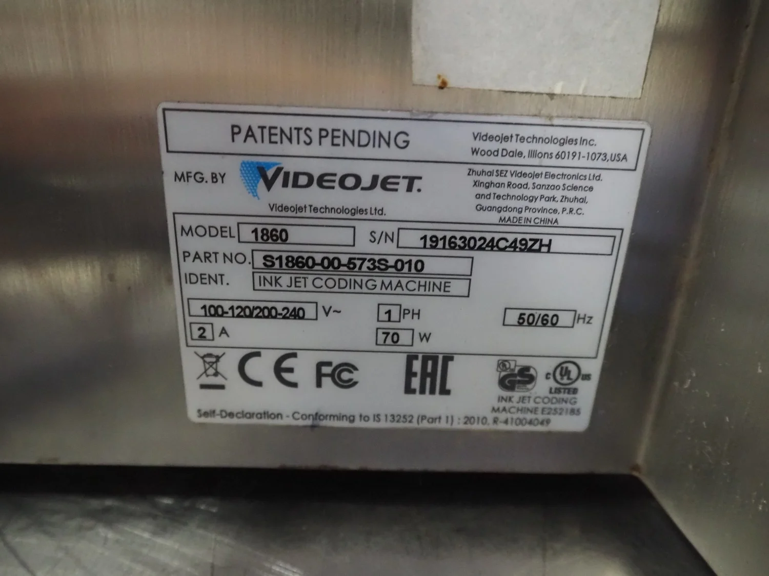 Videojet inkjet printer, model: 1860, serial number: 19163024C49ZH, 100-120/200-240 V, 1 Ph, 50/60 Hz, 2 A, 70 W, toner: V7206L, make-up: V901Q- 1l, ink: V4211-L, dimensions: 370 mm x 400 mm x 610 mm.
