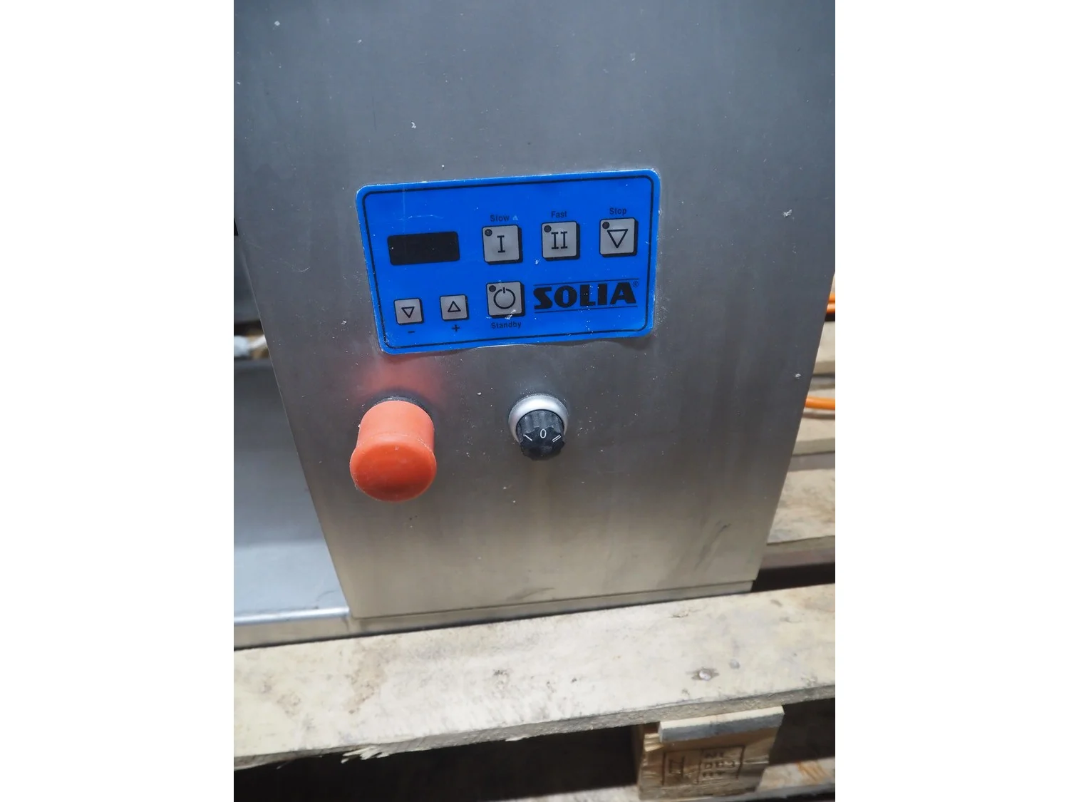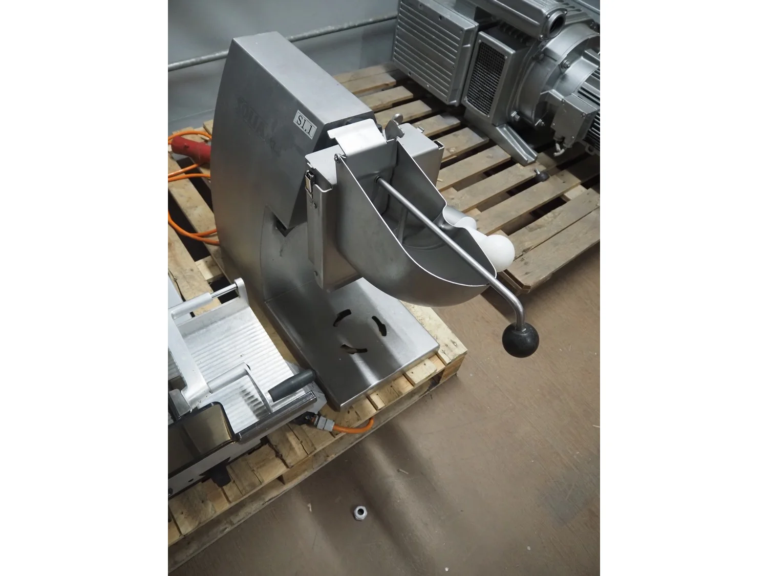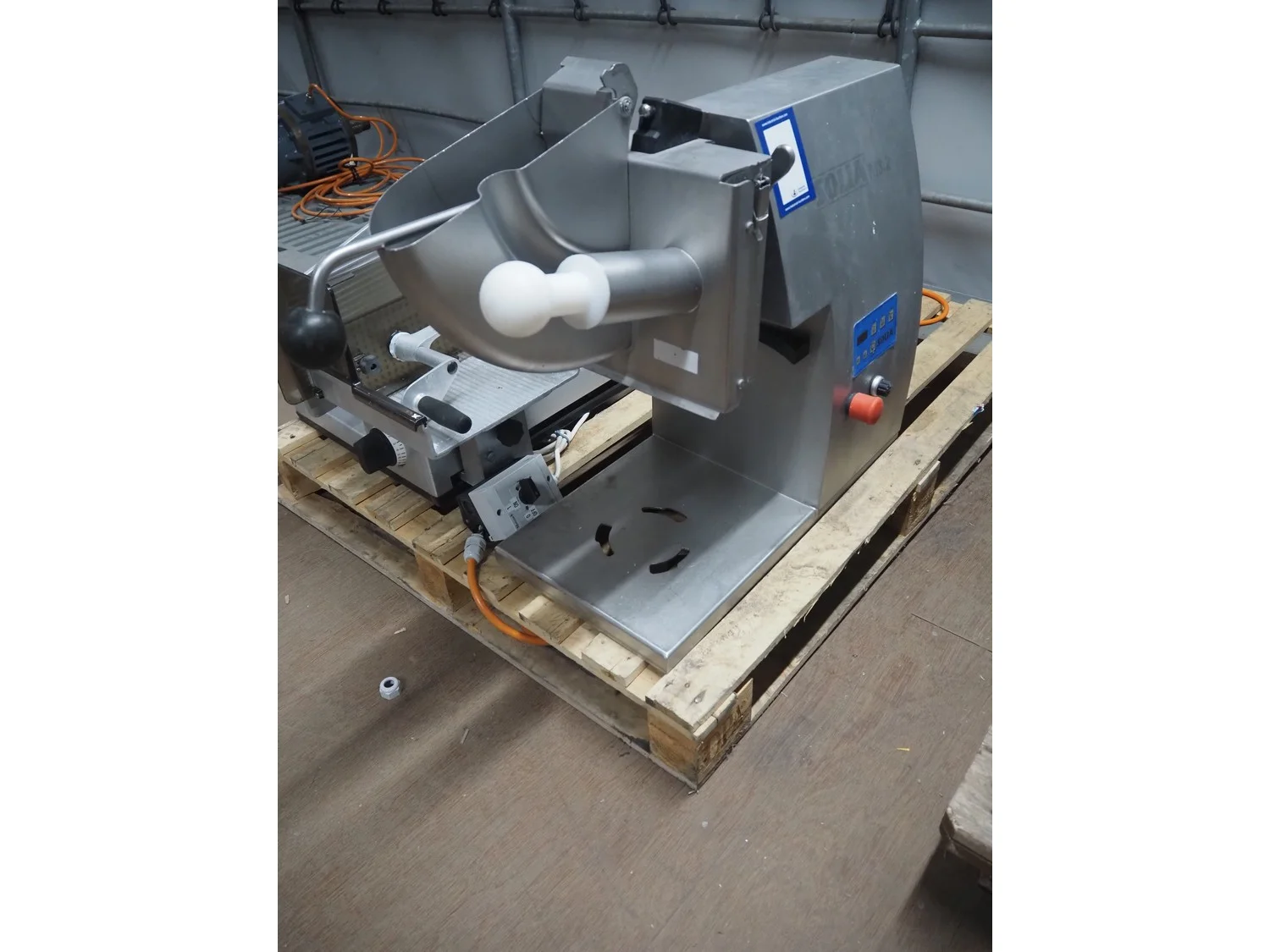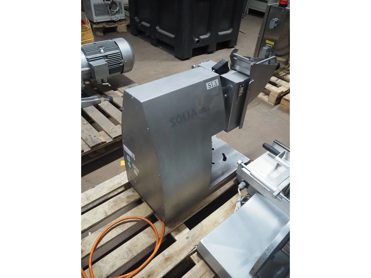 Solia slicer, type: M3.2, 400 V, 50 Hz, dimensions: 850 mm x 310 mm x 600 mm. Missing knife.