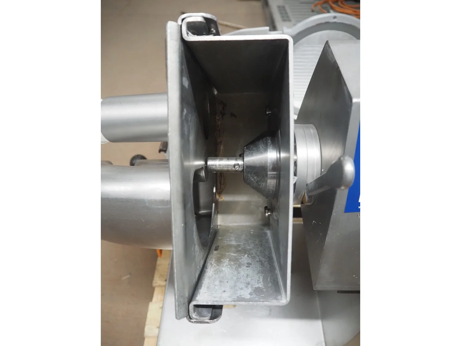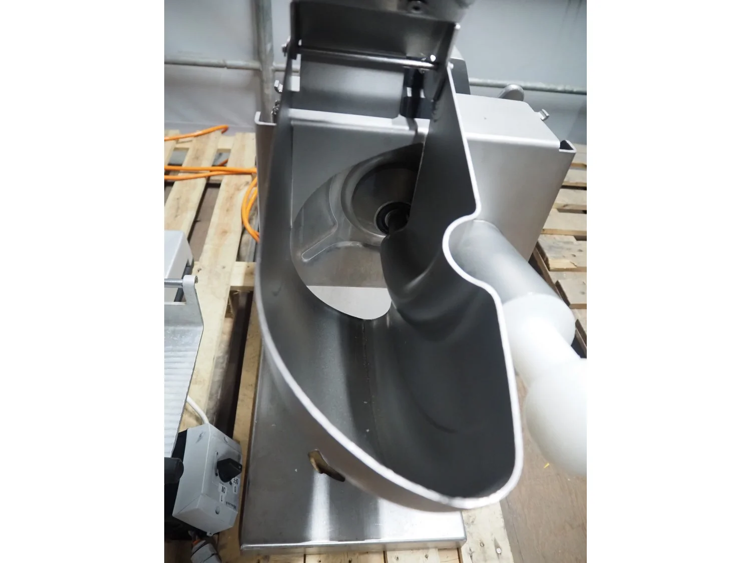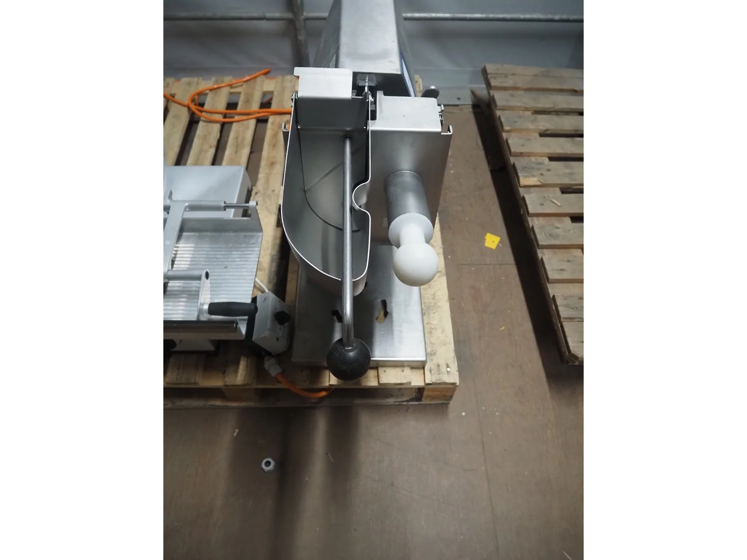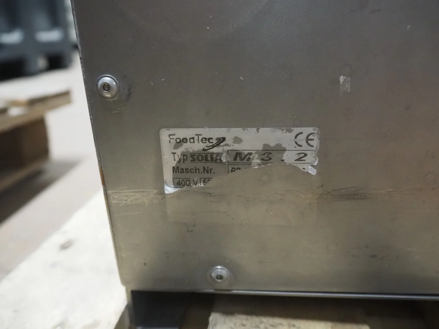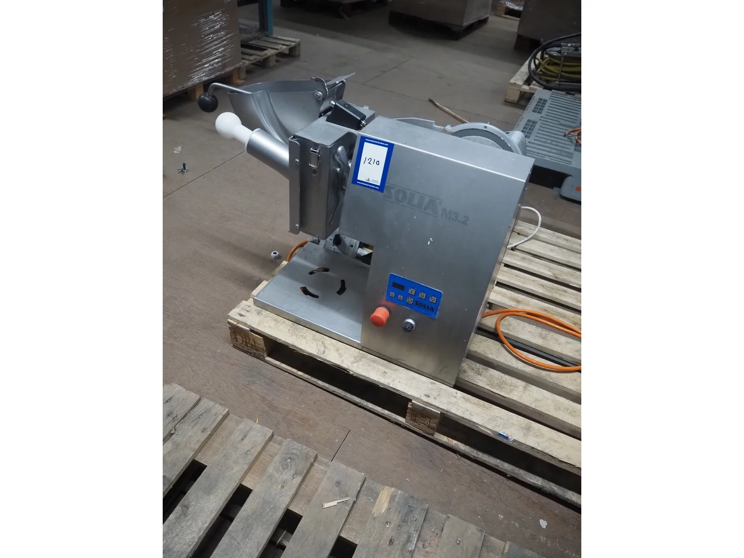 Solia slicer, type: M3.2, 400 V, 50 Hz, dimensions: 850 mm x 310 mm x 600 mm. Missing knife.