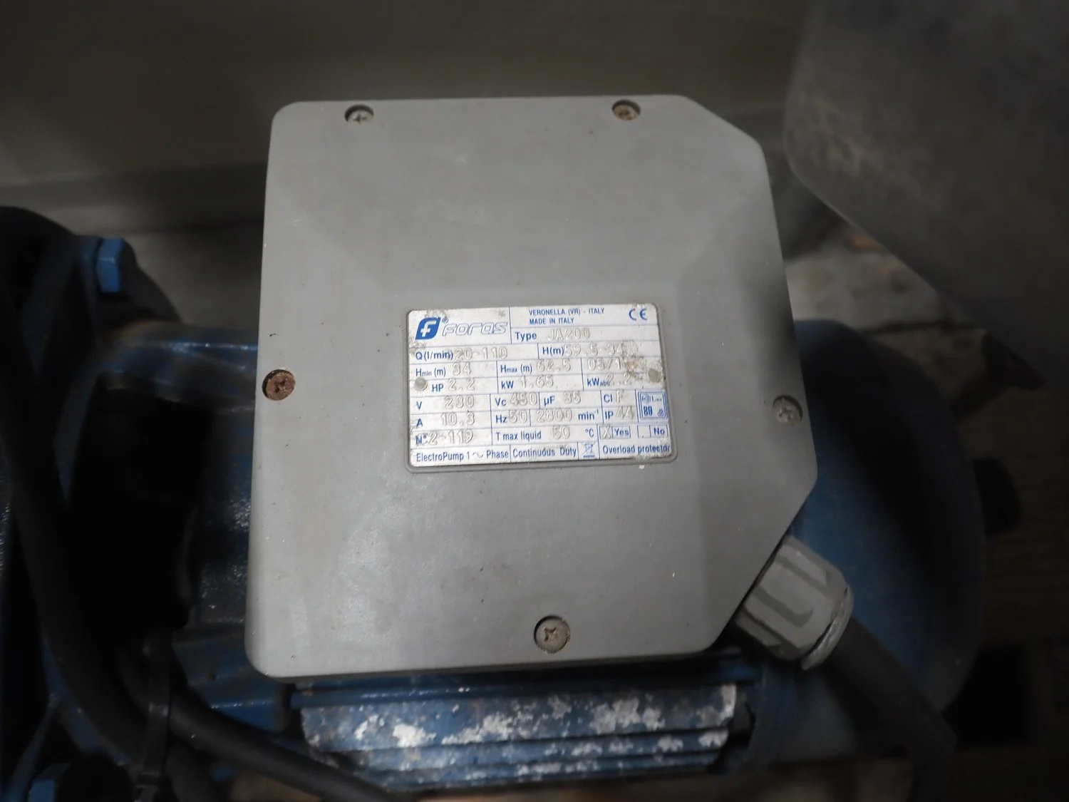 Foras self priming jet water pump, type: JA200, year of construction: 05/11, 230 V, 50 Hz, 10.3 A, 1.65 kW, capacity: 20-110 liter / minute, dimensions: 650 mm x 220 mm x 480 mm.