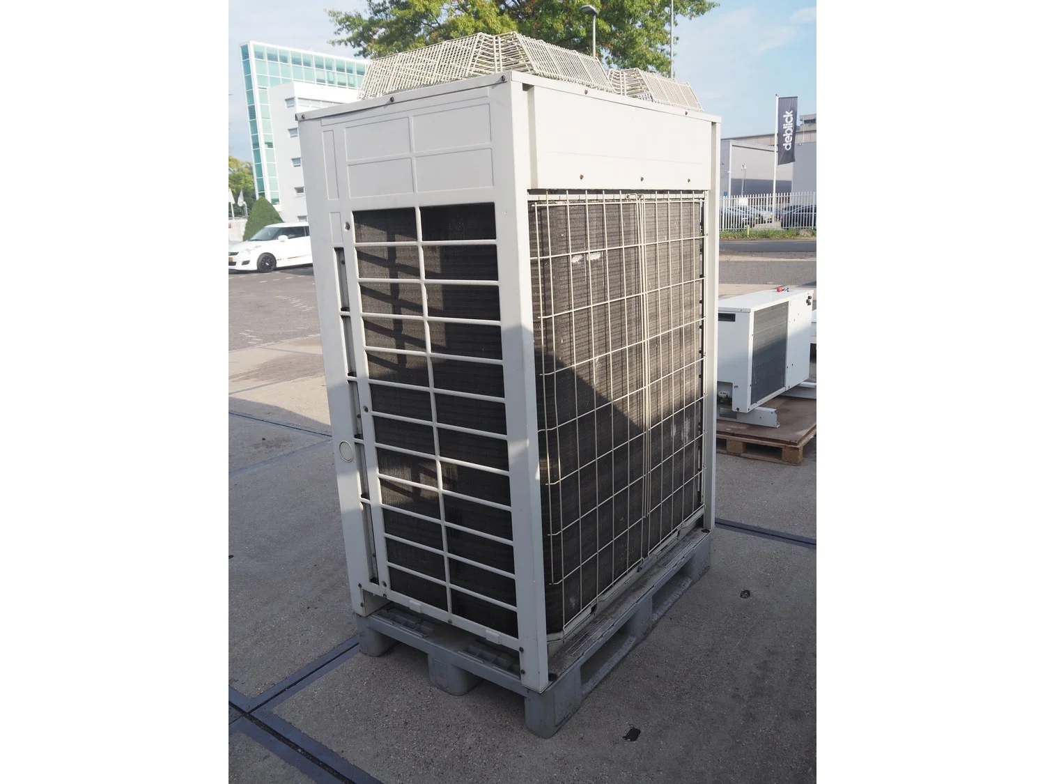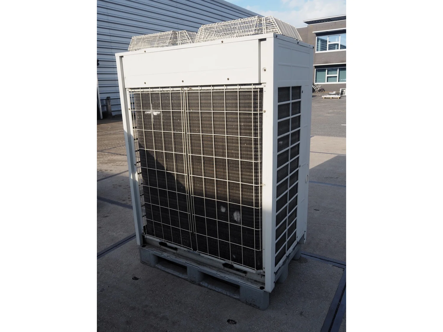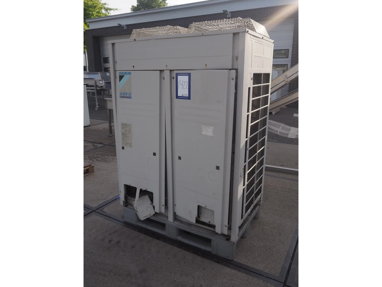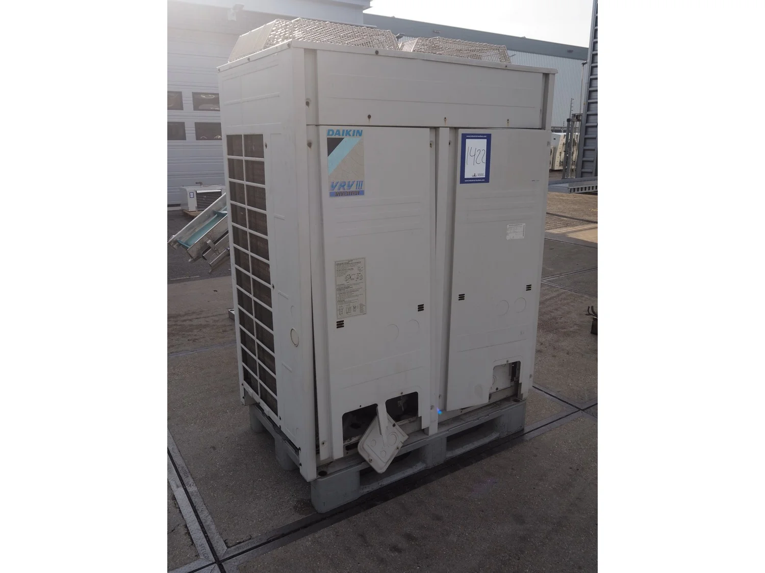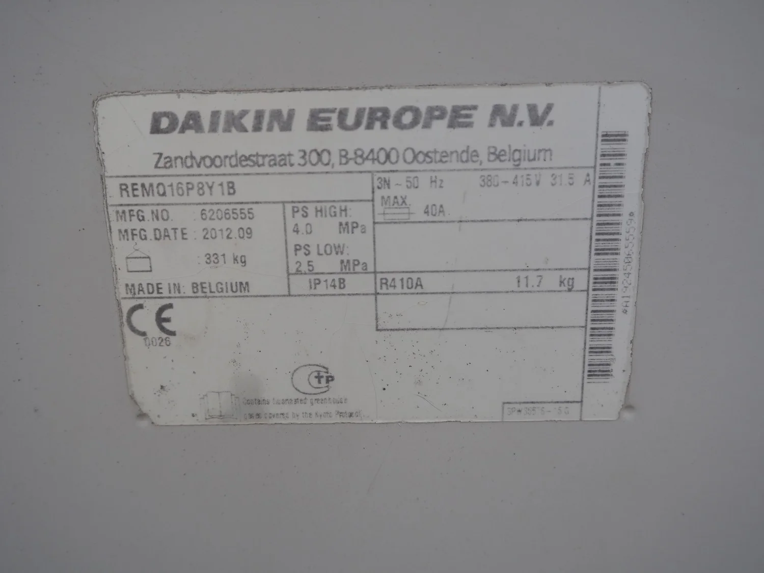 Daikin roof condenser, type: REMQ16P8Y1B, year of construction: 09/2012, 380-415 V, 3 Ph, 50 Hz, refrigerant: R410A, 2 fans, dimensions: 1250 mm x 780 mm x 1700 mm.