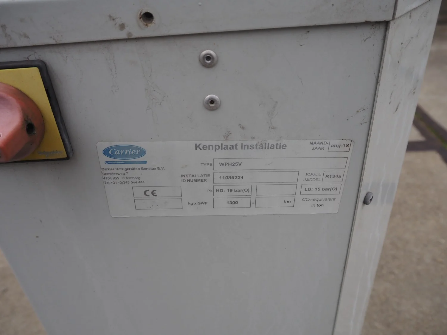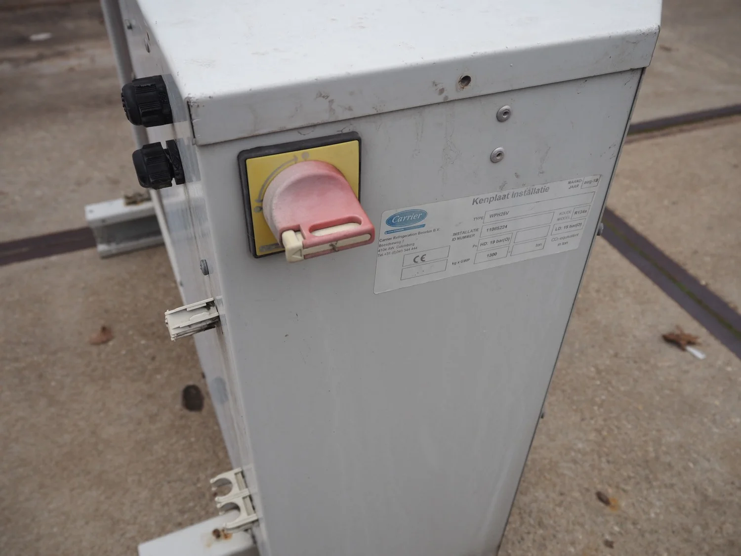 Carrier outside unit for airconditioning, type: WPH25V, number: 11085224, year of construction: 2018, refrigerant: R134a, dimensions: 1150 mm x 500 mm x 750 mm.