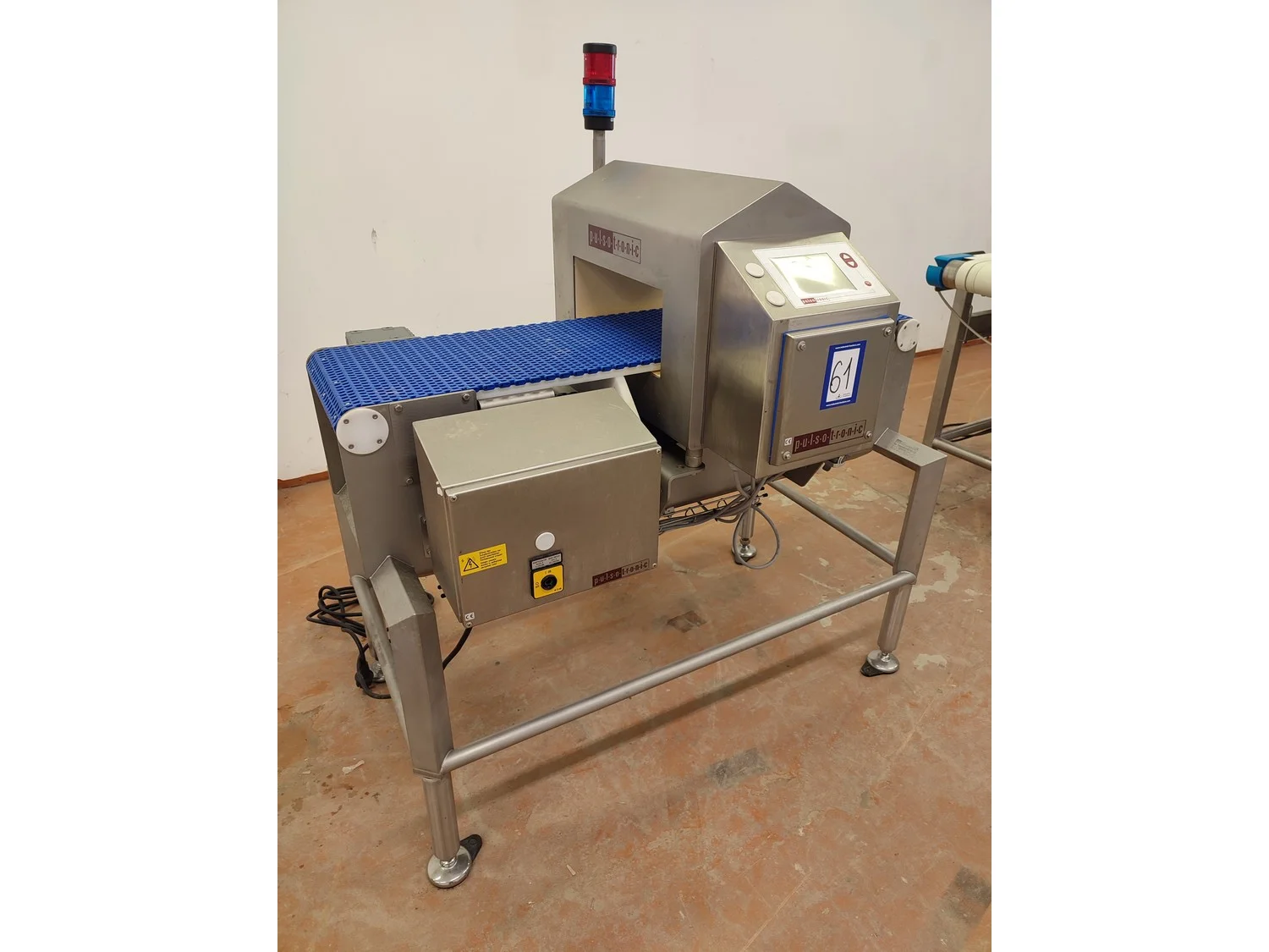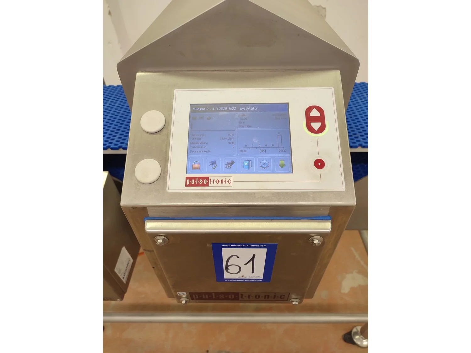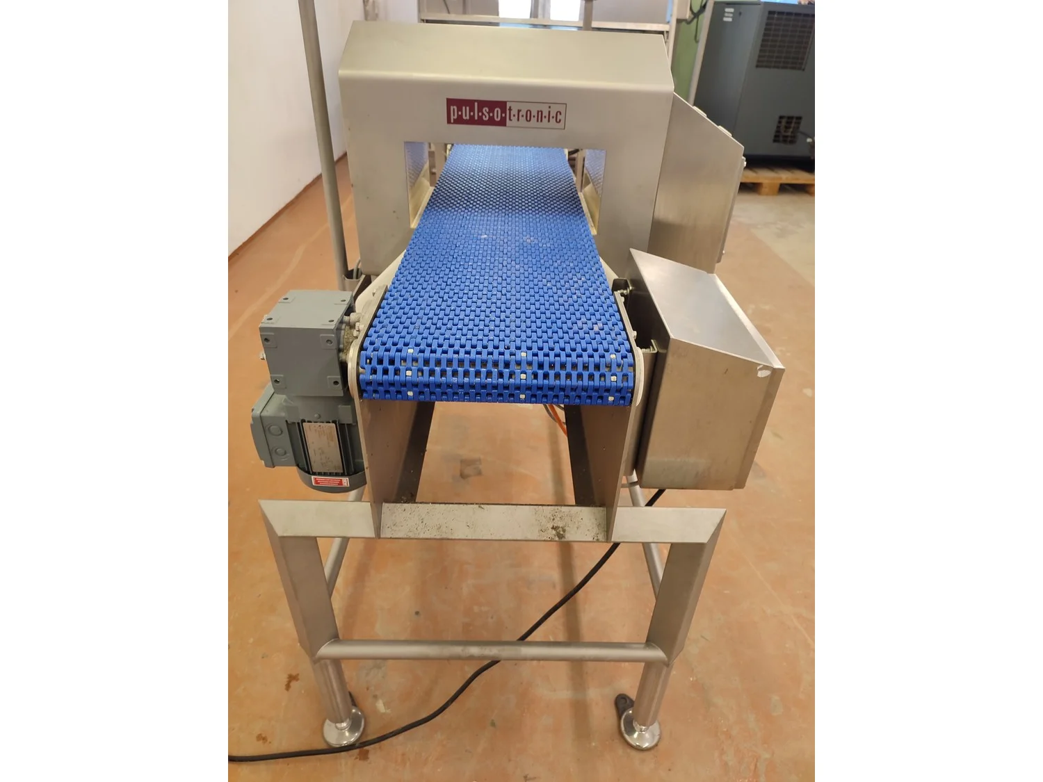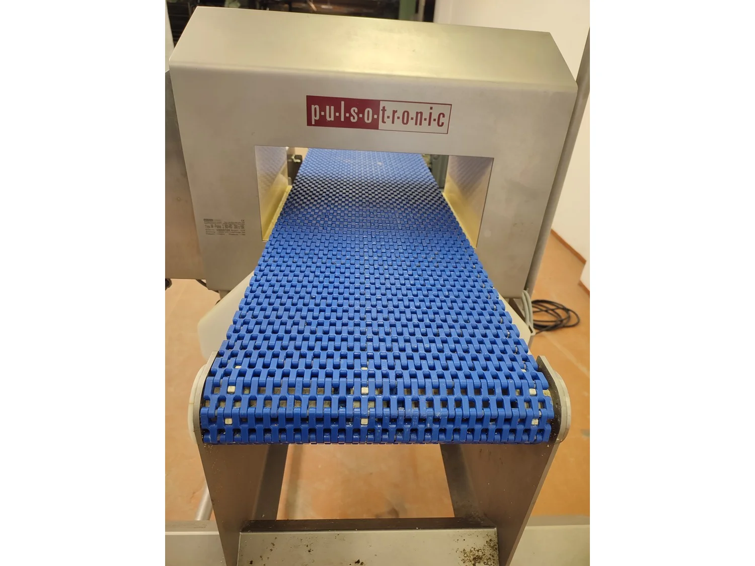 Pulsotronic metal detector, type: M-Pulse 2 BD-HD 350 x 150, serial number: 90006199, year of construction: 2016, 115/230 V, 1 Ph, 50/60 Hz, max 16 A, plastic mesh belt, belt width: 300 mm, clearance: 340 mm x 120 mm, total dimensions: 1200 mm x 820 mm x 1365 mm.