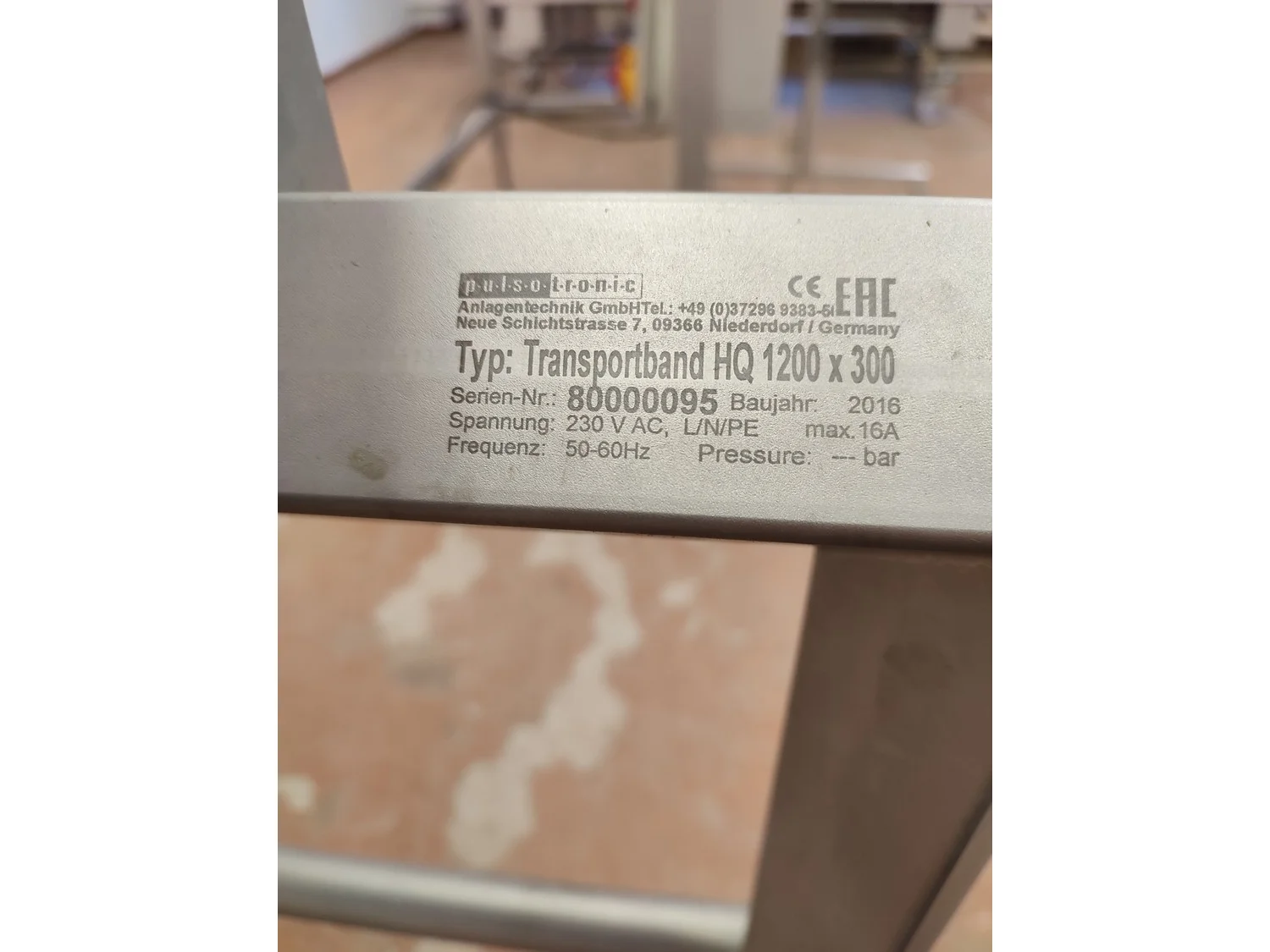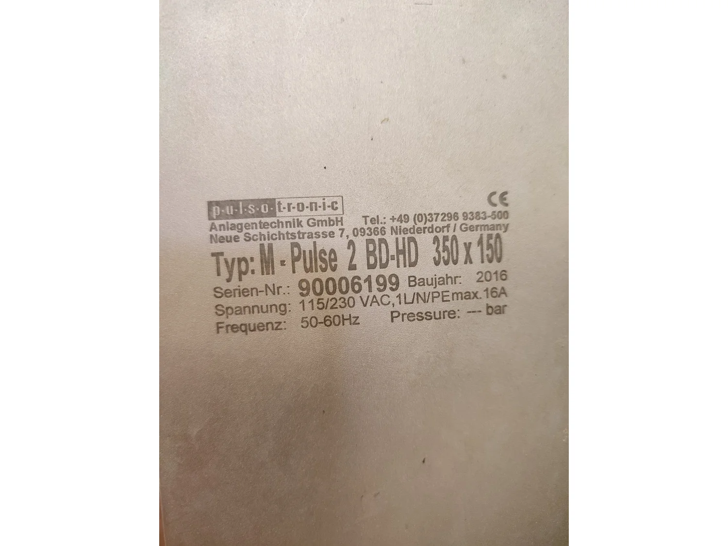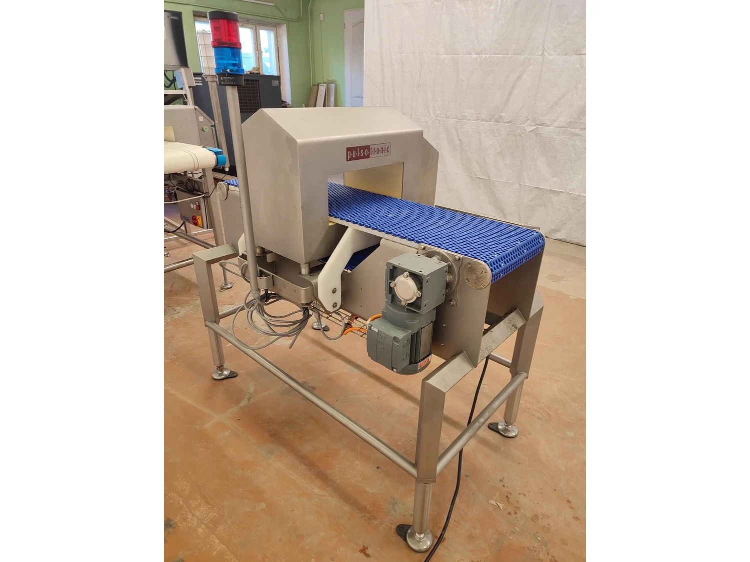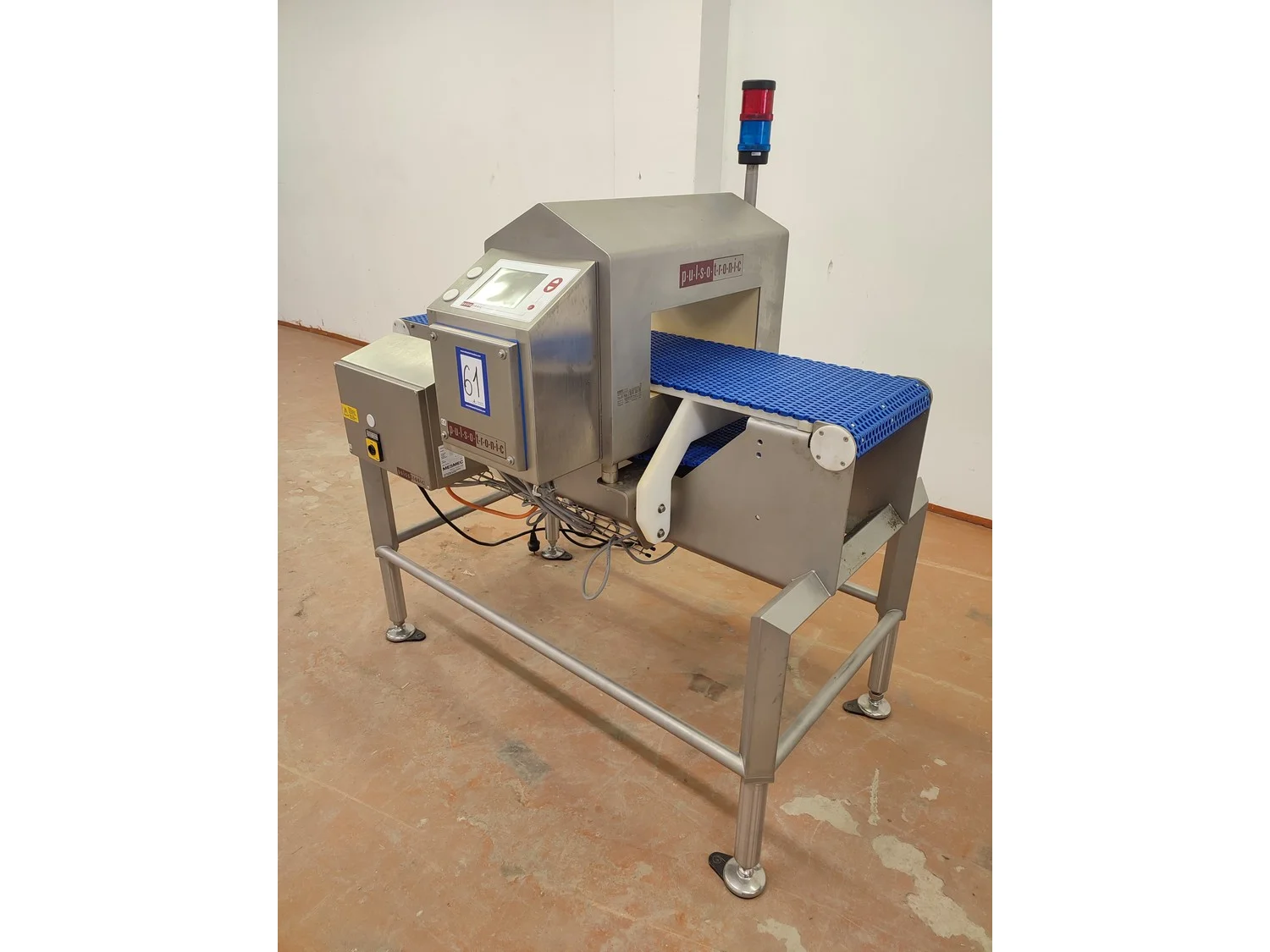 Pulsotronic metal detector, type: M-Pulse 2 BD-HD 350 x 150, serial number: 90006199, year of construction: 2016, 115/230 V, 1 Ph, 50/60 Hz, max 16 A, plastic mesh belt, belt width: 300 mm, clearance: 340 mm x 120 mm, total dimensions: 1200 mm x 820 mm x 1365 mm.