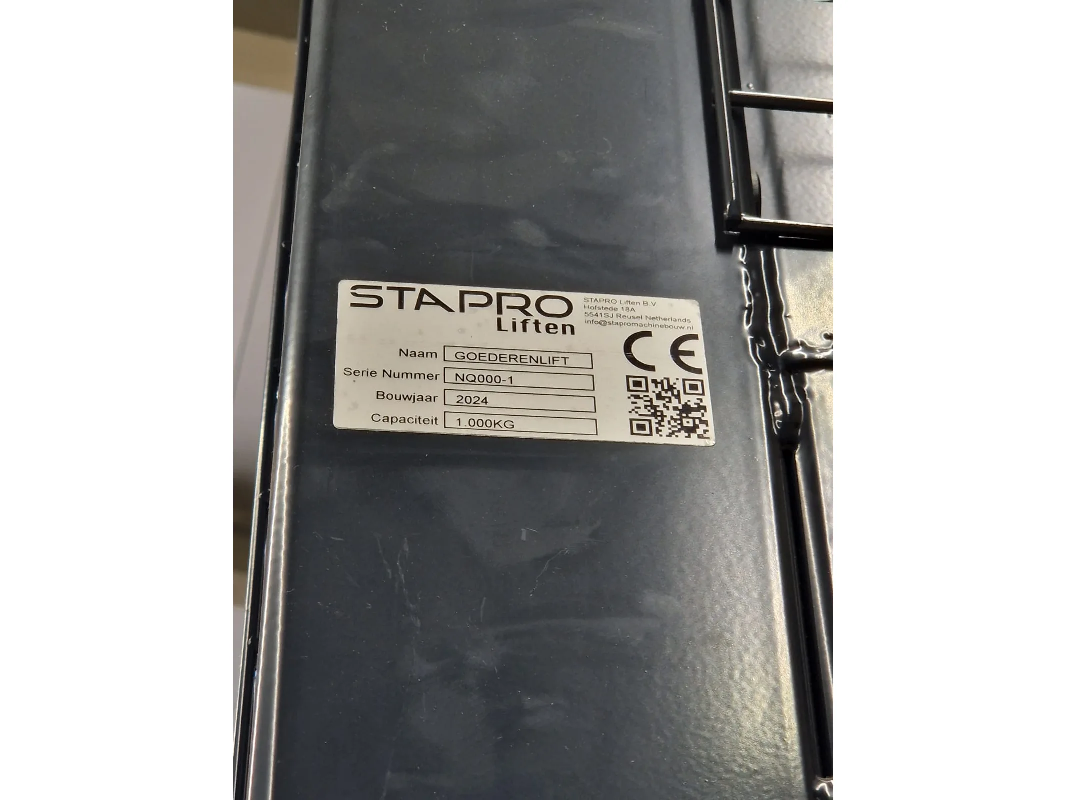 STAPRO Liften B.V. goods elevator, serial number: NQ000-1, year of construction: 2024, capacity: 1000 kg, lifting height: 3500 mm, total dimensions: 3100 mm x 1450 mm x 5200 mm. Lot located on other location in Born (NL). Viewing and pick-up in consultation with Industrial Auctions BV.