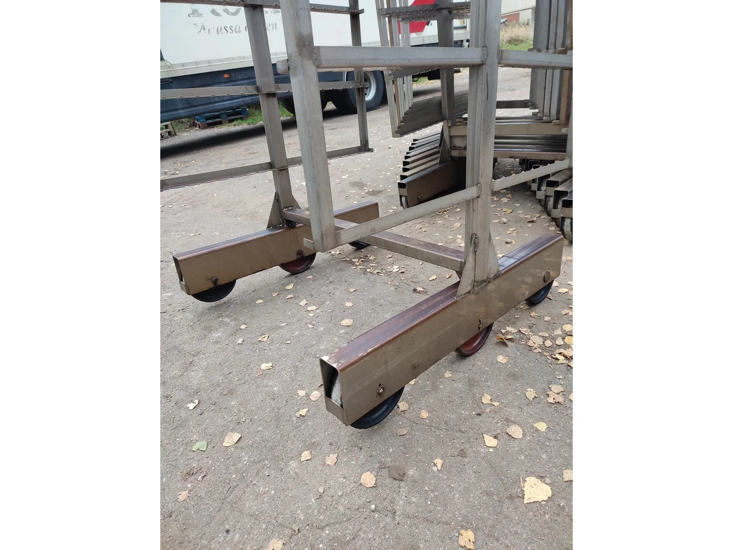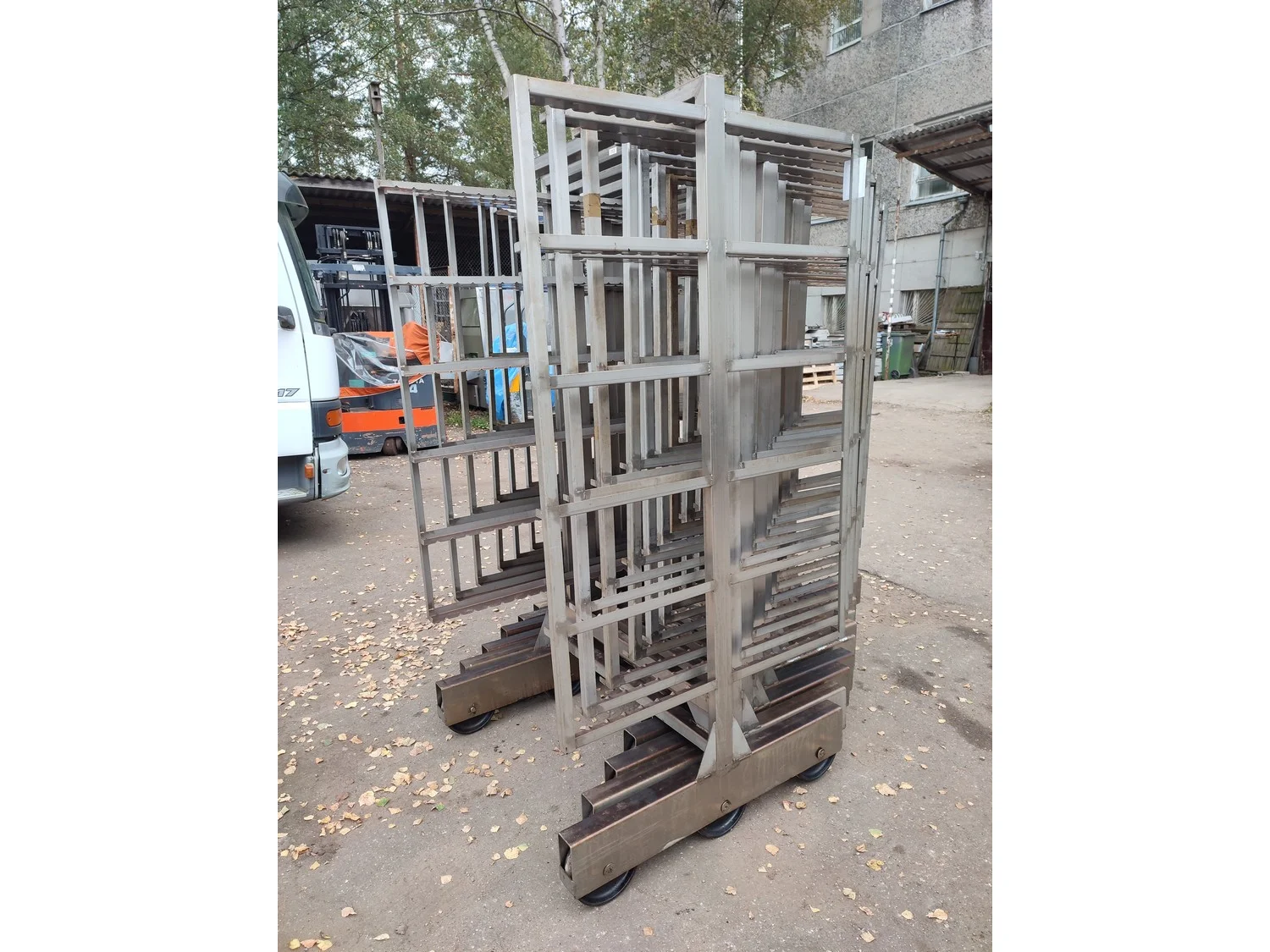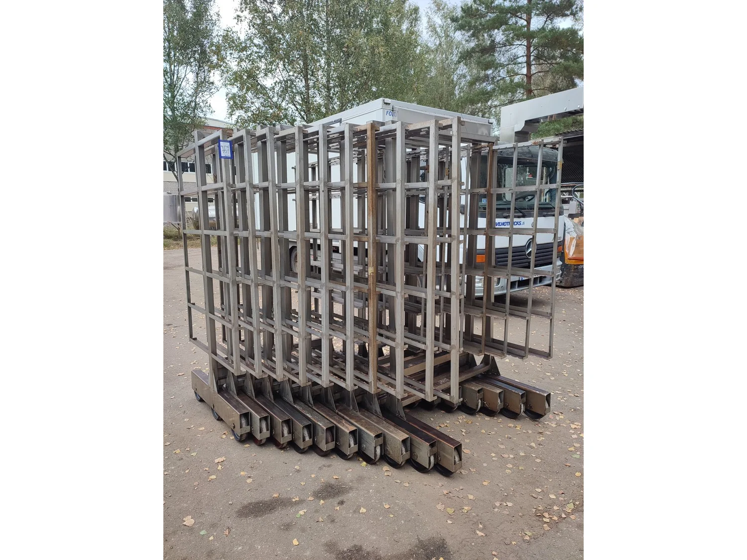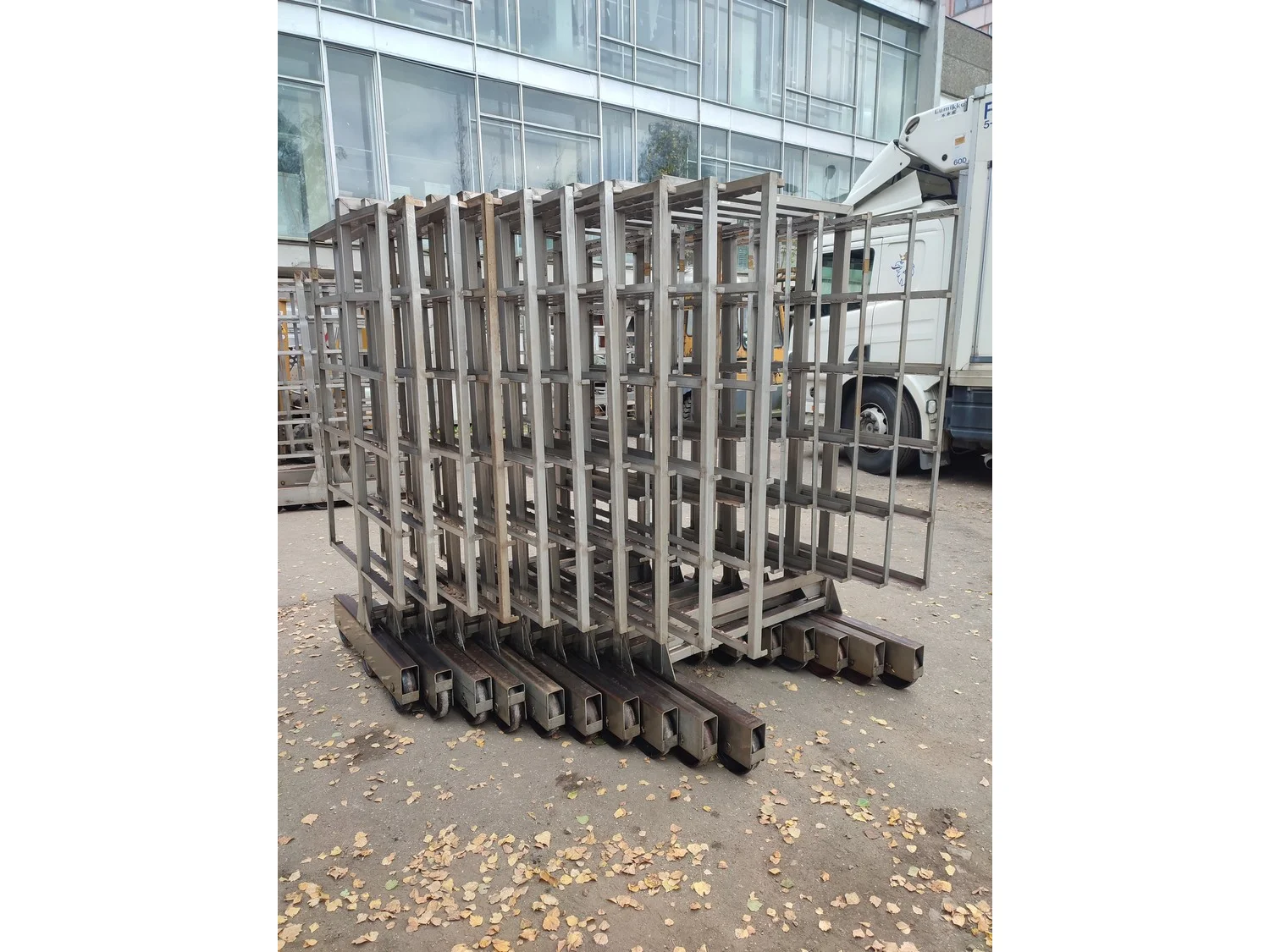 10 s/s smoke trolleys, 6 floors each, dimensions each floor: 1015 mm x 995 mm, total dimensions: (10x) 1020 mm x 1000 mm x 2000 mm.