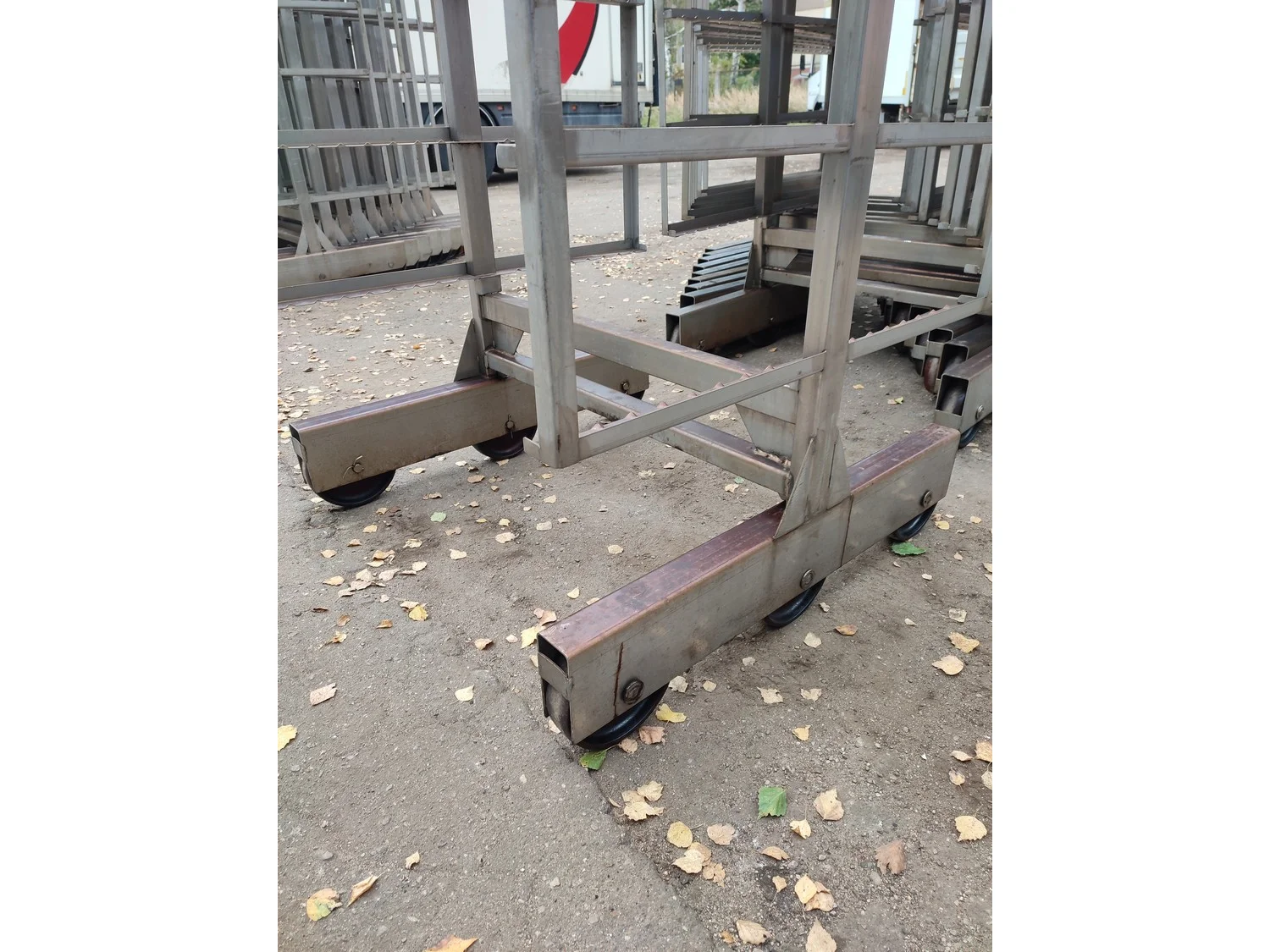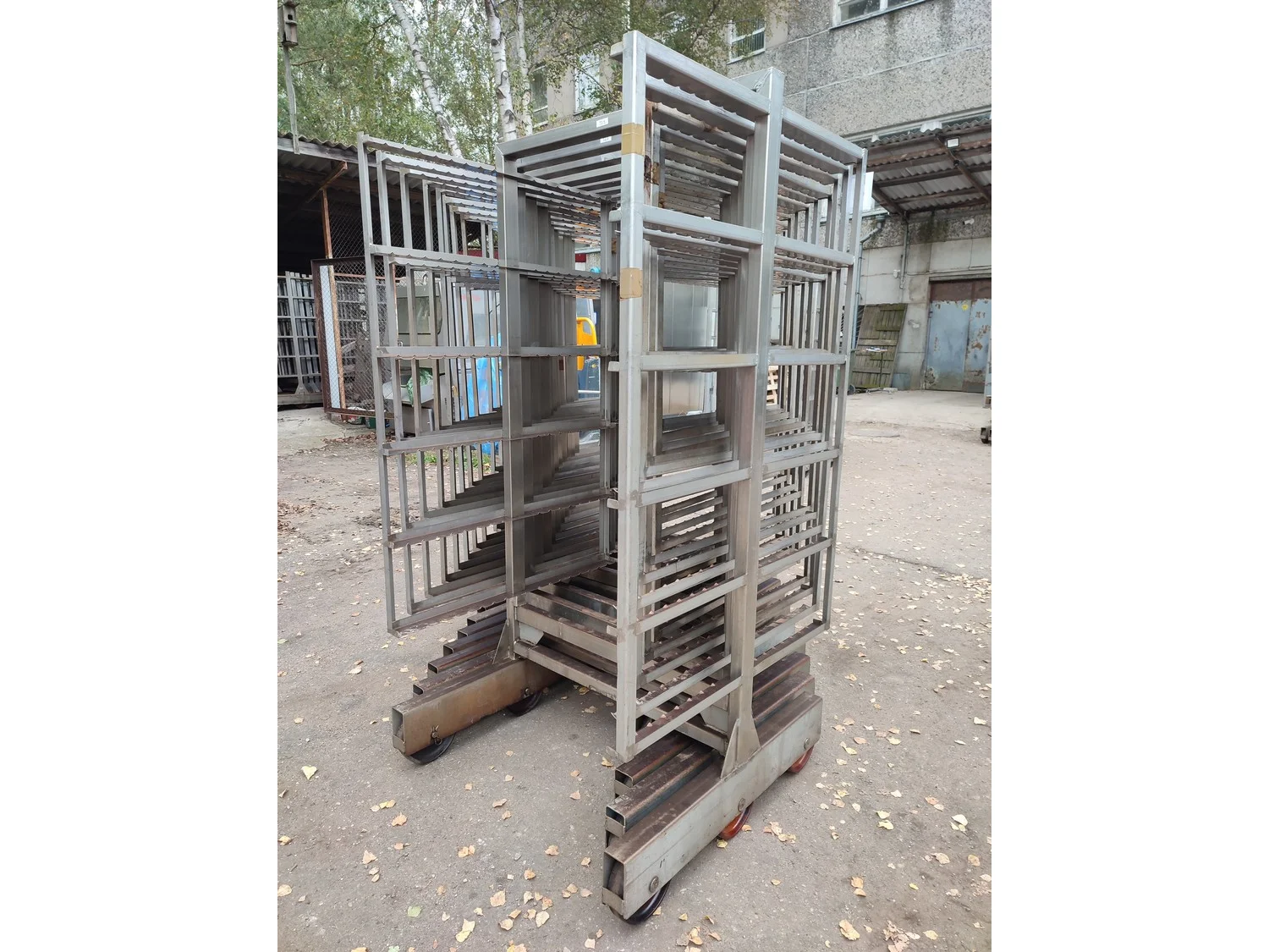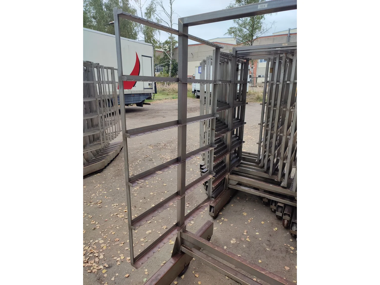 10 s/s smoke trolleys, 6 floors each, dimensions each floor: 1015 mm x 995 mm, total dimensions: (10x) 1020 mm x 1000 mm x 2000 mm.