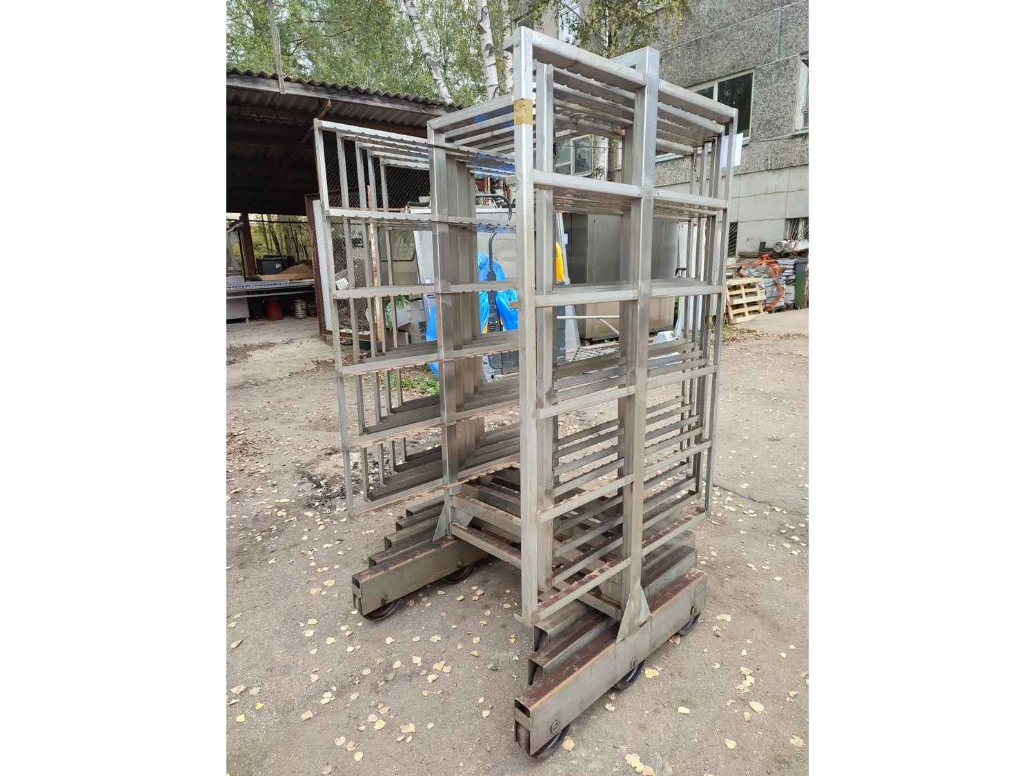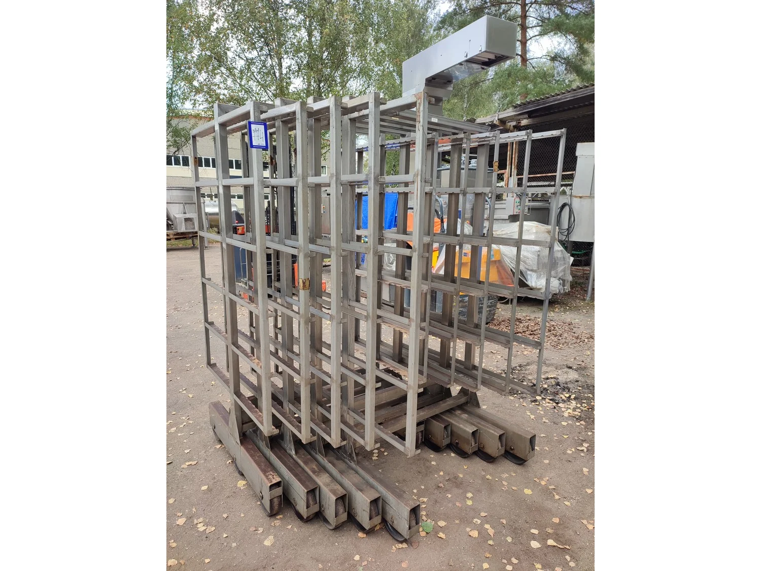 5 s/s smoke trolleys, 6 floors each, dimensions each floor: 1015 mm x 995 mm, total dimensions: (5x) 1020 mm x 1000 mm x 2000 mm.
