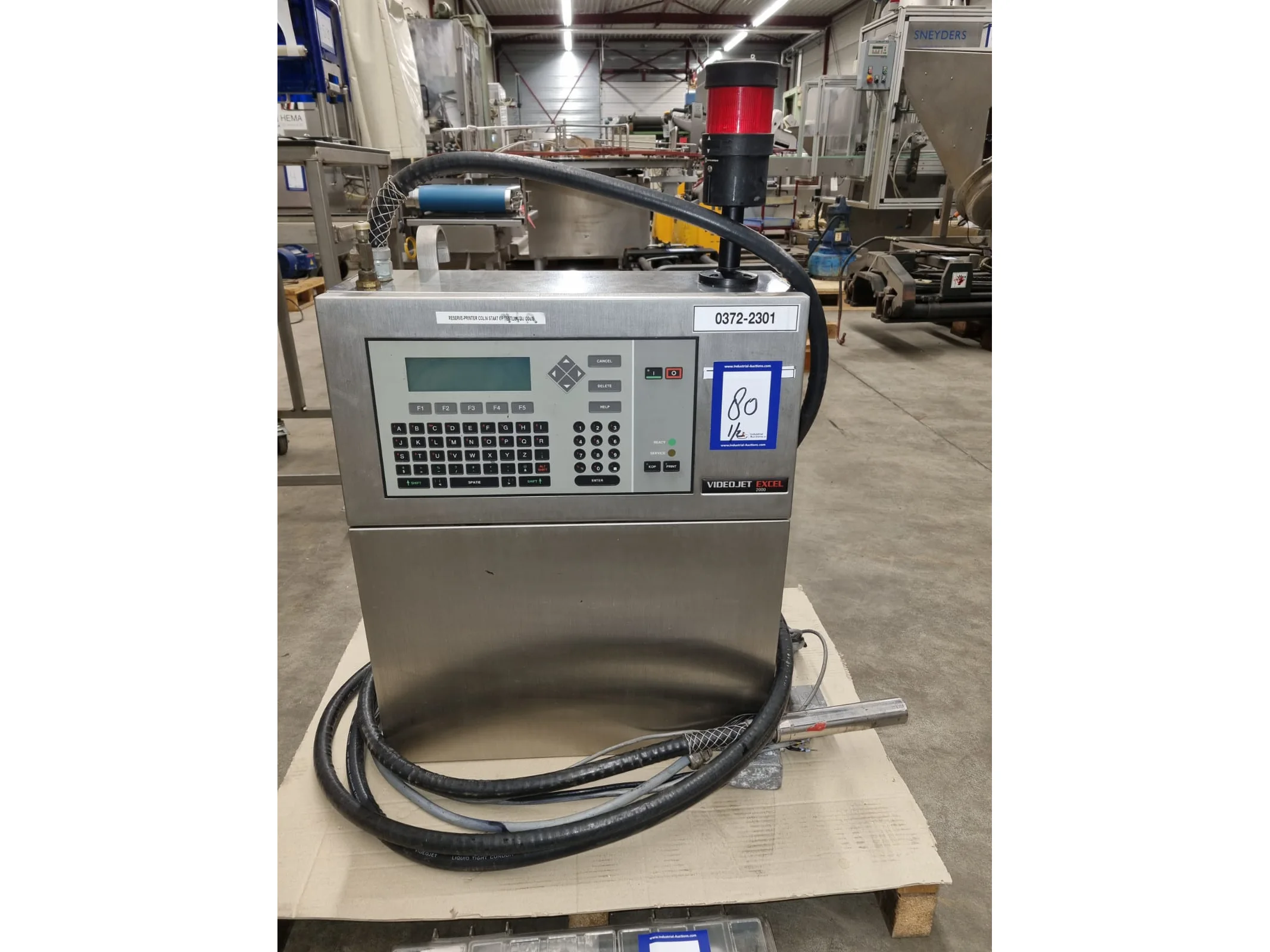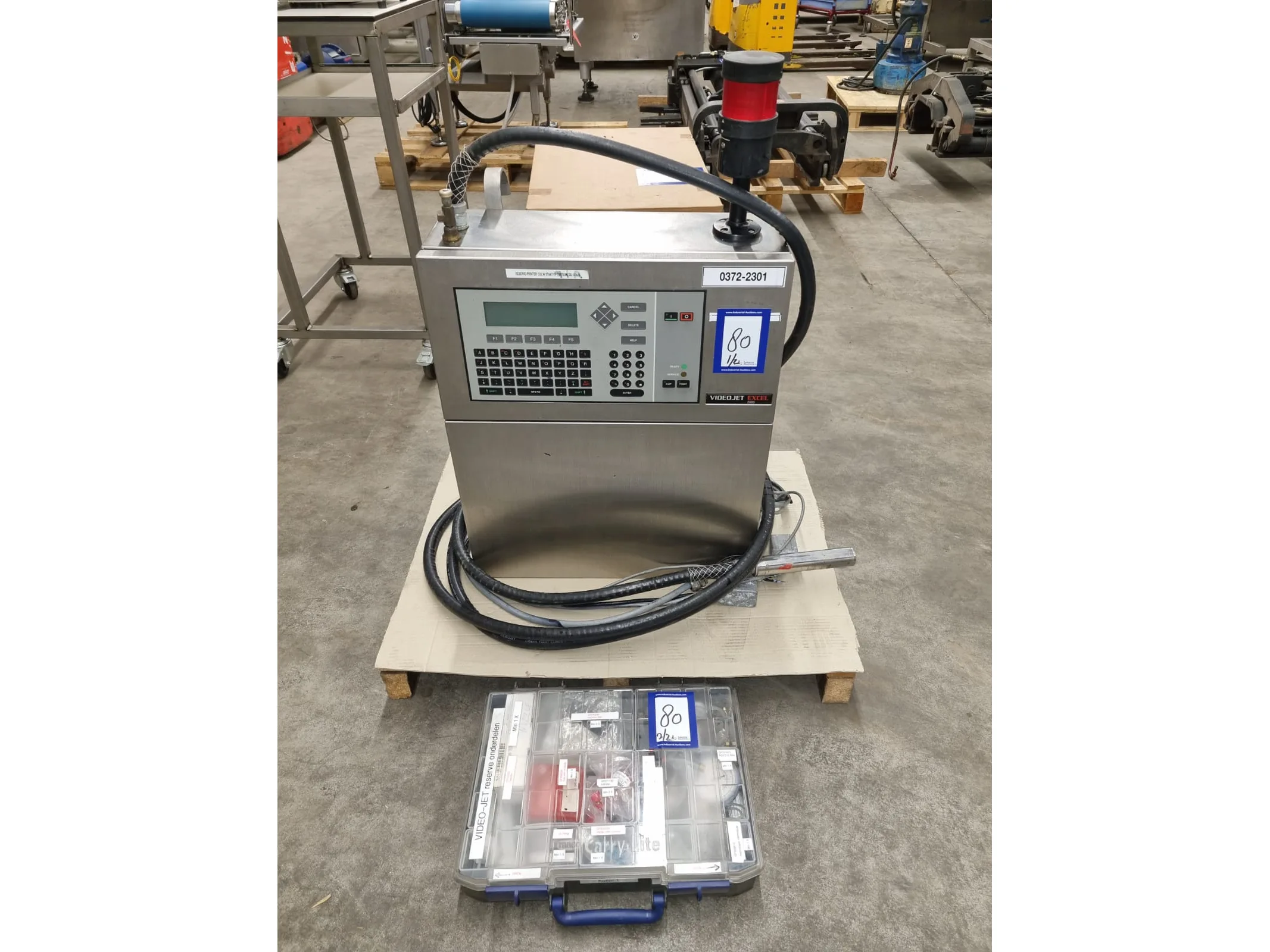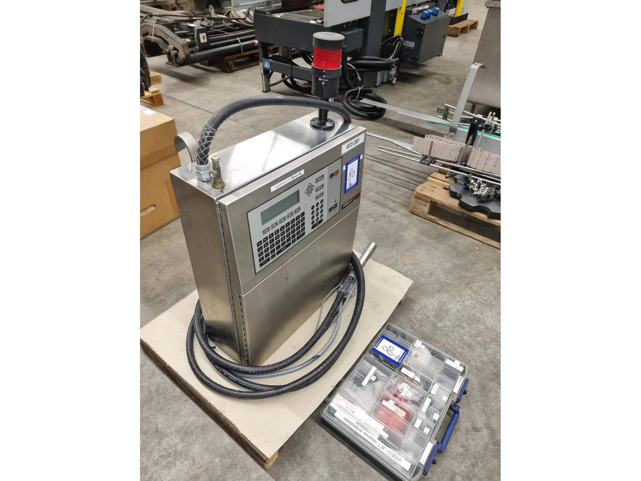Videojet inkjet printer, model: EXCEL 2000, serial number: 051521014WD, 100-240 V, 1 Ph, 50/60 Hz, 2-1 A, dimensions: 800 mm x 600 mm x 900 mm. Including box with repair set.