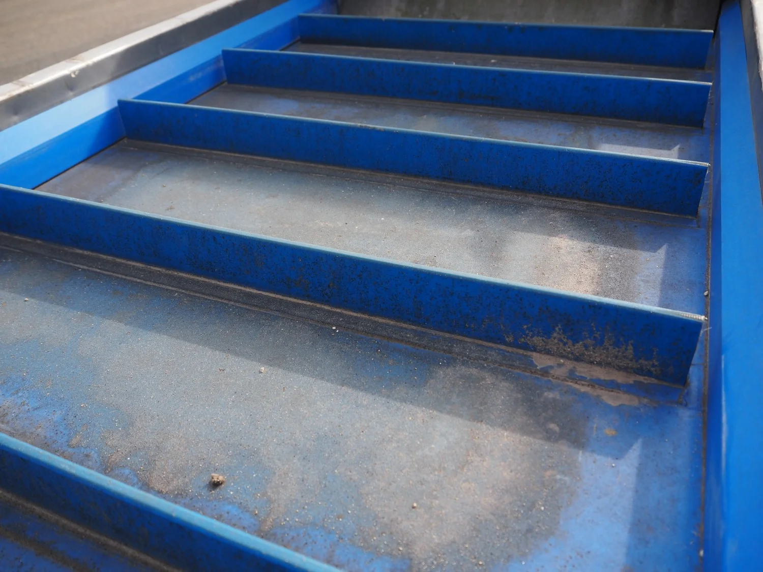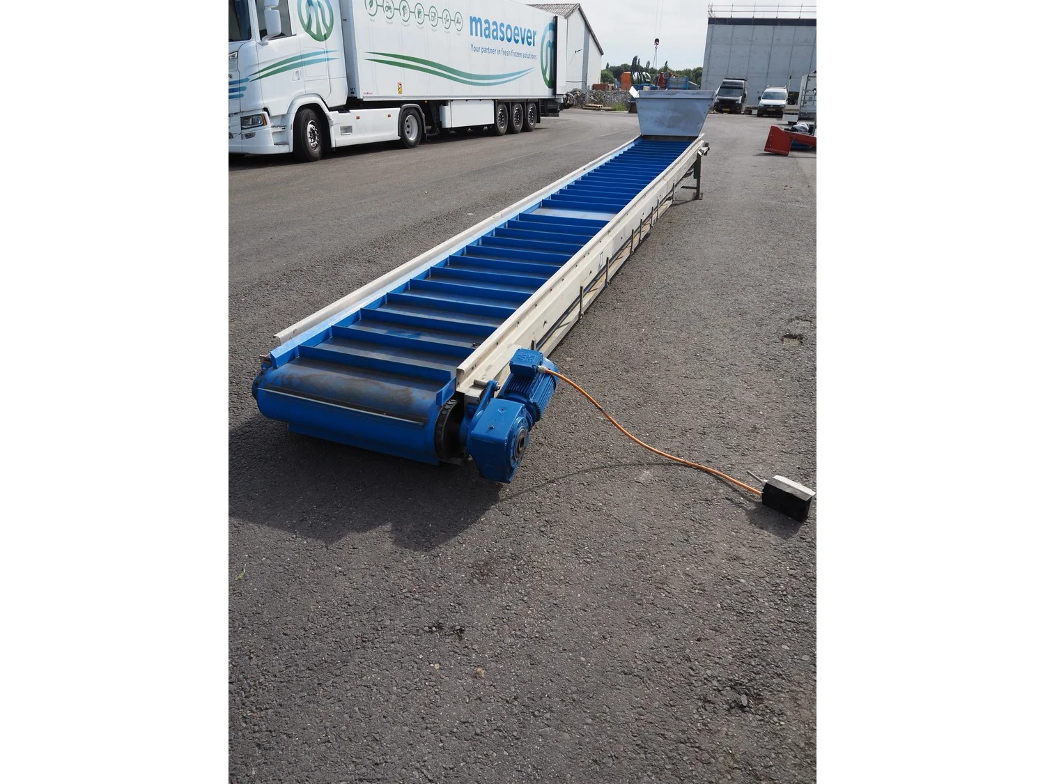 Elevating belt, plastic belt with dividers, belt width: 750 mm, distance between dividers: 240 mm, divider height: 60 mm, total dimensions: 9000 mm x 1200 mm x 1700 mm.