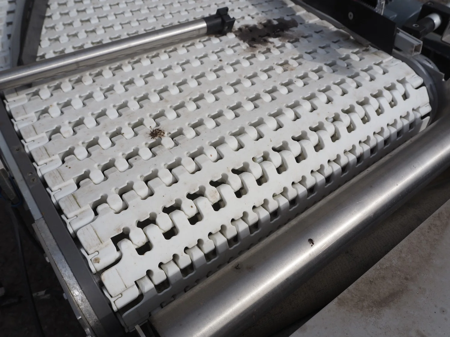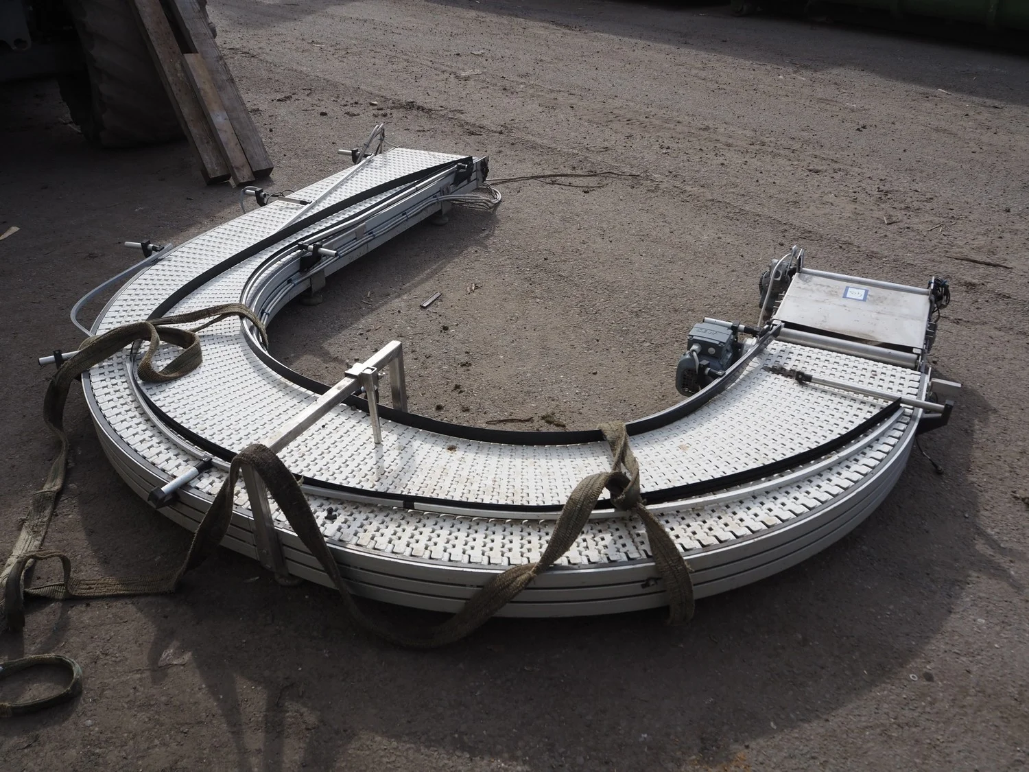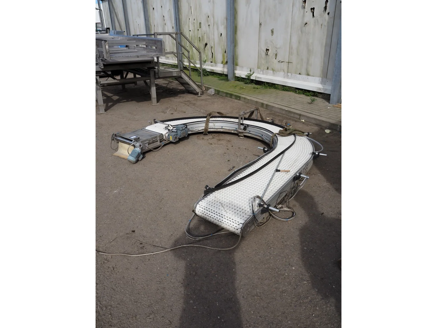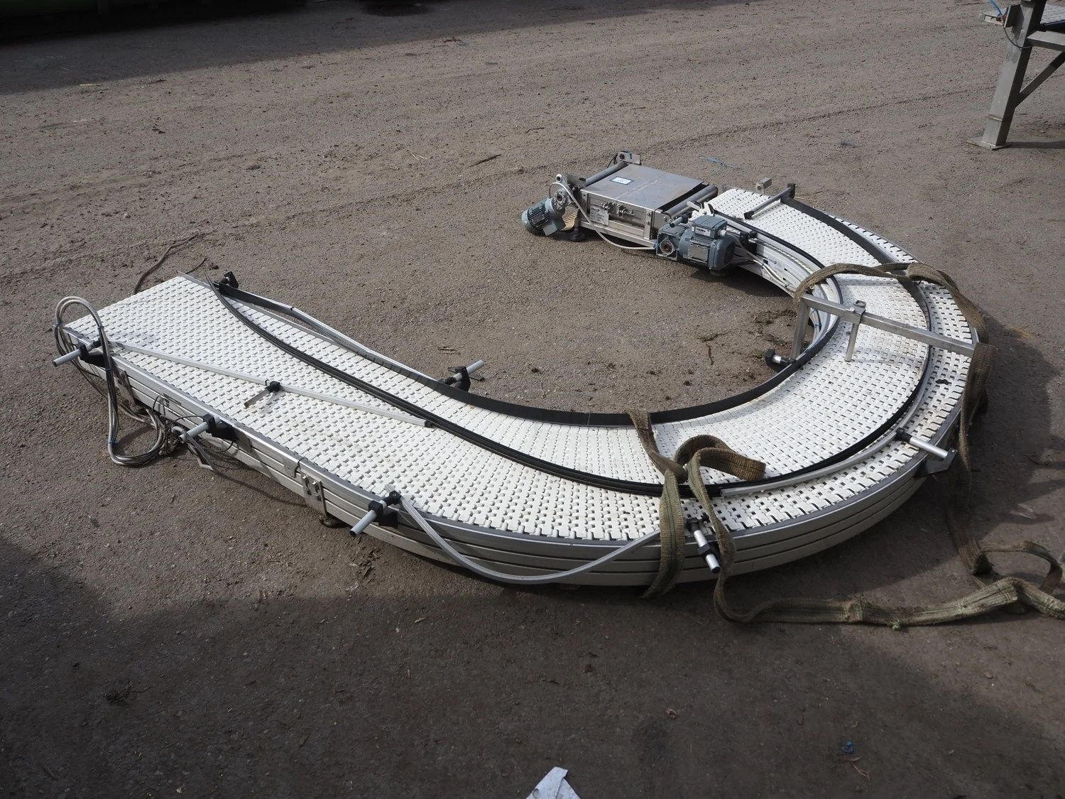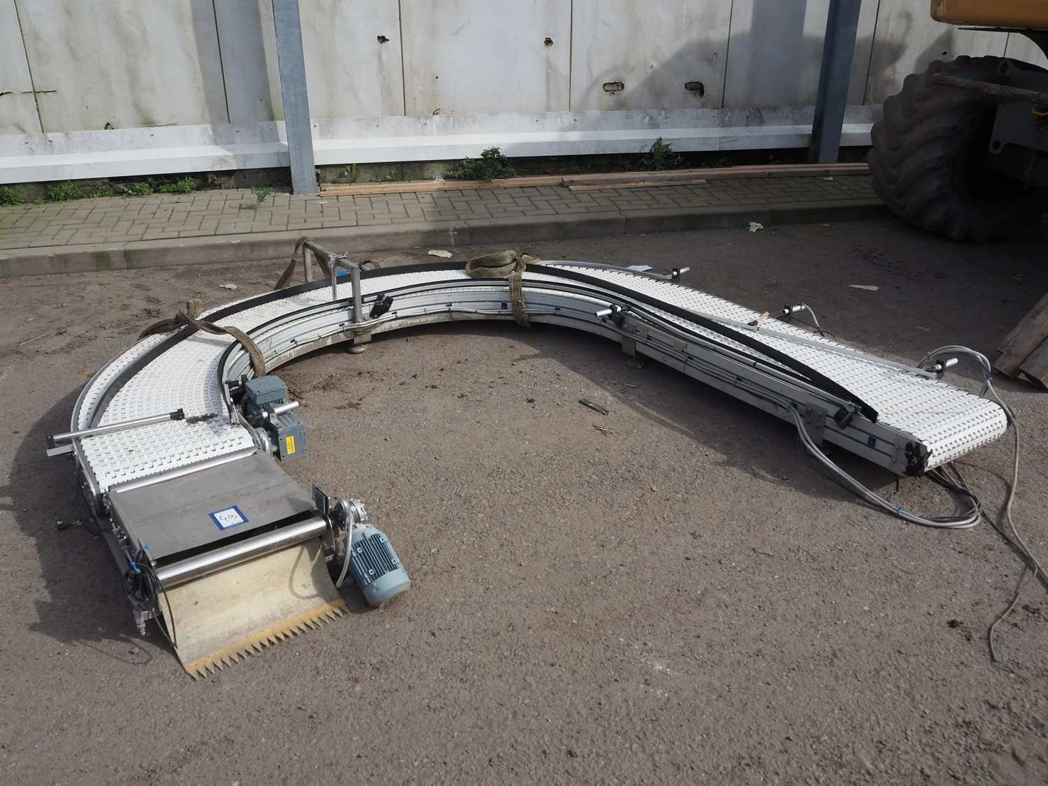 Komatech B.V. 180° curve conveyor, type: Schakel bochtband, serial number: 18648, year of construction: 2024, plastic mesh belt, belt width: 450 mm, total dimensions: 2600 mm x 2900 mm x 300 mm.