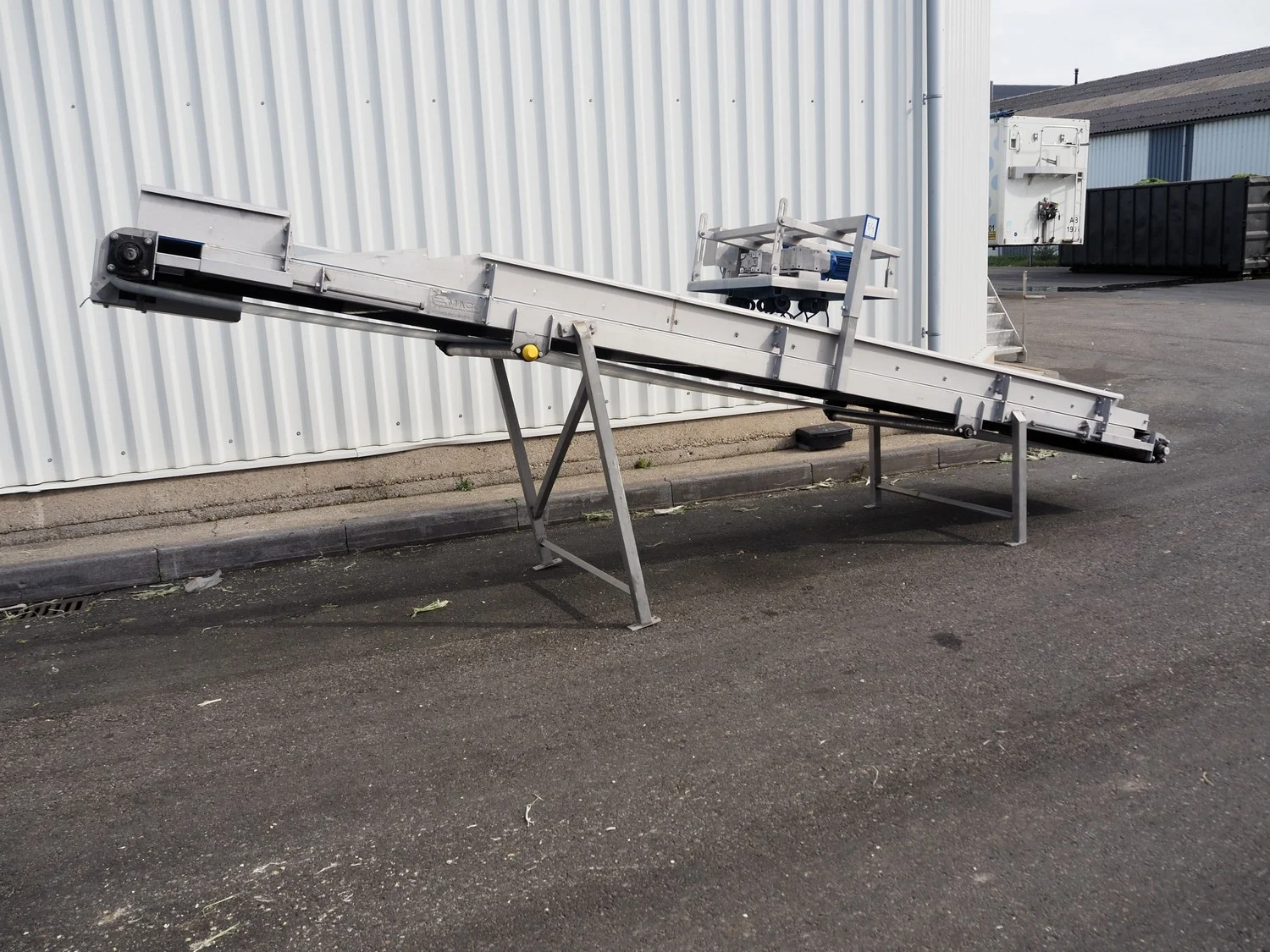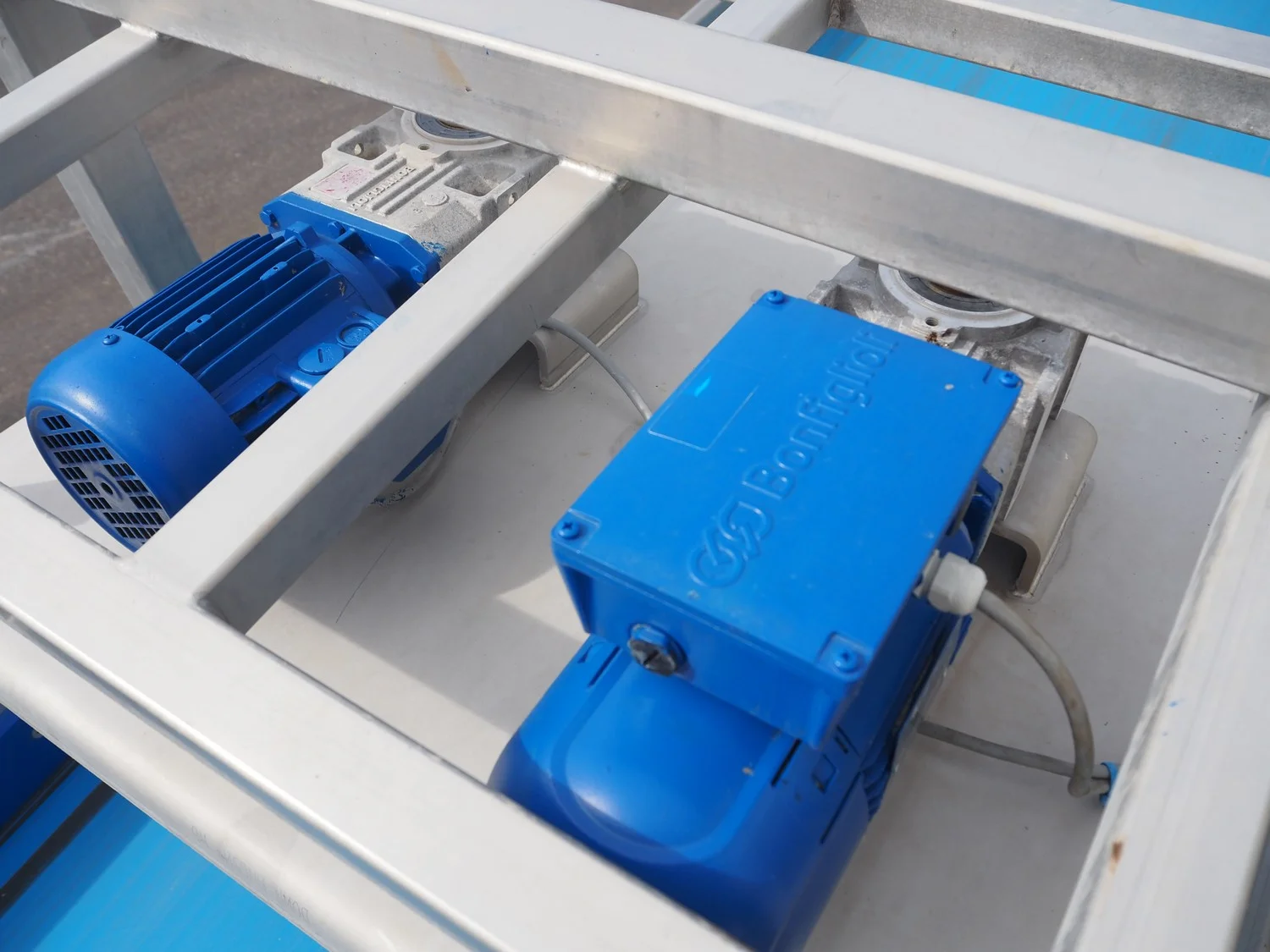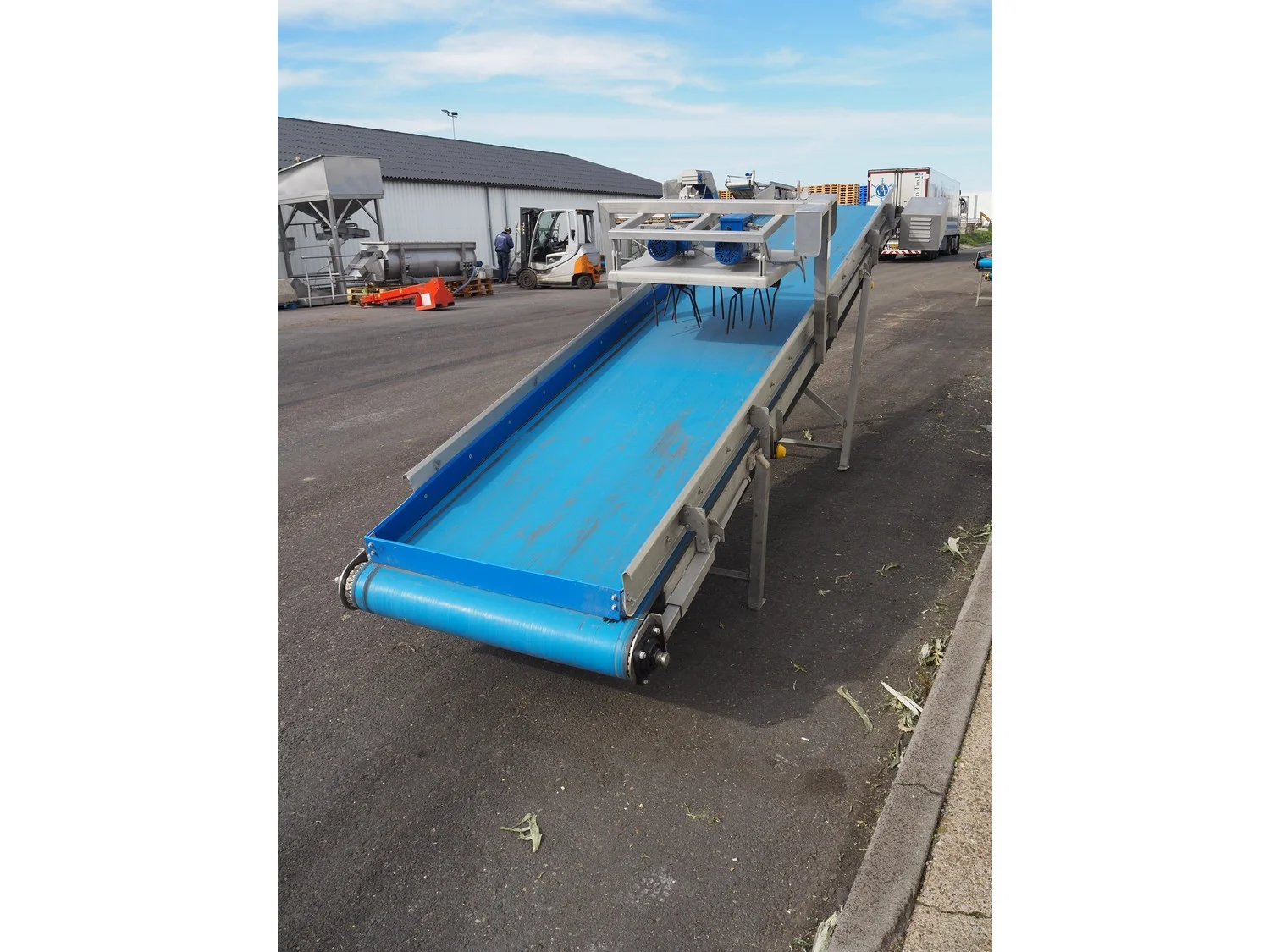 Emaco dividing elevating belt, plastic belt, belt width: 1000 mm, elevating height: 1680 mm, total dimensions: 5200 mm x 1500 mm x 1850 mm.