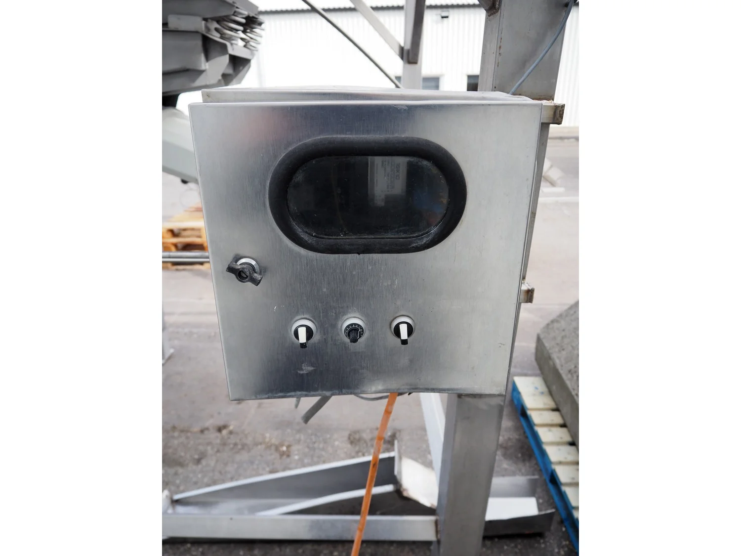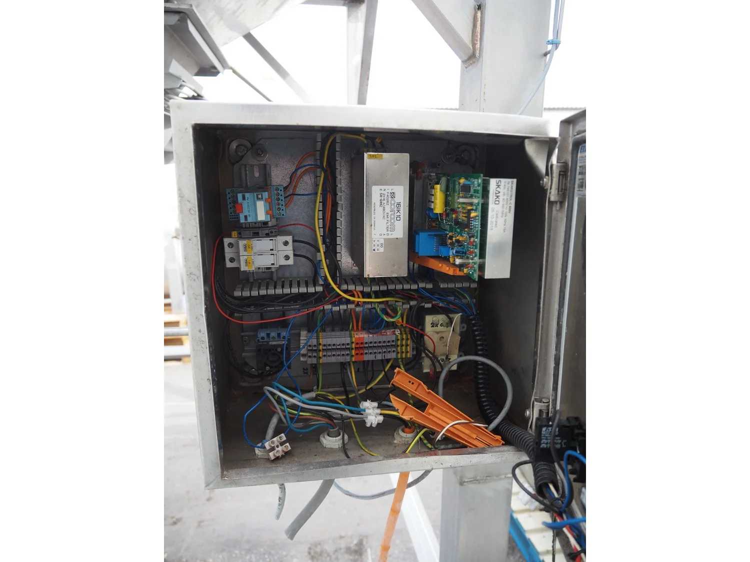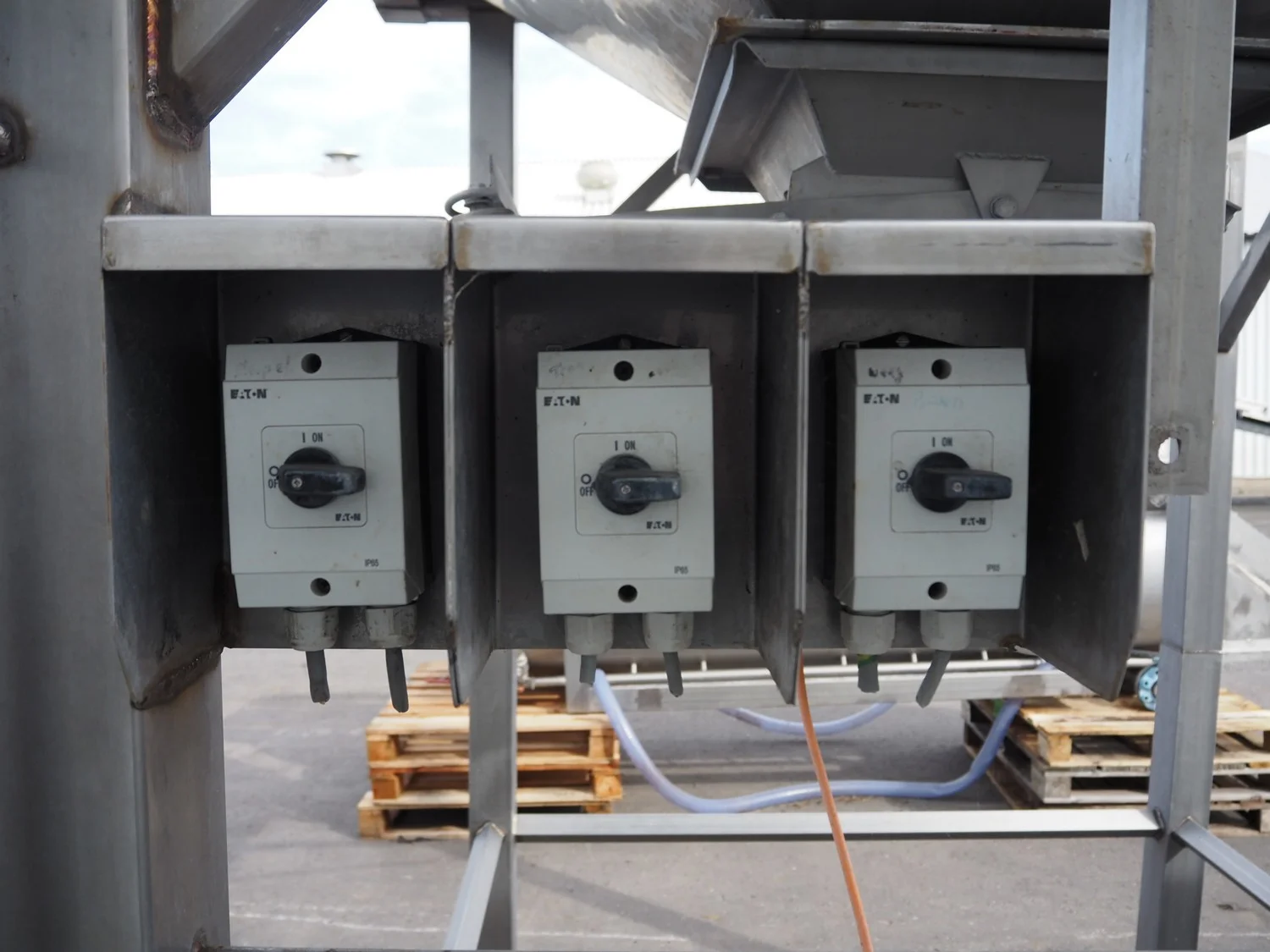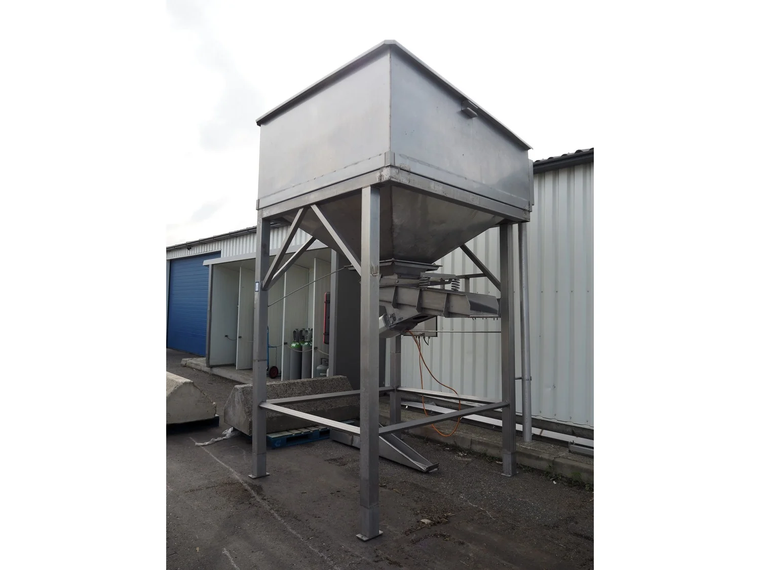 S/s infeed bunker with electromagnetic vibrating outfeed gutter, inside dimensions: 1700 mm x 1800 mm x 1000 mm, gutter width: 400 mm, total dimensions: 2100 mm x 2300 mm x 3650 mm.