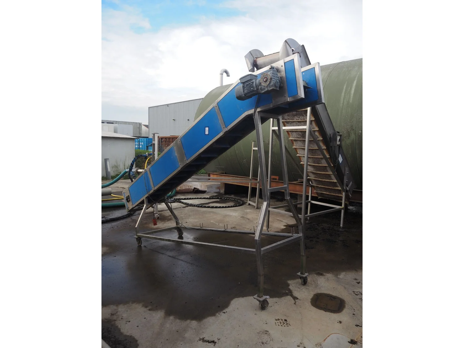 Mobile elevating belt, plastic belt with dividers, belt width: 320 mm, distance between dividers: 250 mm, divider height: 70 mm, elevating height: 2200 mm, total dimensions: 3900 mm x 700 mm x 2300 mm.