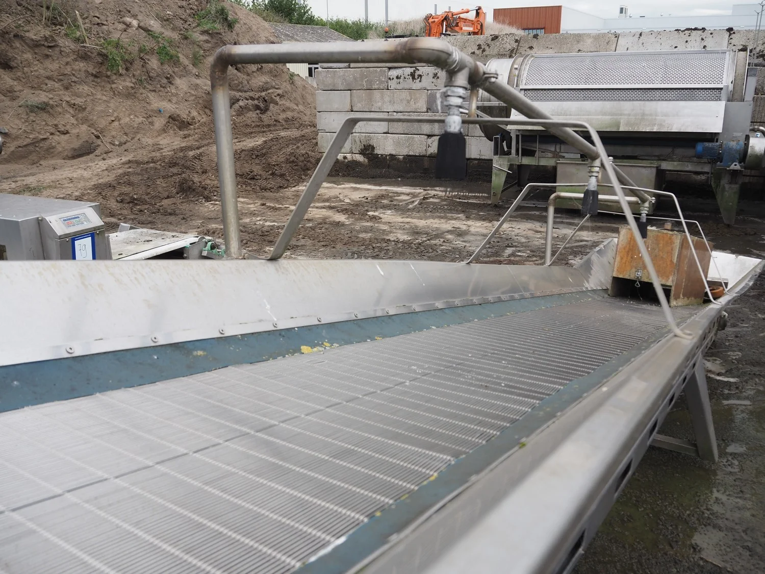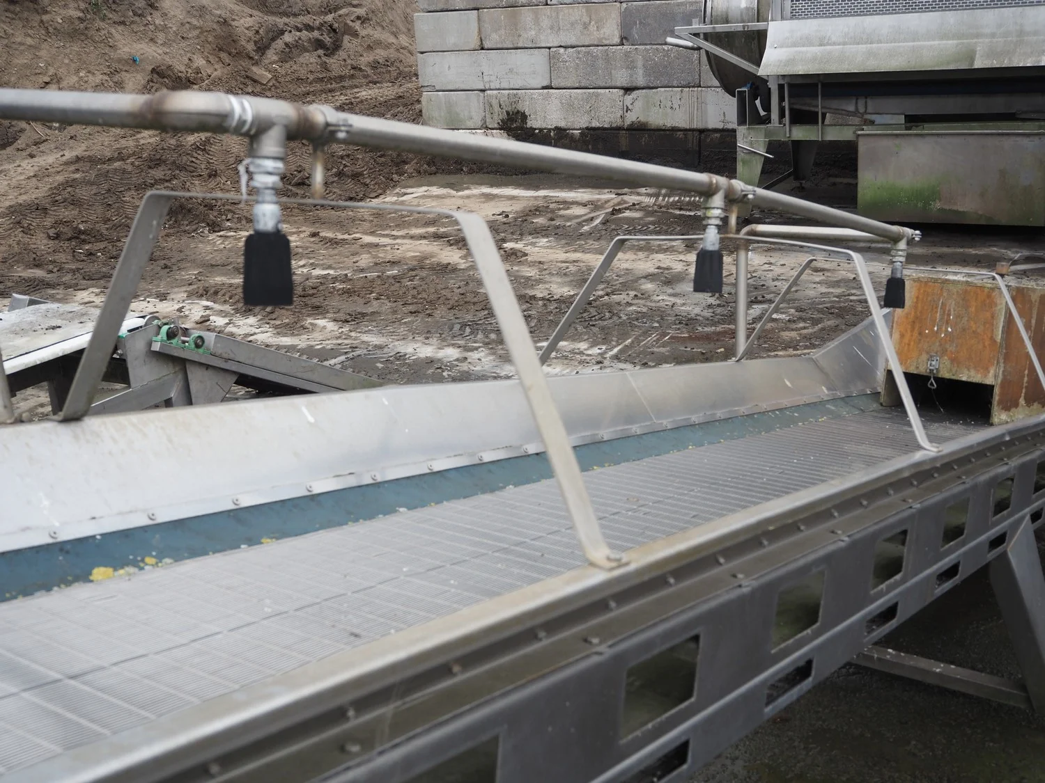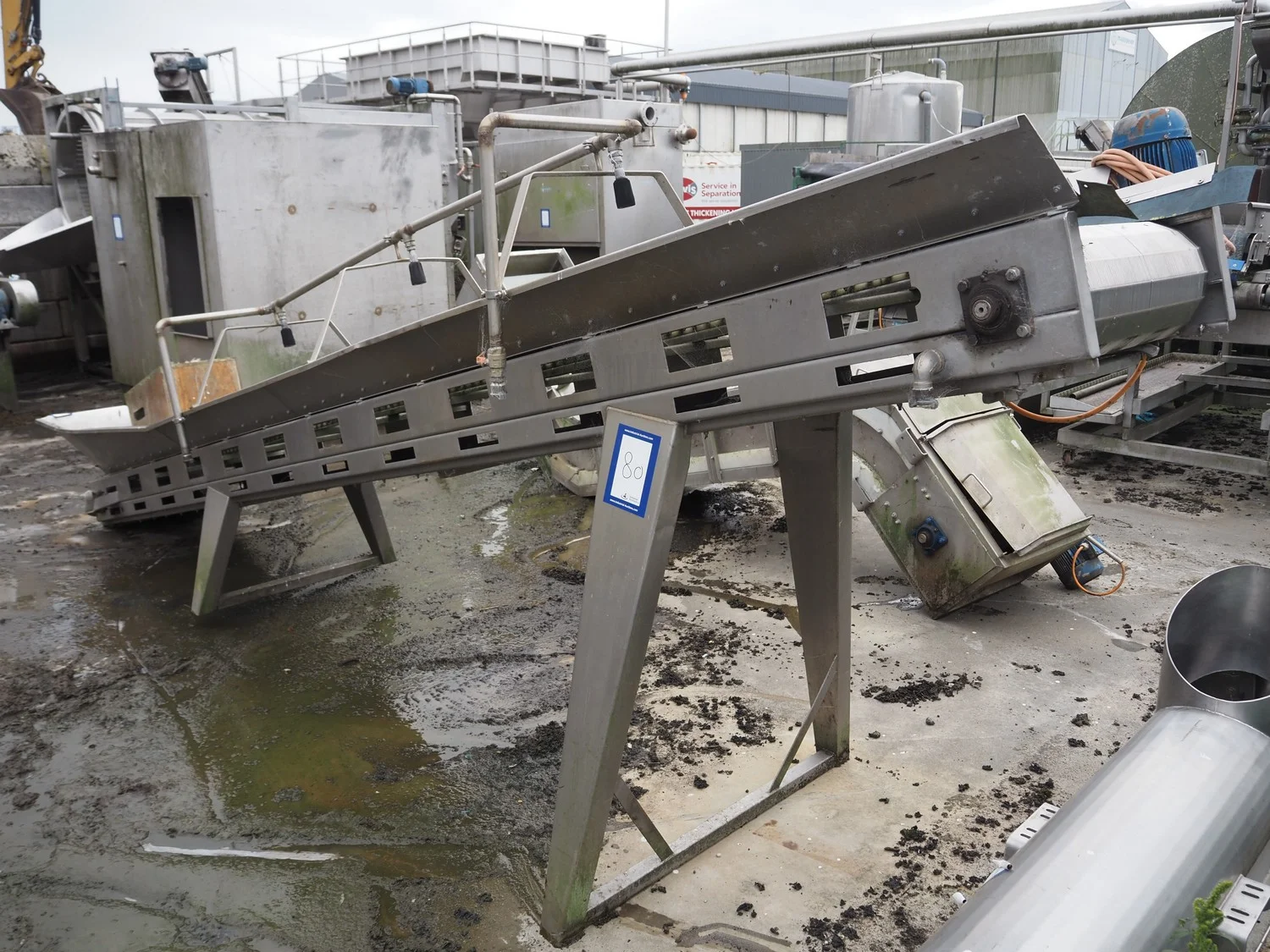 Mobile s/s sieve belt with spraying unit, belt width: 600 mm, elevating height: 2100 mm, total dimensions: 5700 mm x 1500 mm x 2600 mm.