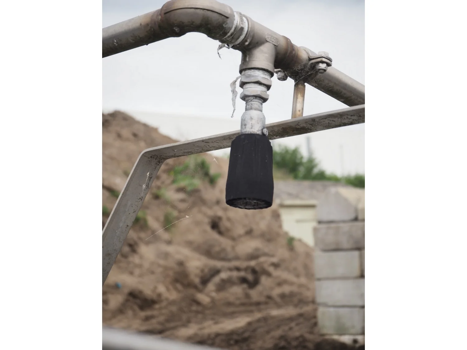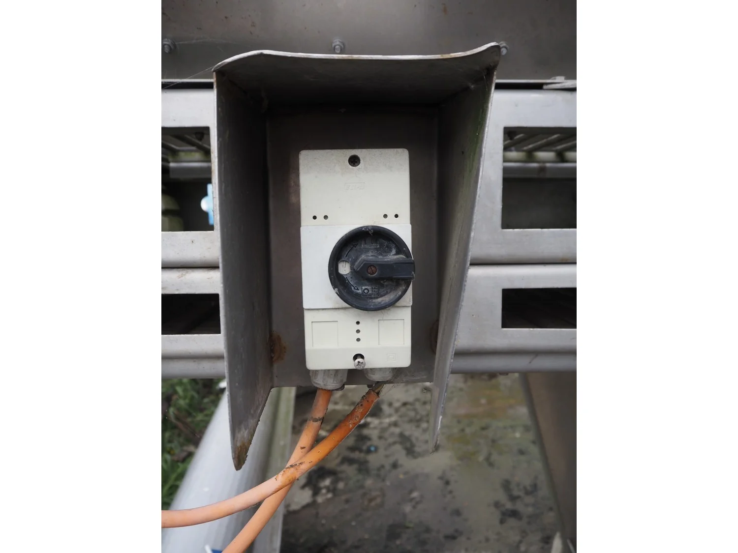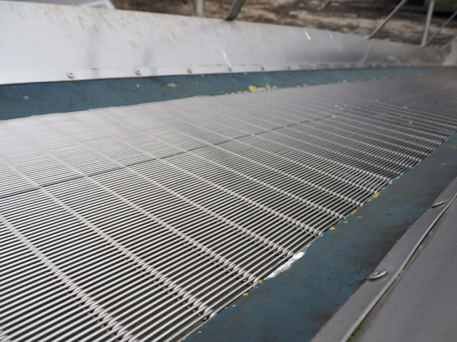 Mobile s/s sieve belt with spraying unit, belt width: 600 mm, elevating height: 2100 mm, total dimensions: 5700 mm x 1500 mm x 2600 mm.