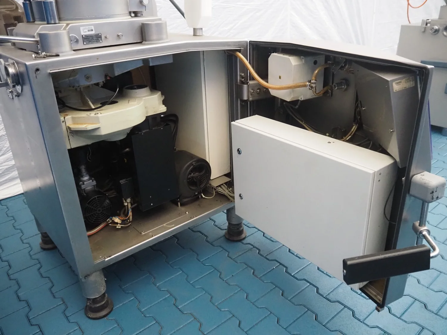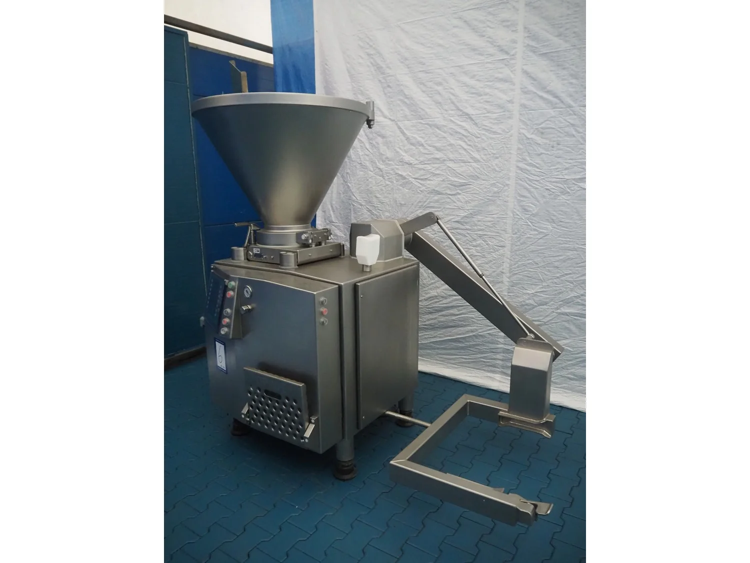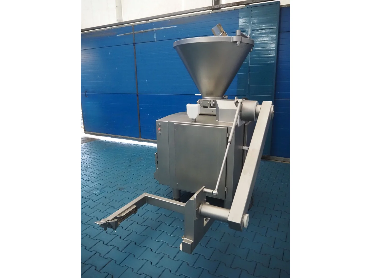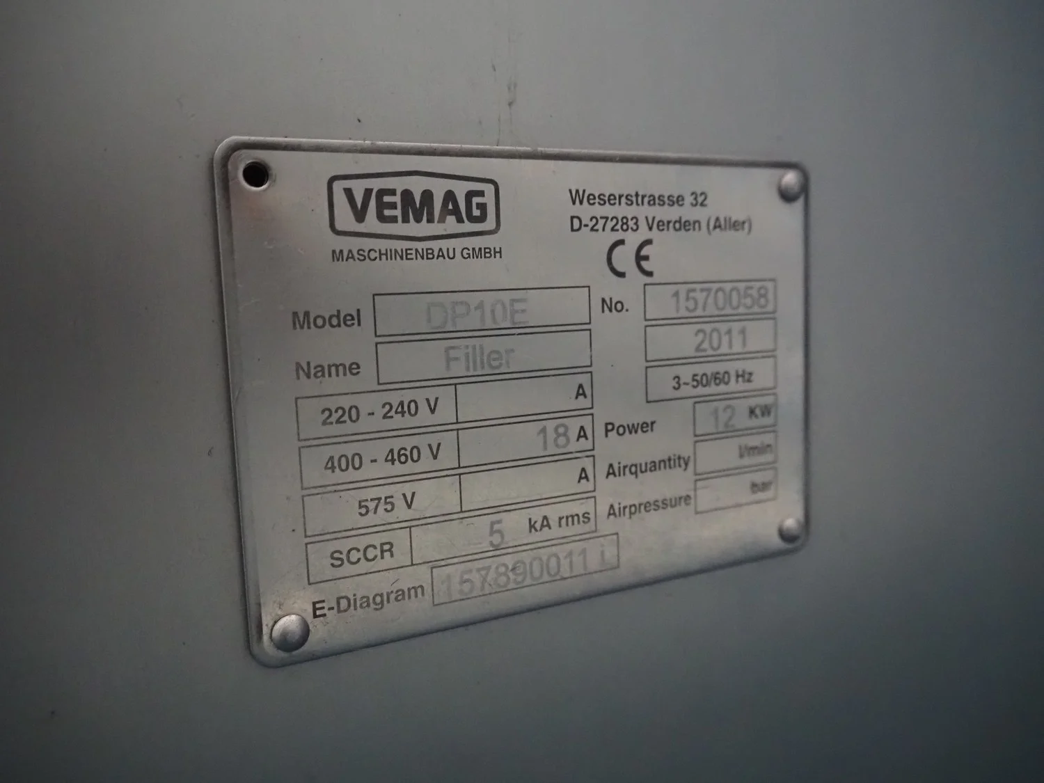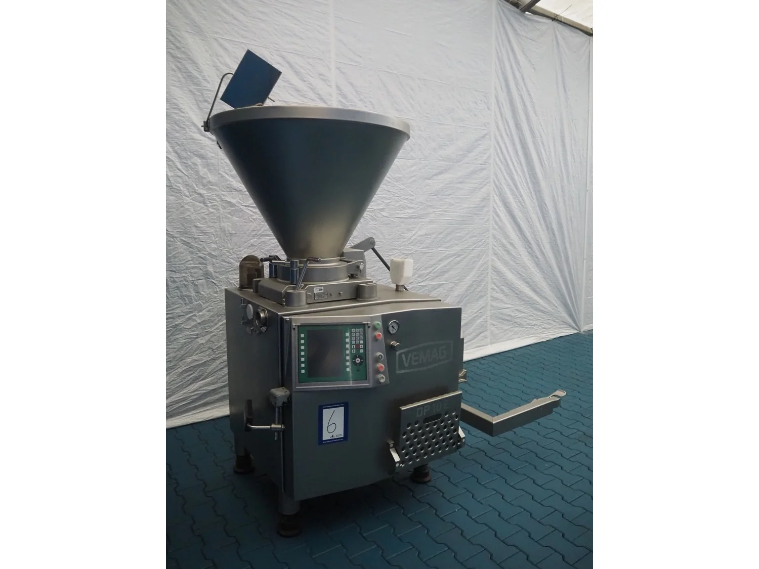 Vemag vacuum filling machine with lifter for 200 liter meat bins, model: DP10E, number: 1570058, year of construction: 2011, 400-460 V, 3 Ph, 50/60 Hz, 18 A, 12 kW, dimensions: 2050 mm x 1300 mm x 2100 mm.