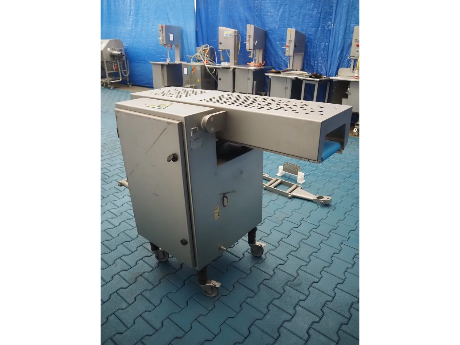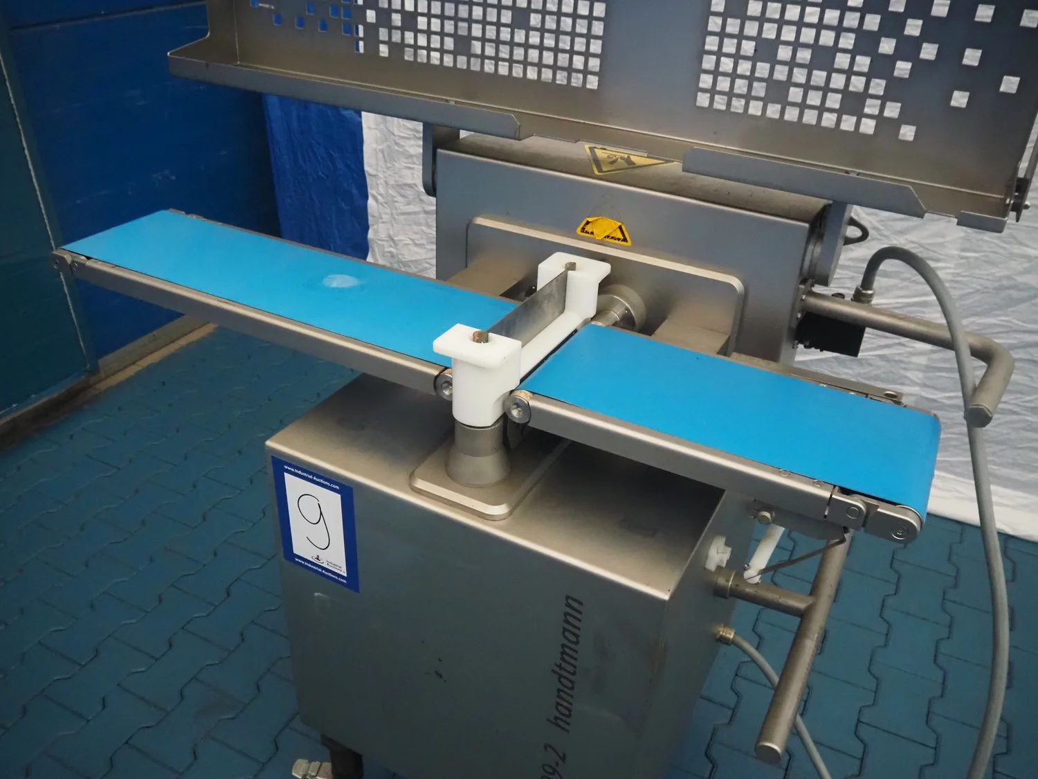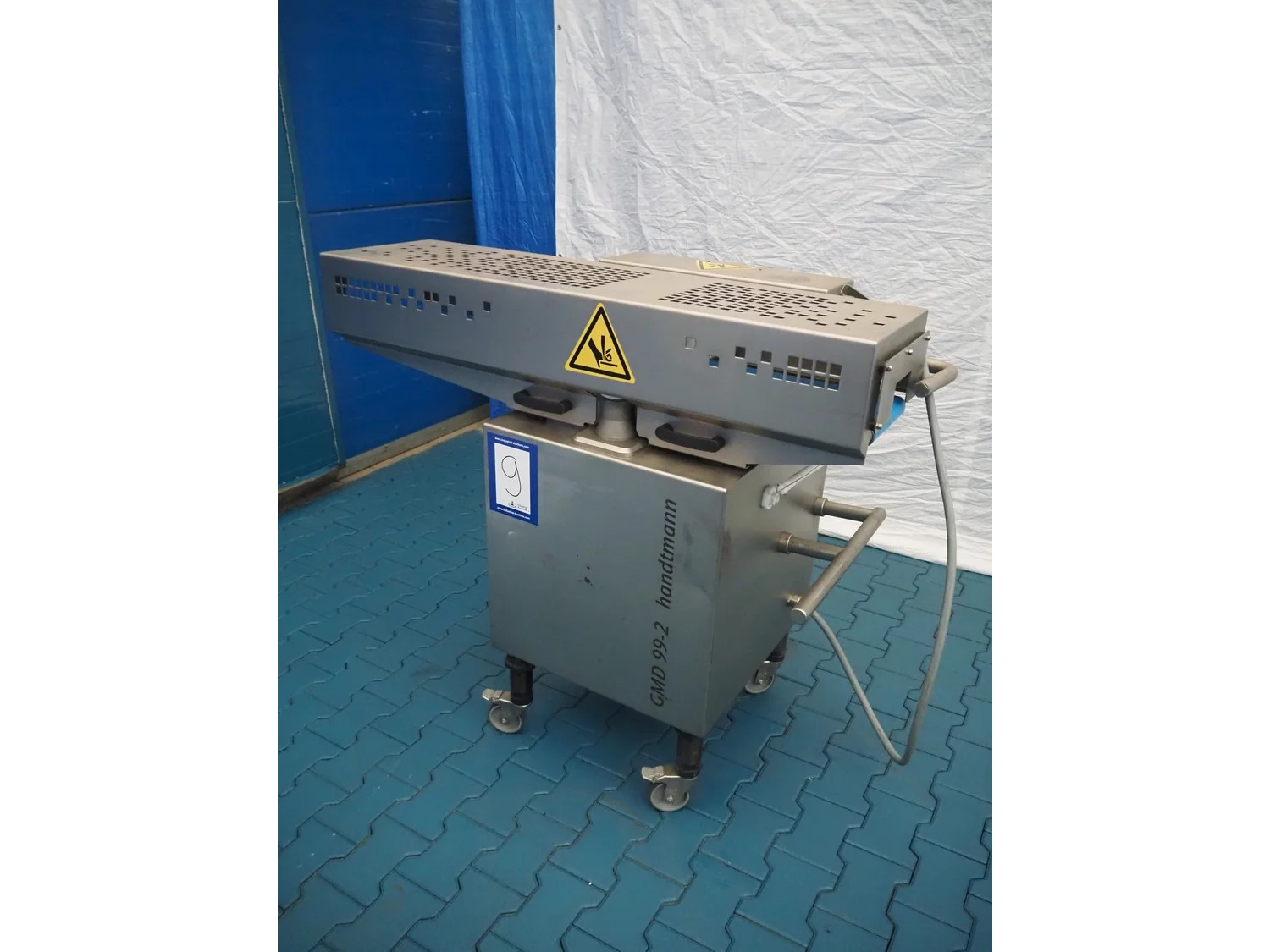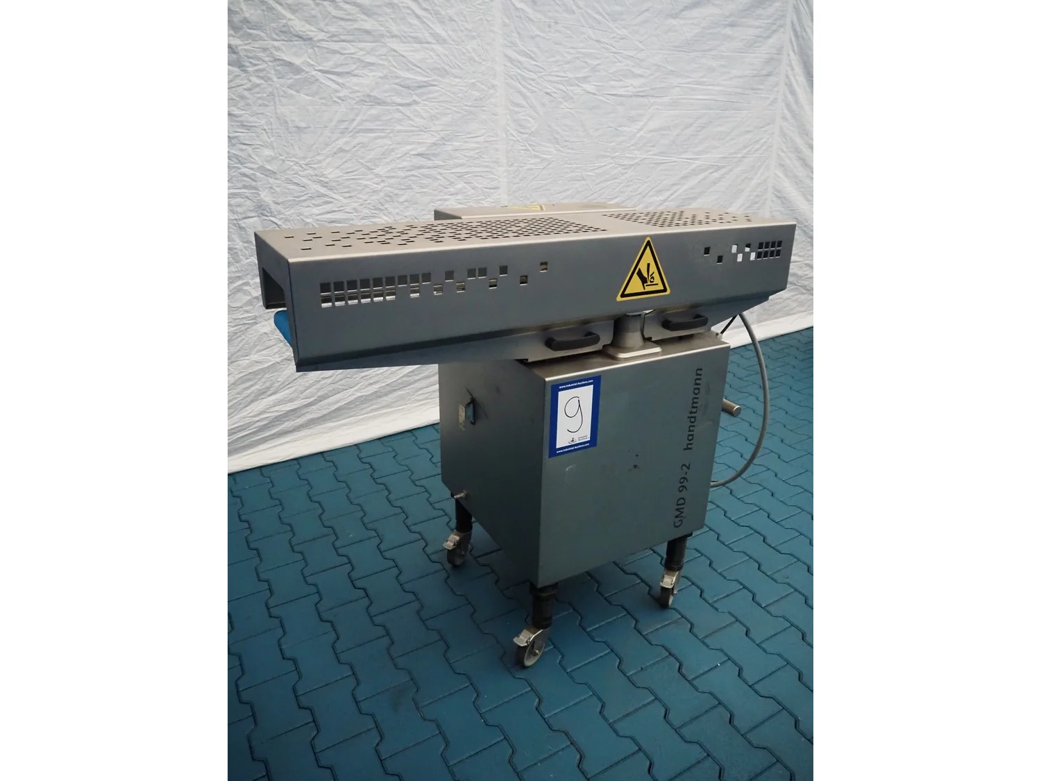 Handtmann mobile minced meat portioner, type: 99-2, number: 33909, year of construction: 2014, working width: 240 mm, plastic belt, belt width: 250 mm, total dimensions: 1380 mm x 700 mm x 1240 mm.