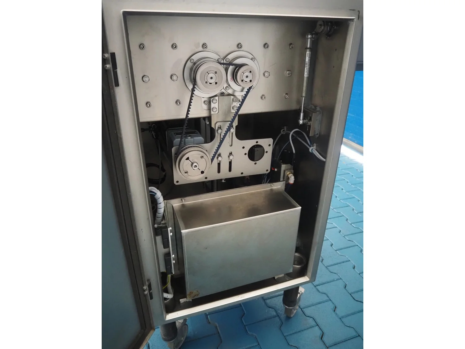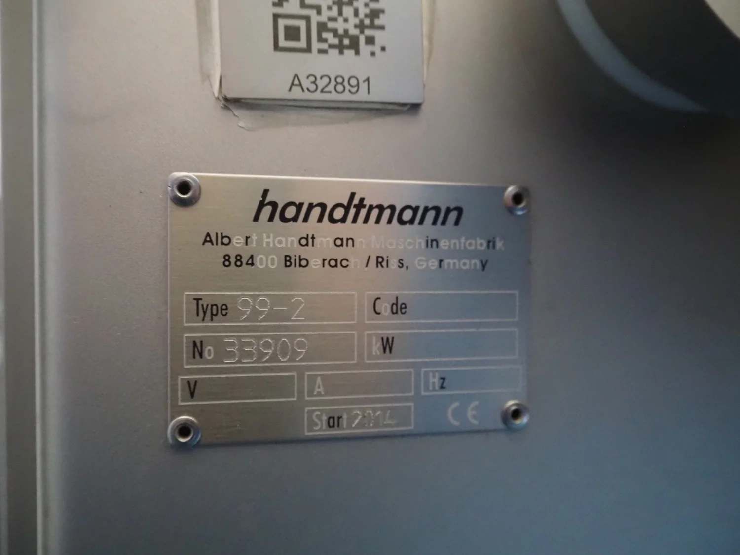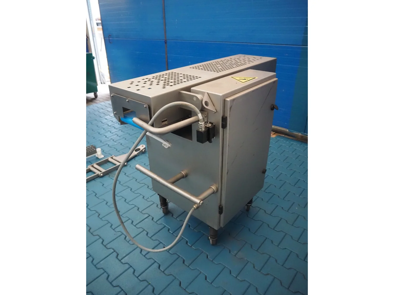 Handtmann mobile minced meat portioner, type: 99-2, number: 33909, year of construction: 2014, working width: 240 mm, plastic belt, belt width: 250 mm, total dimensions: 1380 mm x 700 mm x 1240 mm.